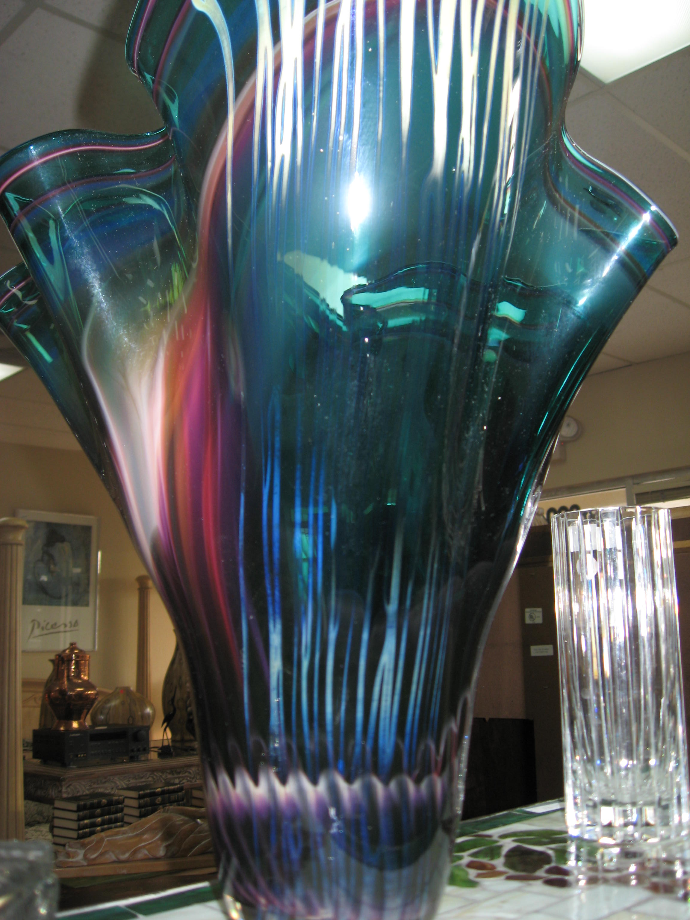 I have this beautiful piece of art glass; a flaring vase with big swirls of color. It's unmarked and would love to find out if anyone knows anything about it. Thakn you so much!
