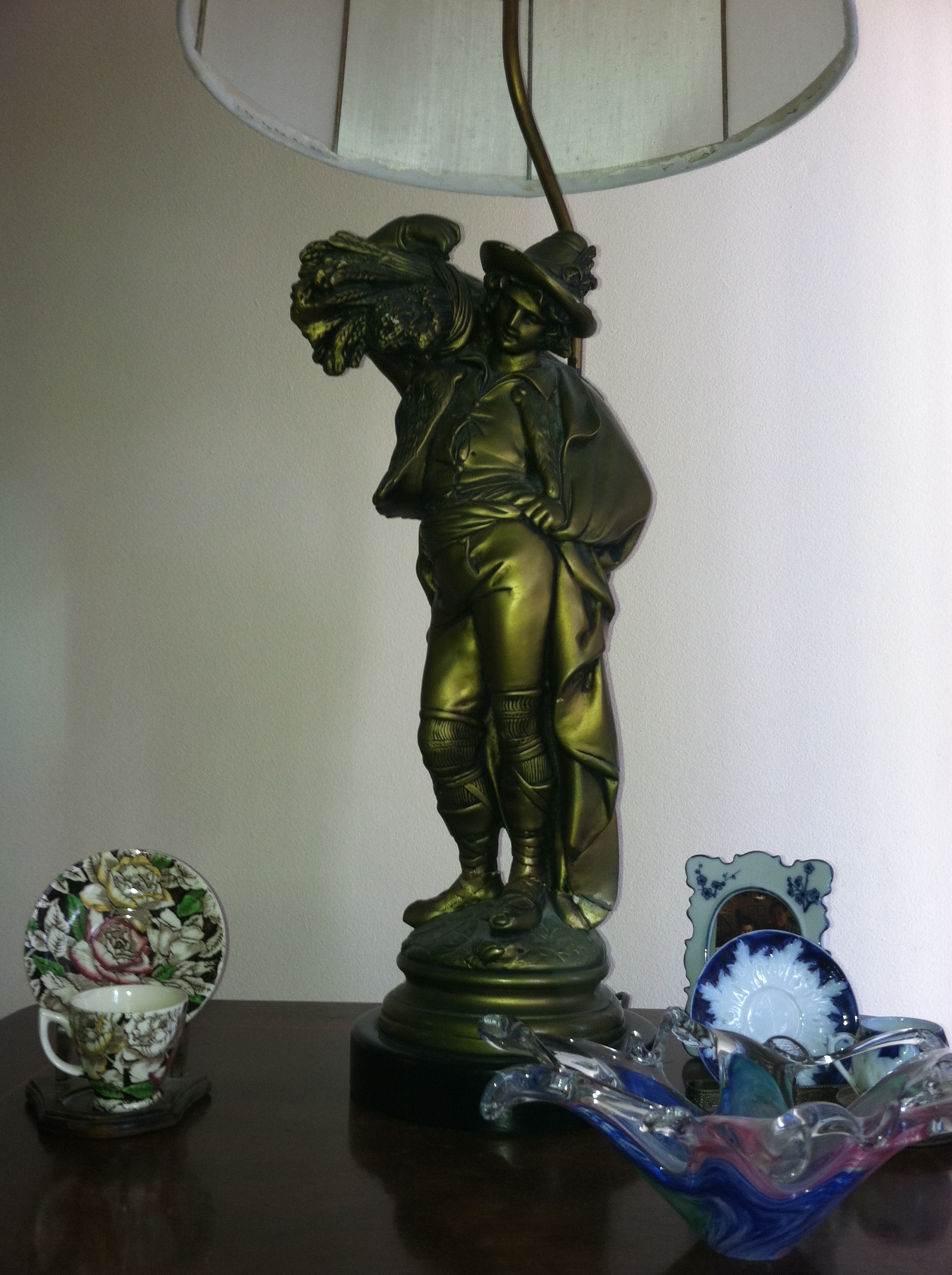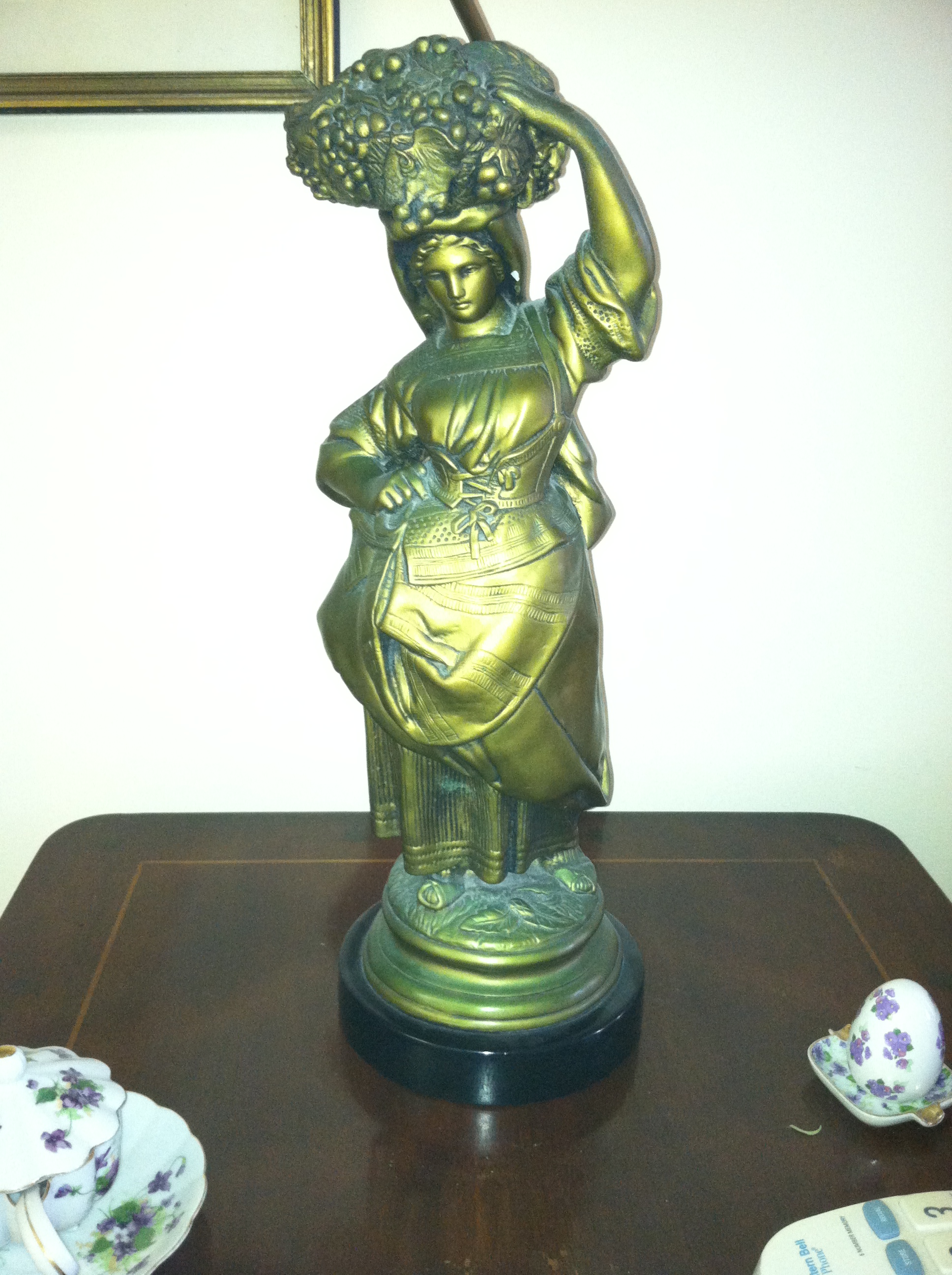 I have 2 spelter lamps that my grandmother gave me on her 100th birthday. One is a woman carrying grapes on her head and the other is a man carrying wheat (I think). His foot is cracked.  I am looking to find out what the value might be on them.