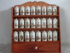 Bottom of each bottle has own number 1-16. Front spice label is decaled on and has started to wear. The back of each bottle gives a description of the spice and how to use it. The rack is rusted on the bottom; made of metal and wood. Made by The Griffith Laboratories, Chicago, Illinois