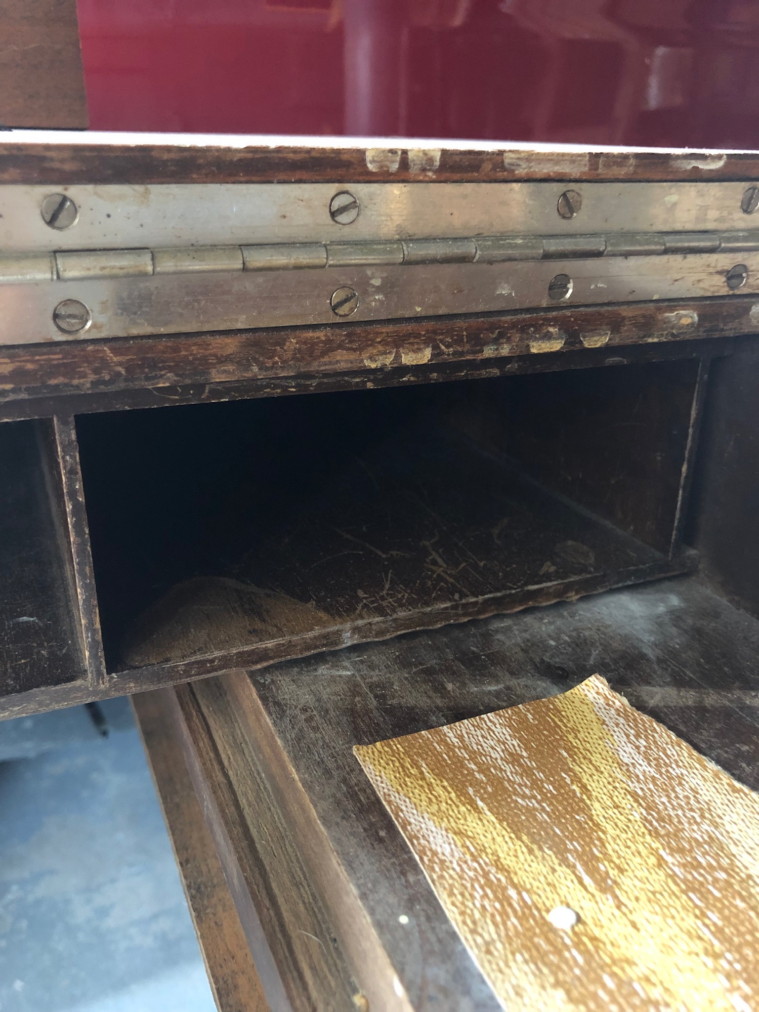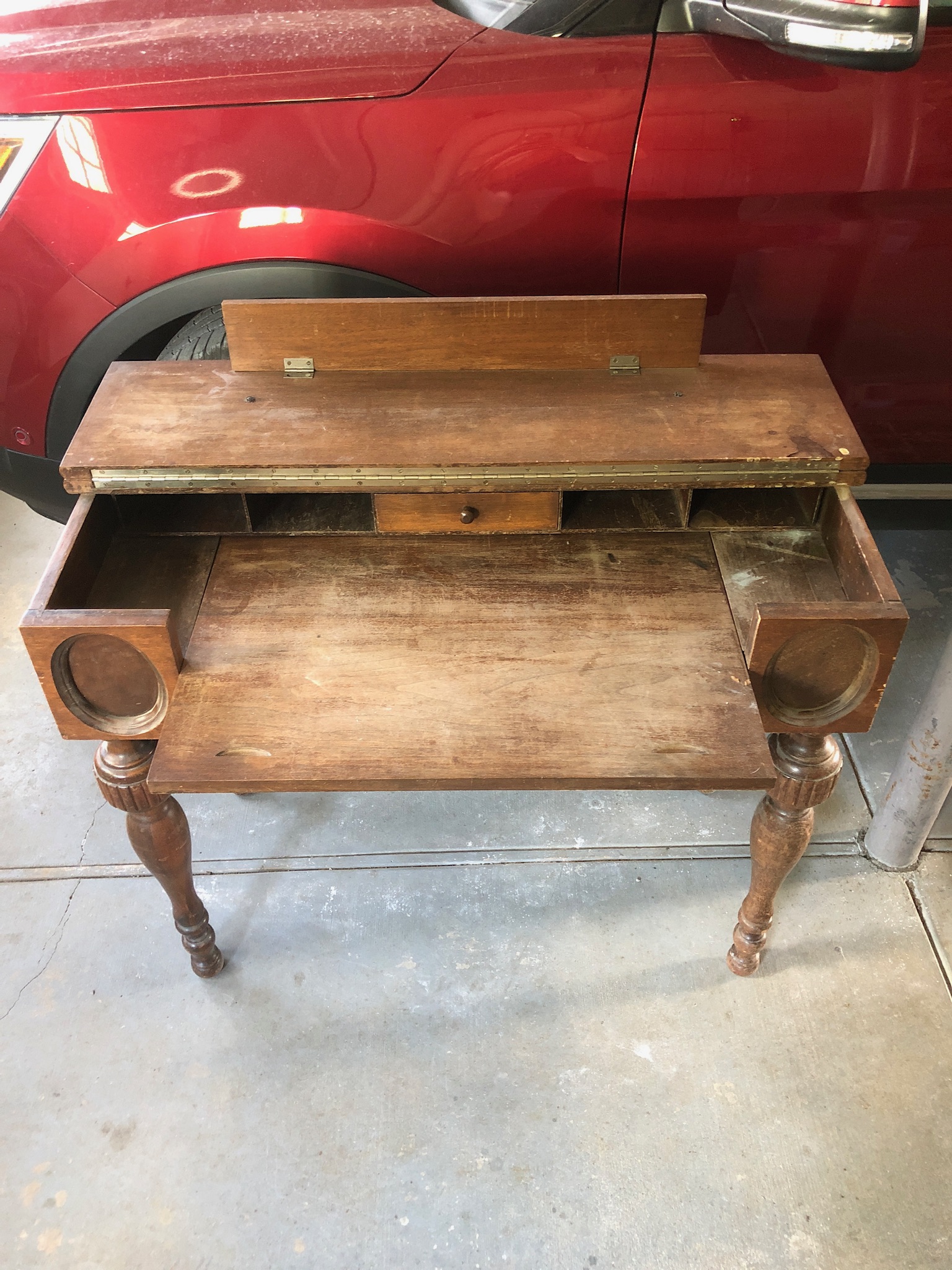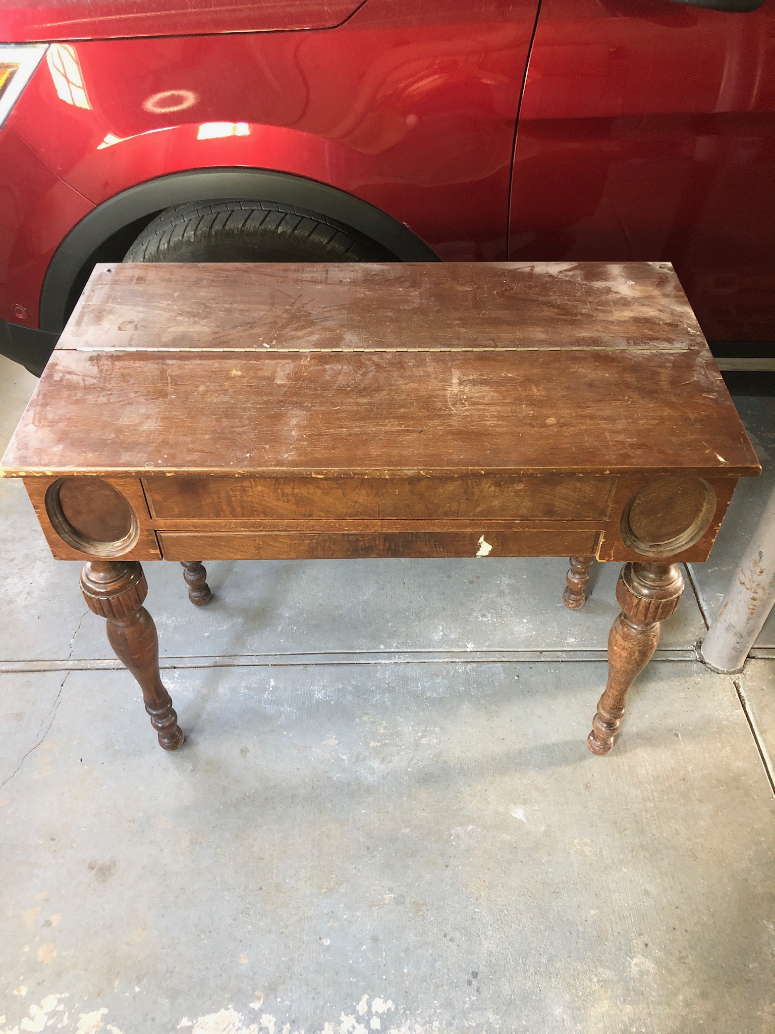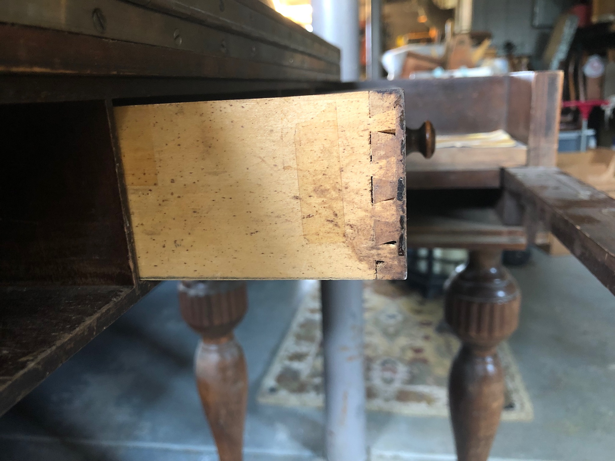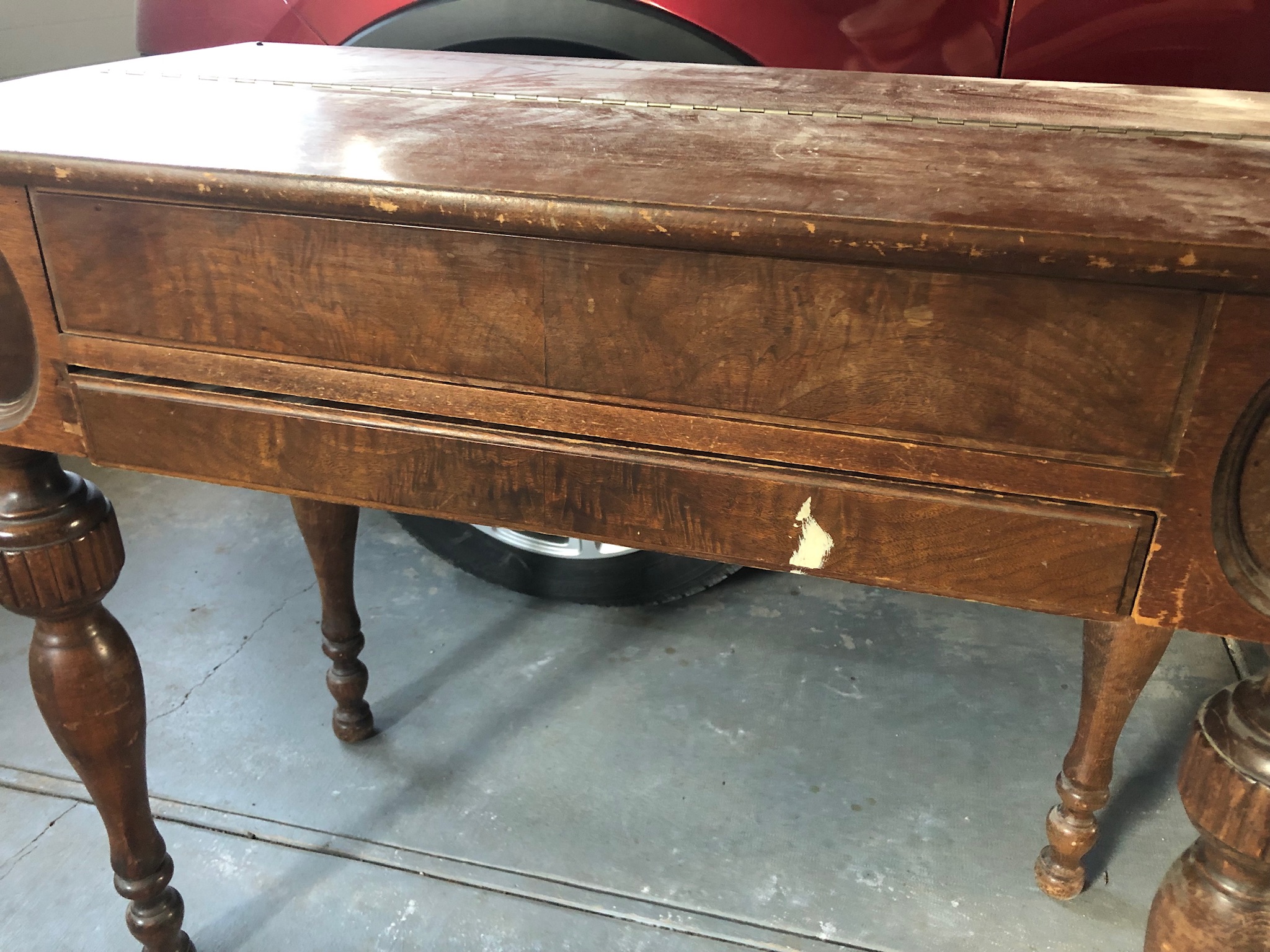 Purchased from an estate sale in very dirty conditions. My plan is to clean and restore, but am concerned about my normal cleaning methods of deglazing prior to hand sanding. The Veneer is cracked and peeled in a few areas. The joinery is dovetail on the drawers and everything else is secured with “stub tenon”. I believe it is mahogany but I’m not completely certain. I have found no makers mark. Possibly hidden underneath all the gunk.