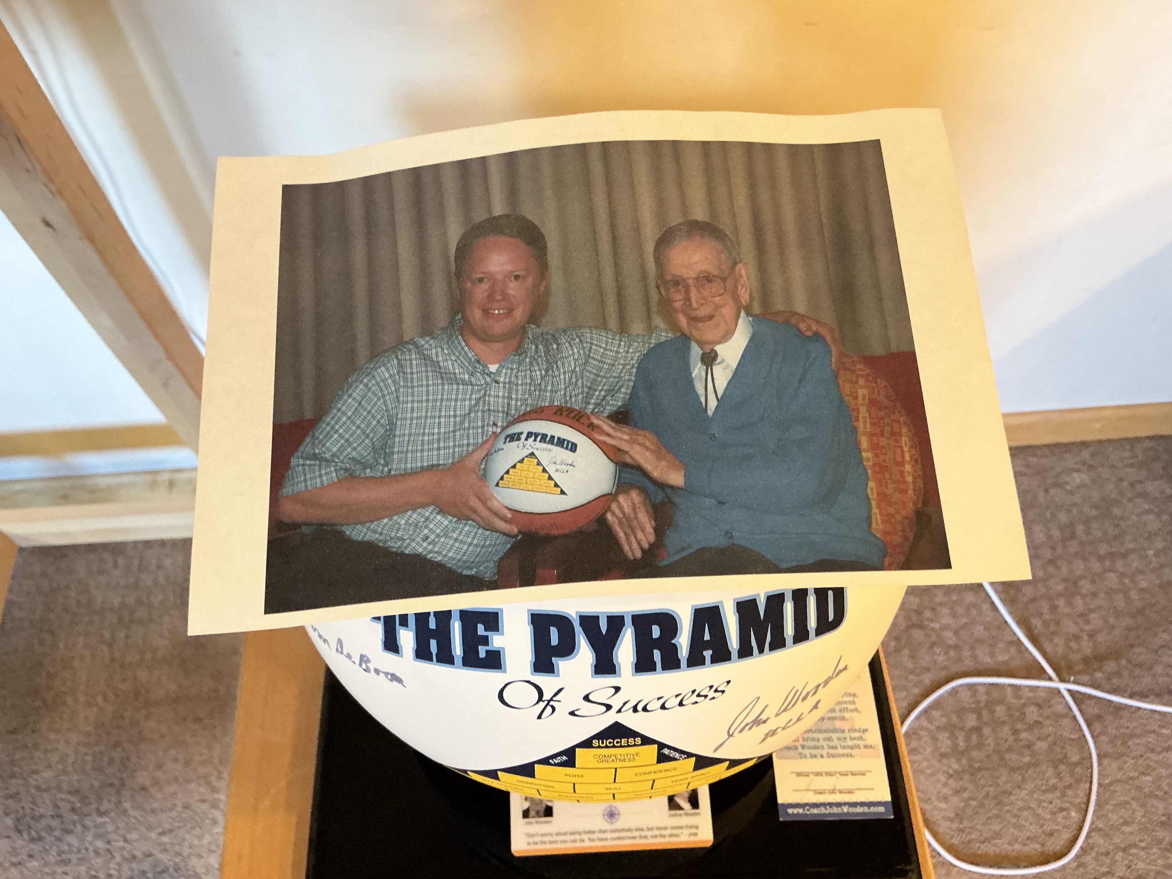 Physical Description: This is a basketball featuring the signature of John Wooden, a legendary basketball coach known for his time at UCLA. The ball is designed with a printed diagram titled "The Pyramid of Success," which outlines Wooden's principles for achieving success. The ball is encased in a protective display case, which adds to its presentation and preservation.