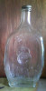 this is a neat little old whiskey (I think) bottle. It was for a brand called "The Spot". It has an array of arrows lined up at the bottom which point to an encircled bit of text that simply says "The Spot Bottle". The design is almost identical on both sides, the difference being that the arrows go up a little higher on the side where the 'federal law prohibits...' spiel. There are also circles indented on the sides of the bottle with a couple of arrows. On the base of the bottom it says "PAT APP FOR 174 12-8". I've seen quite a few different old whiskey and wine bottles on digs and cleaning out and demolishing houses (but saving and recycling the good lumber and other supplies), but I've never come across one quite this...charming I suppose you could say. It has interesting design elements all over. The height of the bottle is 7" and it is 3 1/2" wide at it's widest point along the frontside. as for time period or anything like that, I really don't know. The pictures didn't turn out super detailed because of the clear glass, but if you need something more tangible I could do a rubbing of the designs on request.