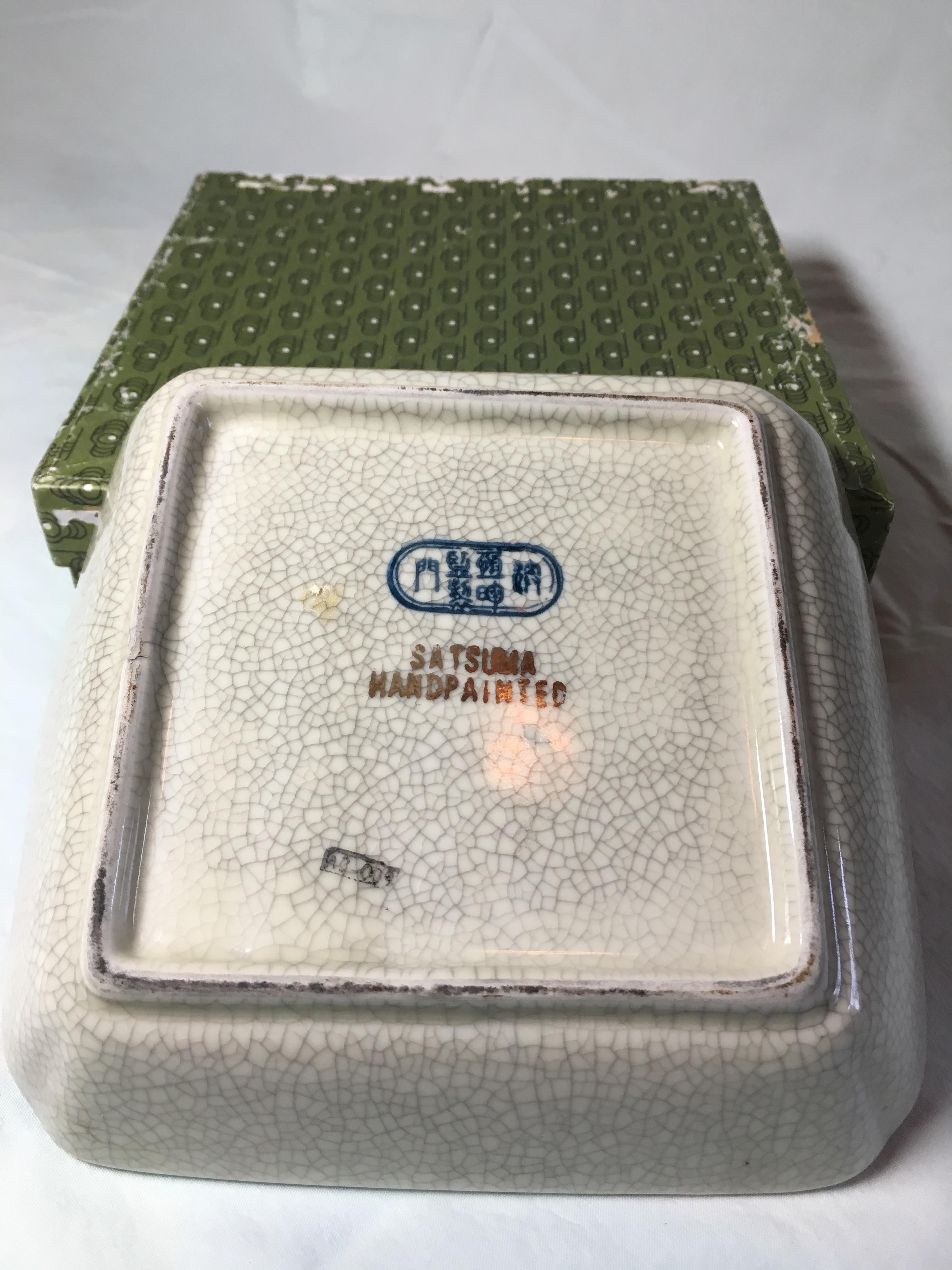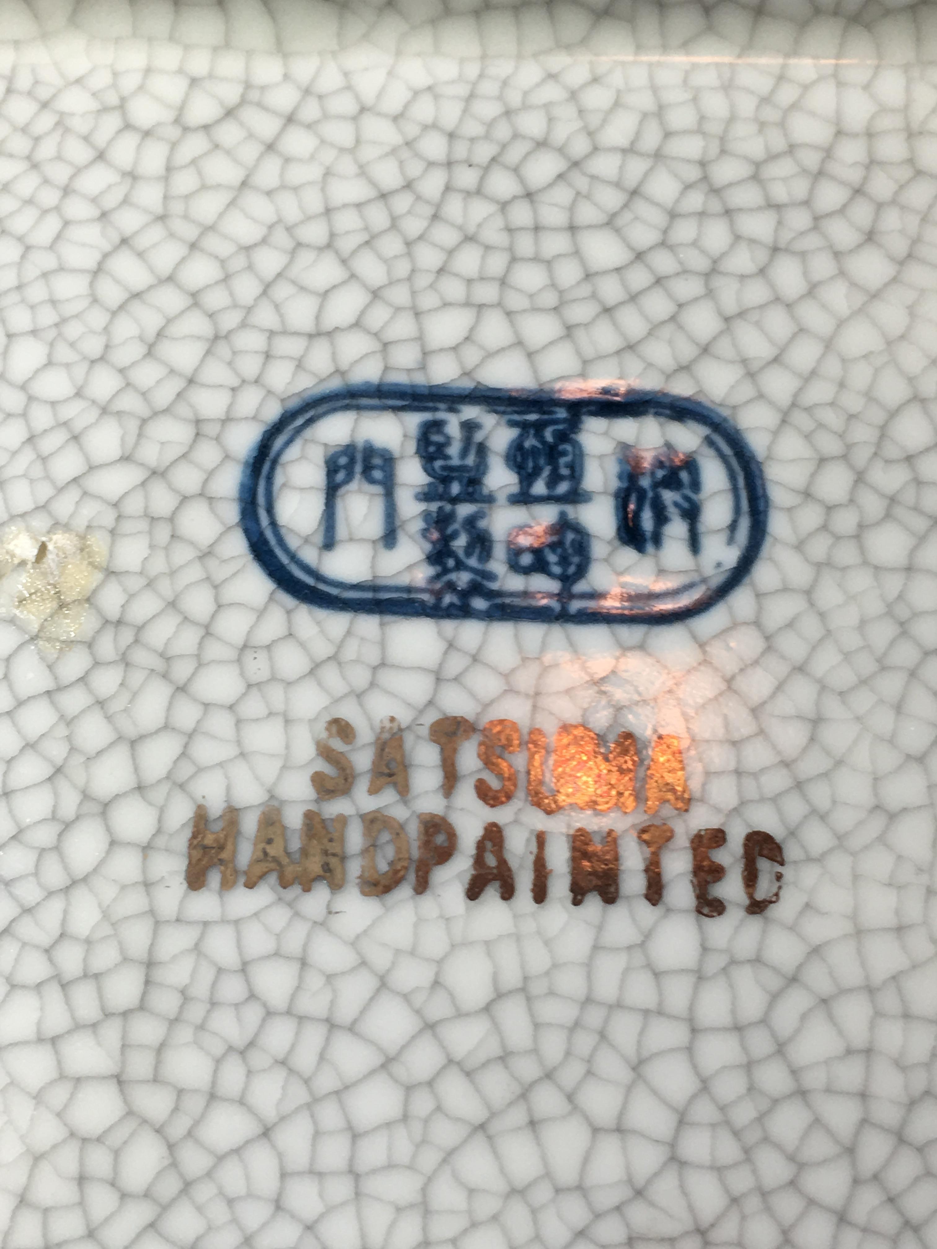Distinguishing marks Japanese characters on bottom of dish and English words "Satsuma Handpainted"