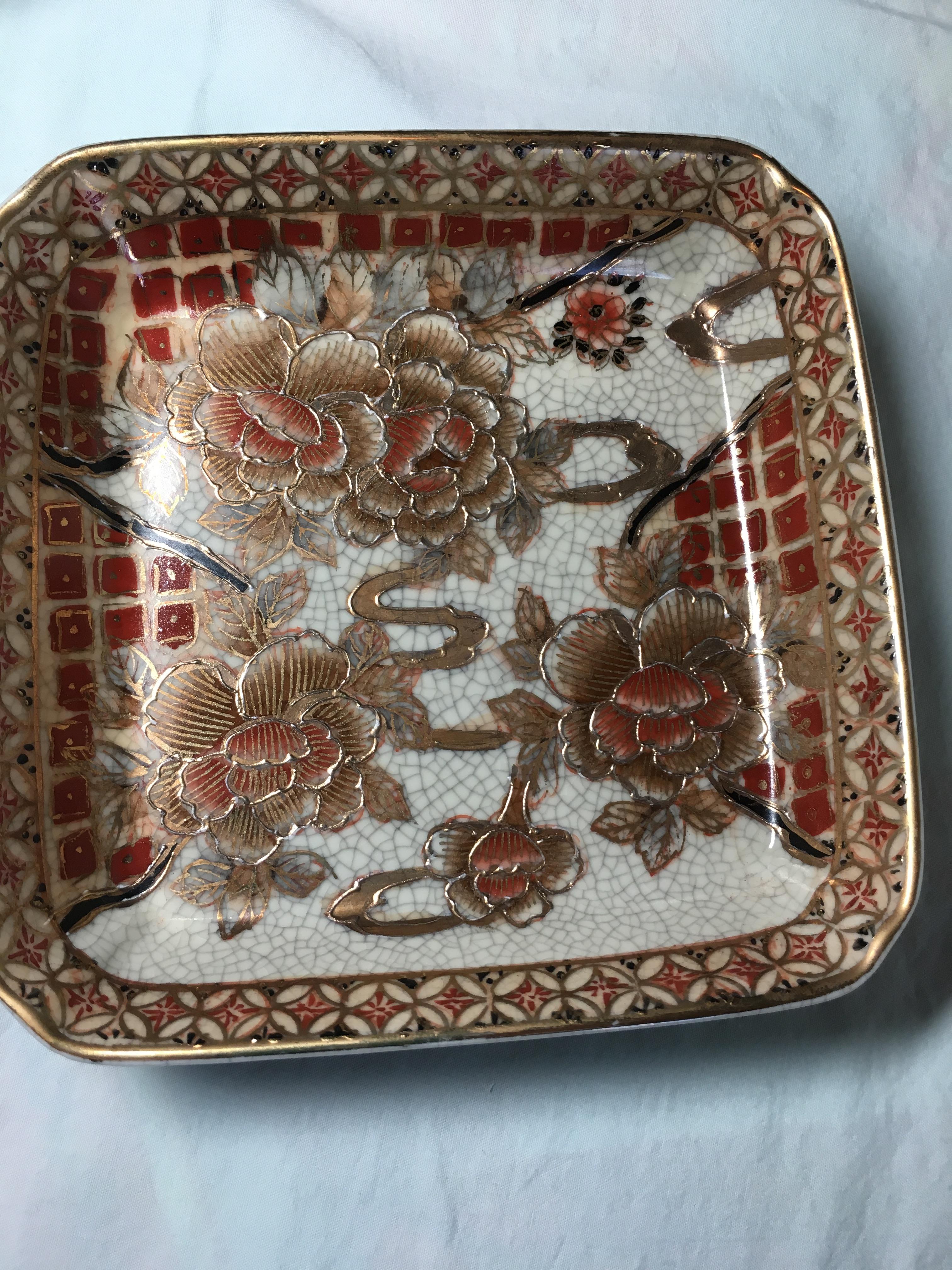 This square dish (about 4-5" across) in rust and gold is marked on the bottom with Japanese (?) characters and the words "Satsuma Handpainted".  I am fairly certain it is vintage (over 20 years old).  I wonder if it is older than that and would like more information about the source of the dish.  Thanks!!