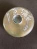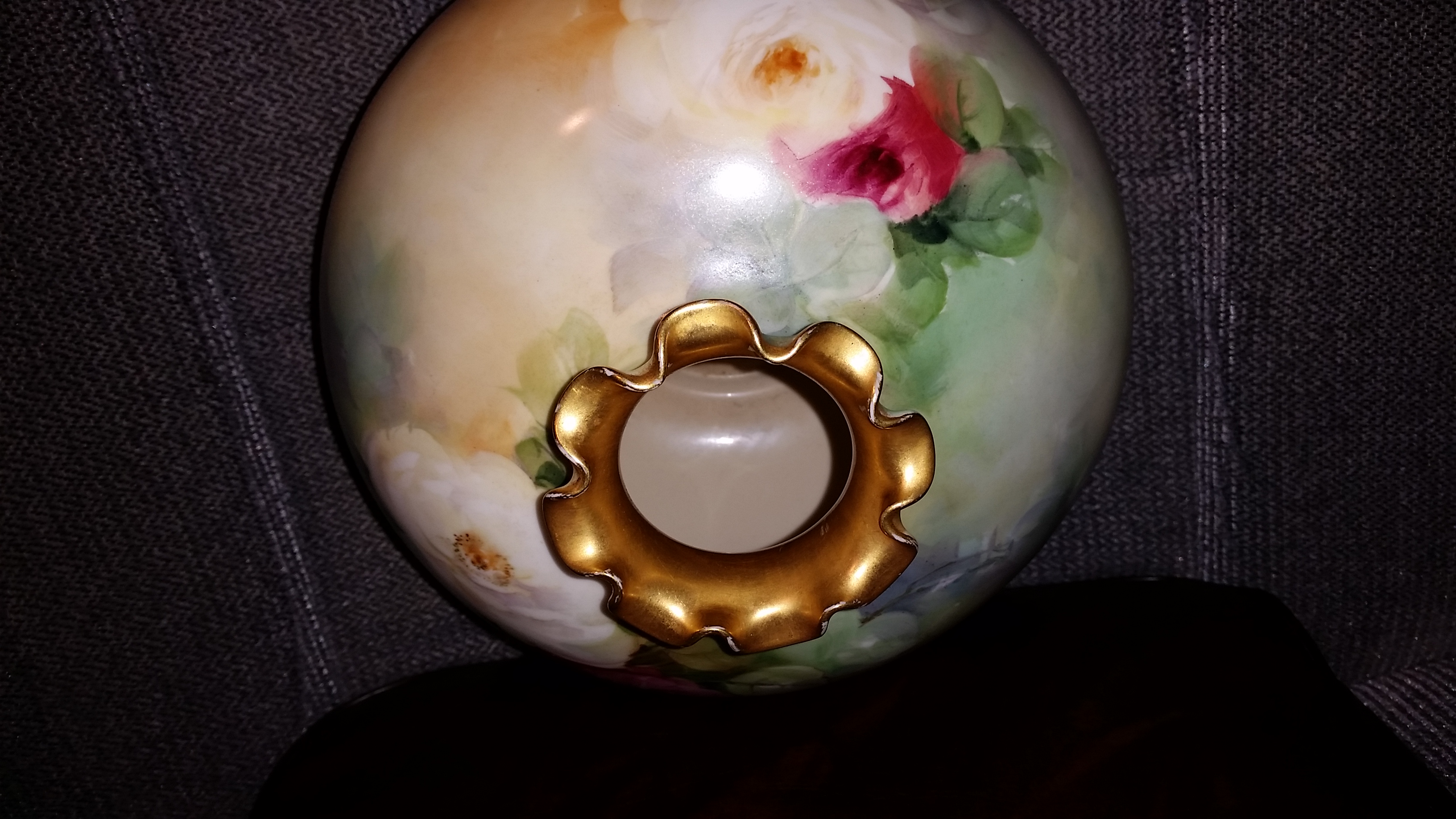 mesures 7" tall, gold ruffle neck 3 1/4 accross, base is 9 1/2 at it's widest point.
