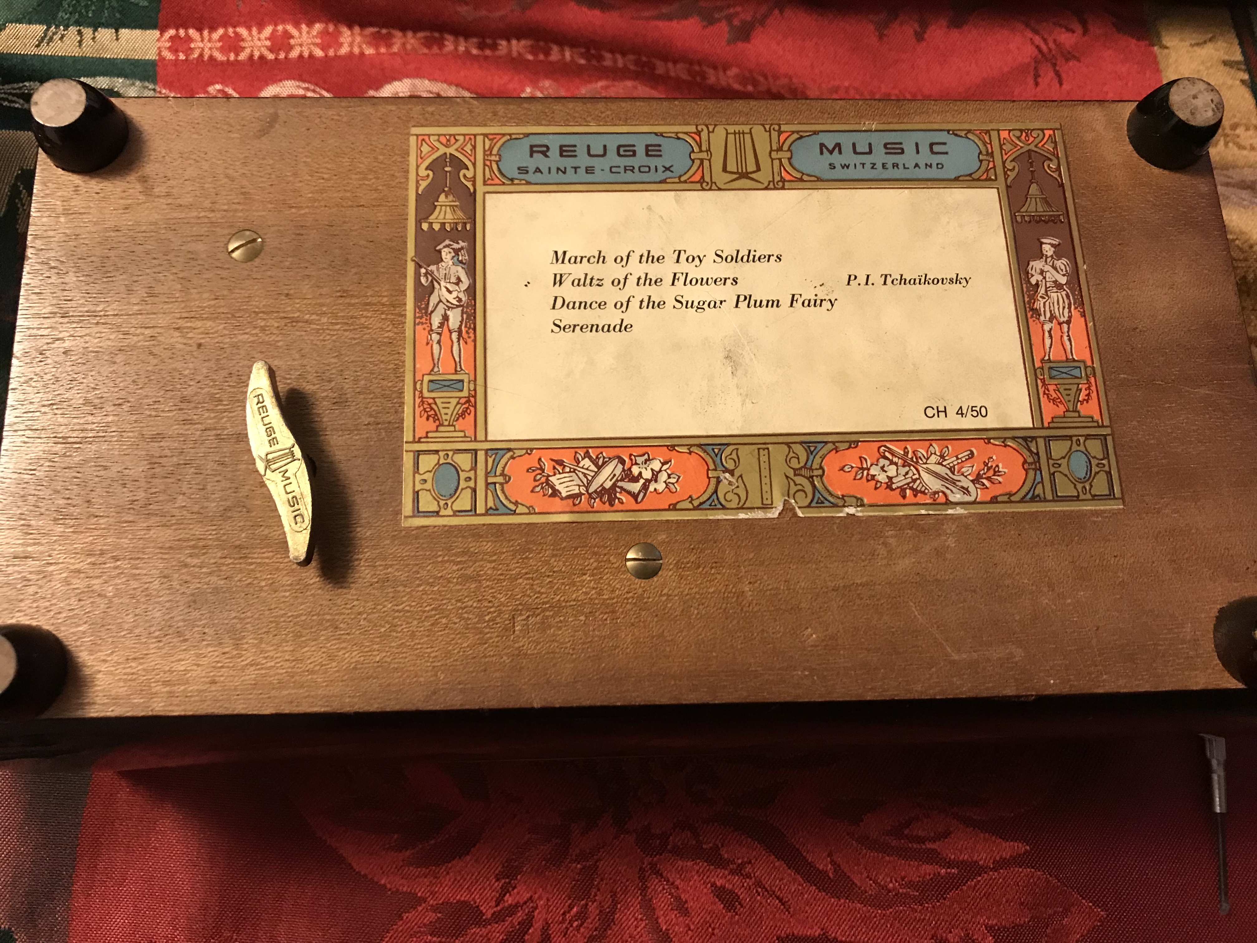 March of the Toy Soldiers, Waltz of the Flowers, Dance of the Sugar Plum Fairy and Serenade. Pyotr llyich Tchaikovsky's was the composer of these songs and the Ballet the Nutcracker was first performed in 1892. The music on this piece was from that period and connected to the sttory. I believe the 4 / 50 refers to 4 out of 50 of Tchaikovsky's pieces of music that where used on these boxes.