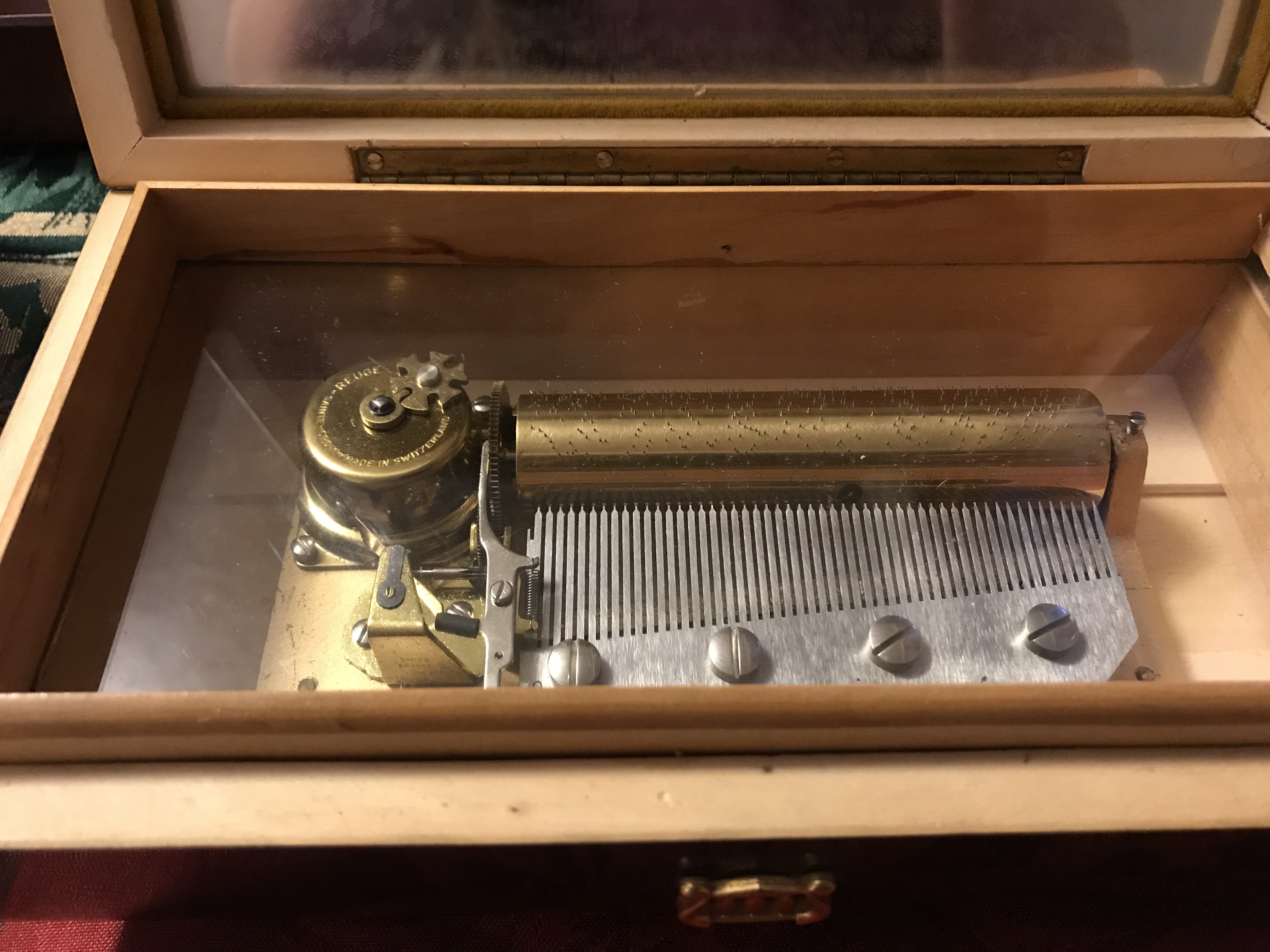 REUGE is the company that made this piece and it began in 1865 in the mountains of Switzerland, This company is famous for pocket watches, music boxes and mechanical pieces that are moved by the movement within the piece, Some of these pieces are very collectable and valuable. The 72 Key Play Polonaise has the ability to play 4 songs as listed on the label on this box. This was a cool thing when many other pieces played one tune ...