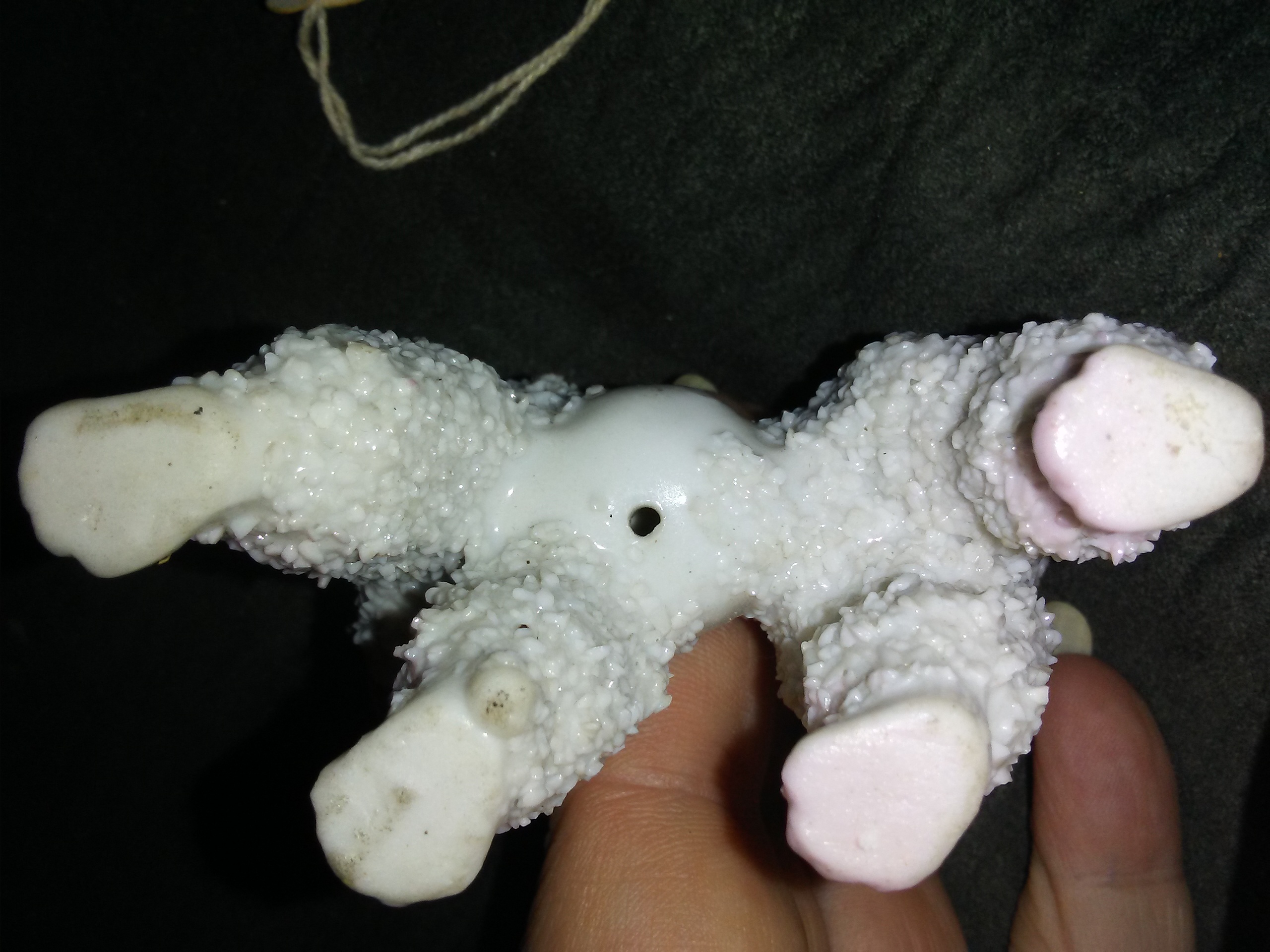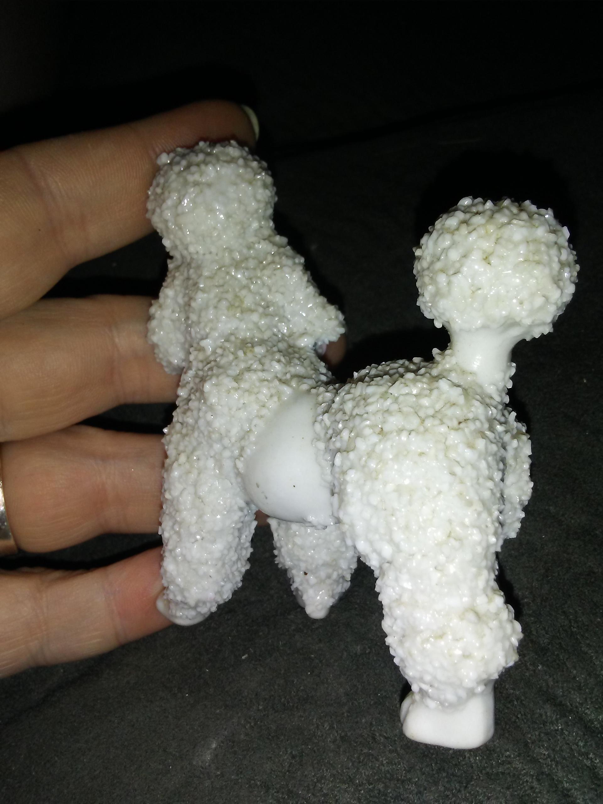 This is a Staffordchire porcelain poodle. I'm wanting to get it appraised.it is white with 2 pink flowers under the chin with gold in the center of the flowers. Stands on all 4 legs. It has a puff on the top of its head. Mostly rough with a few smooth surfaces. Eyes are gold and black. Its mostly white with some pink around its feet.