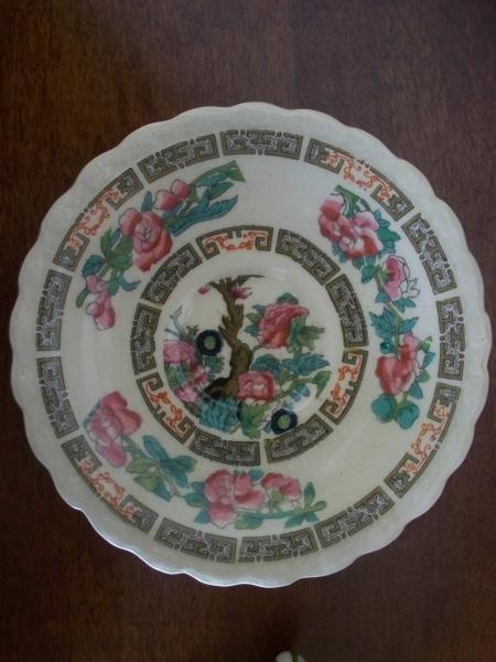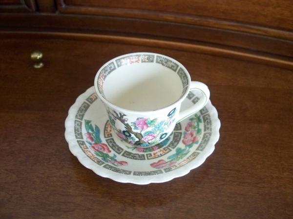 Set of 4 Royal Crown Myott's Staffordshire England small teacups and saucers. With a painting of pink flowers on a tree. There is no date. There are no cracks in either the teacups or the saucers. There is a stamping on the bottom that has a crown and then encircled is the word Myotts and Royal Crown is stamped in the encircling of this word.