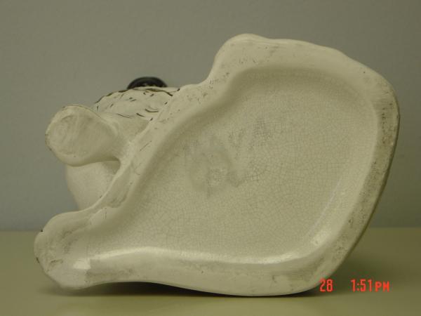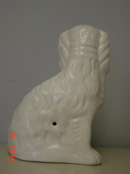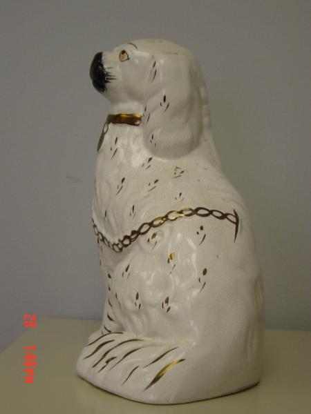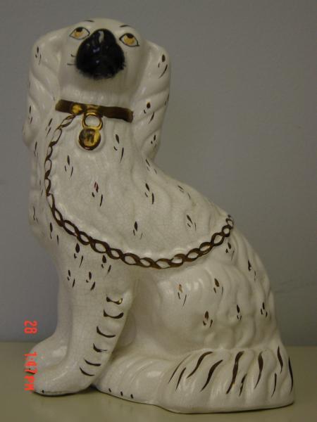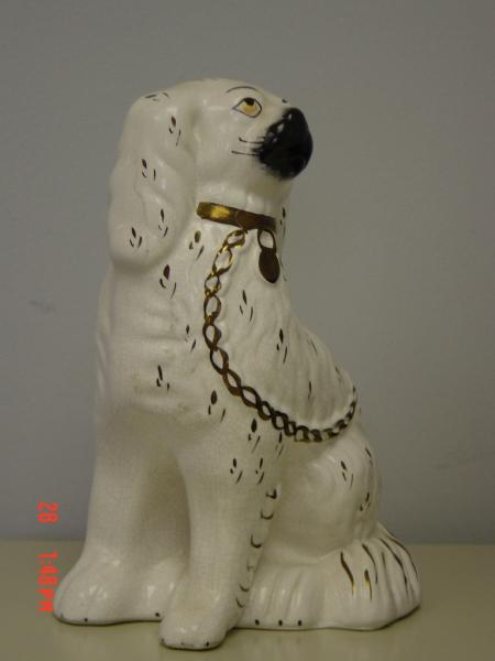 I have the pair. The other dog looks exactly the same as the pictures below. There are no nicks or scratches. White porcelain dog with gold chain collar. Has gold accents on front. Small hole in back. No markings. There are little black lines all over the dog (kinda looks like it's cracked but it's not cracked). The front leg is seperated from the body. I want to know if this pair are original Staffordshire dogs or if it's a replica and how much is it worth. If any can answer these questions or knows anything about the history please e-mail me. Thanks Maya