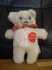 A male and female teddy bear figurine. Both have hats on and they are sitting on a blue pedestal.