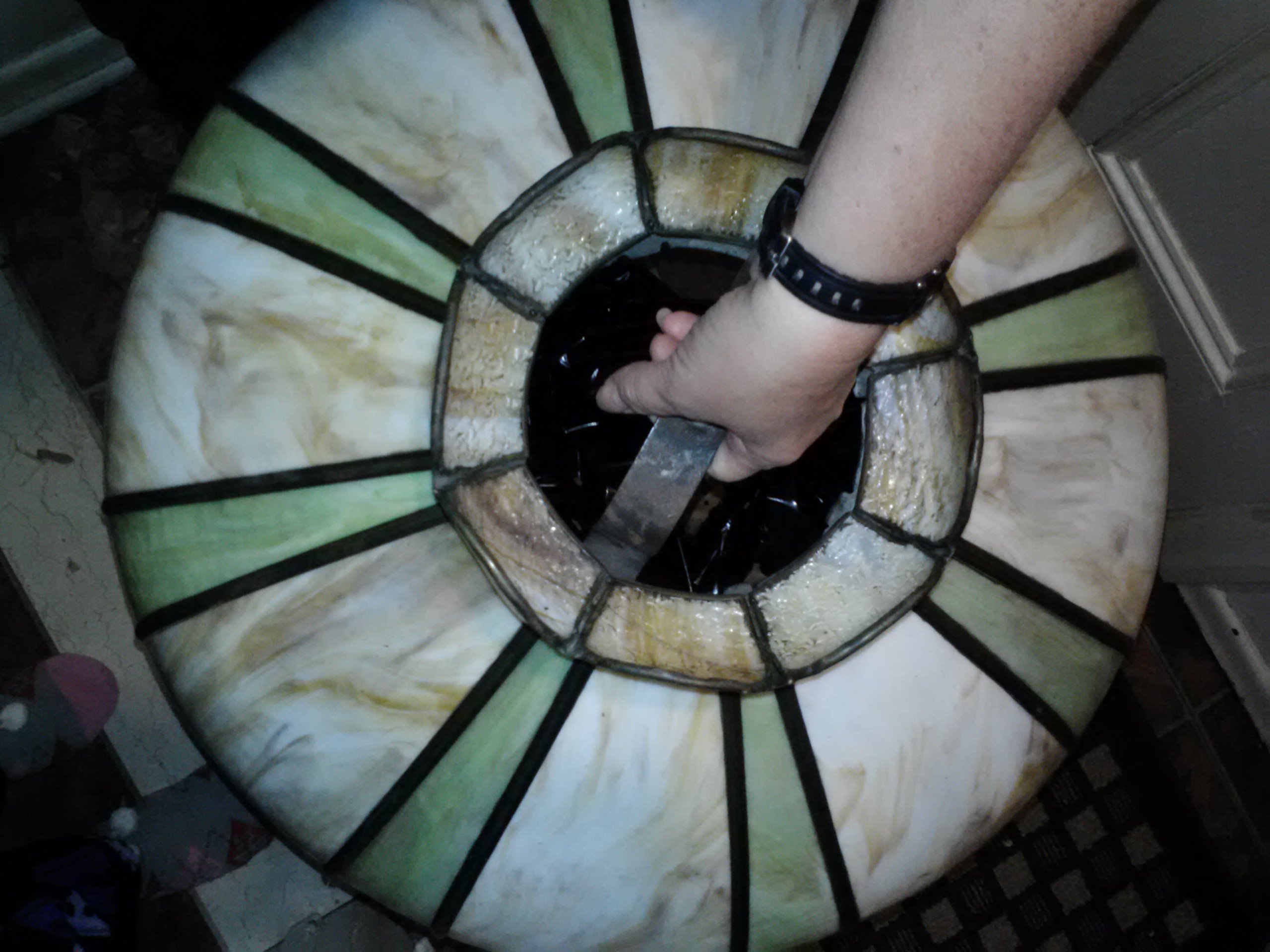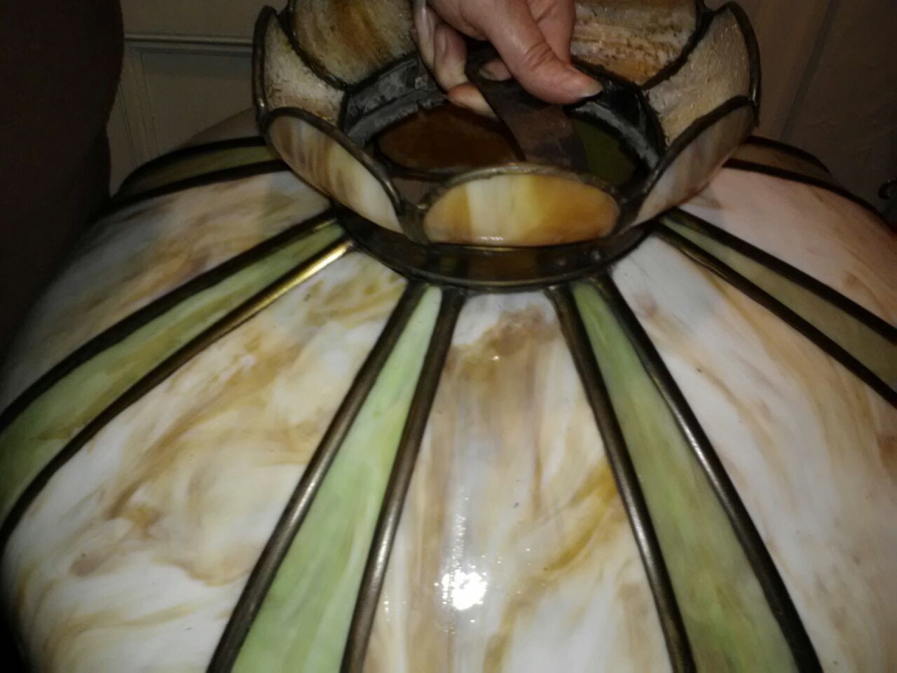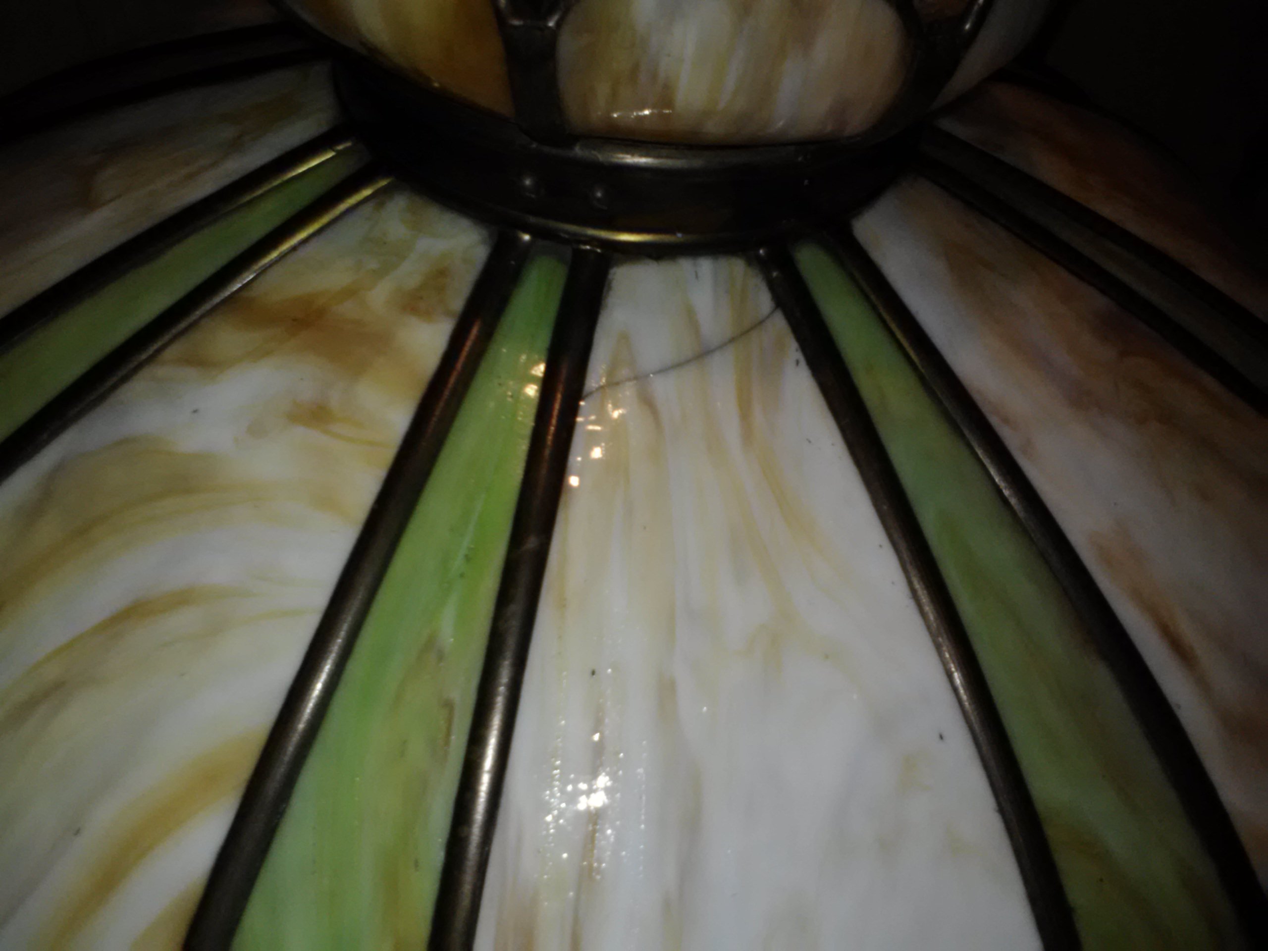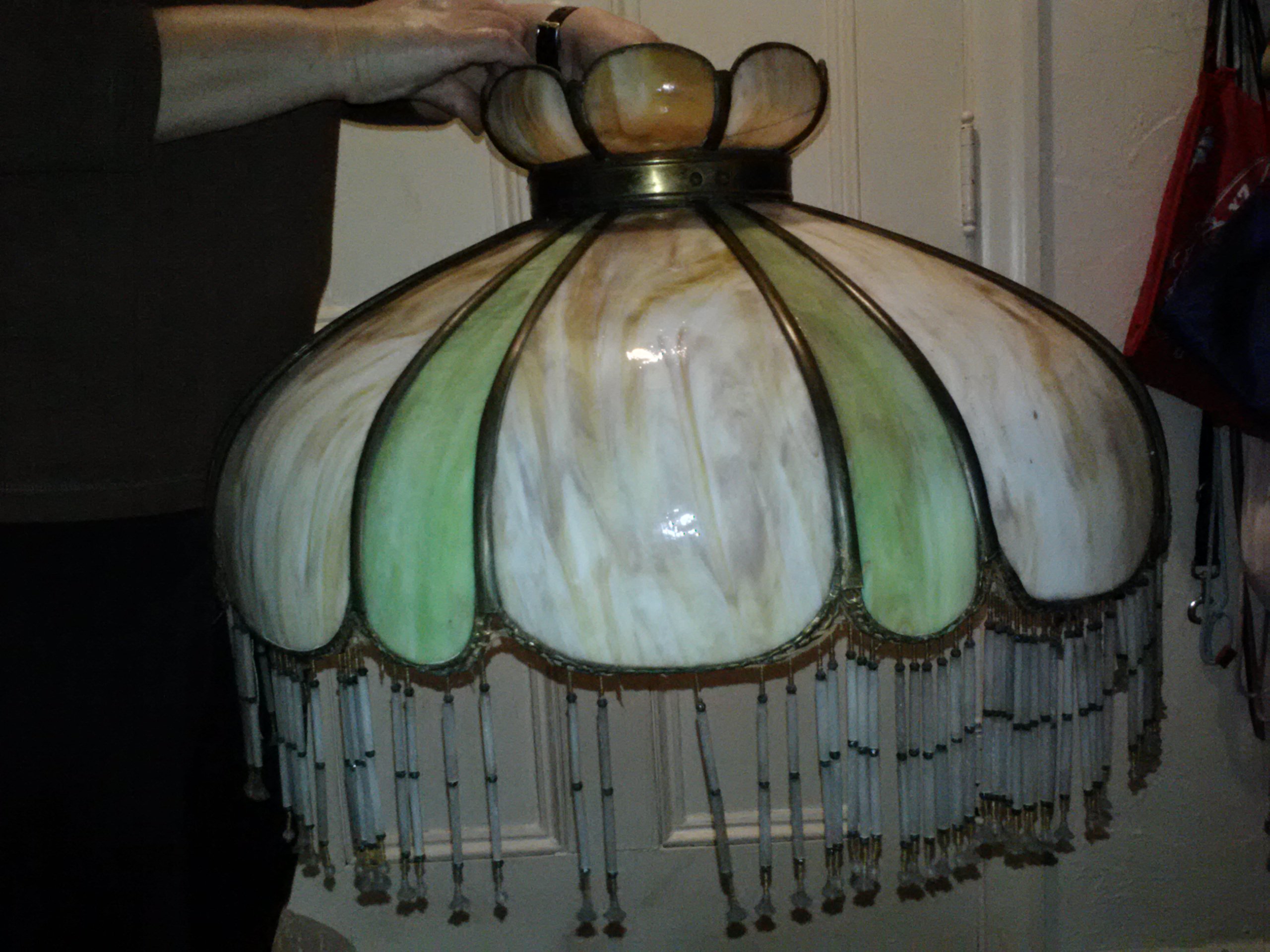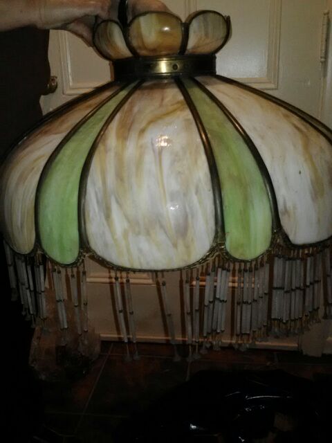 Green & beige, stained glass, beaded fringe on bottom. (most has fallen off) Dates back older than 1933. 2 cracks but otherwise in very good shape