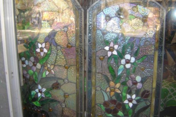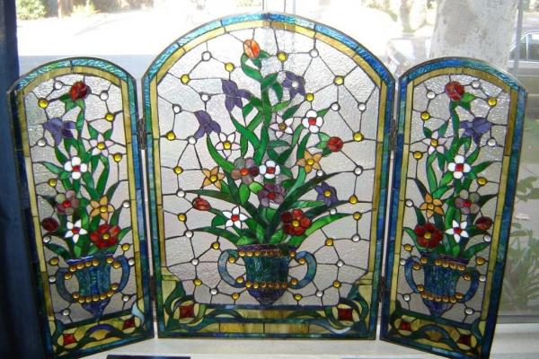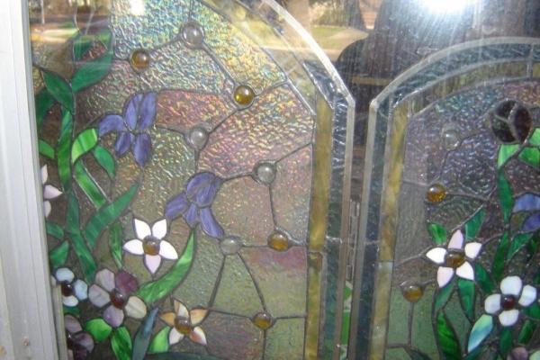 Almost jewel-like, this stained glass screen was done by Mike Cahallan (not sure if the spelling of his last name is correct) for his mother. He was commissioned to do the stained glas at the aquarium in Santa Cruz, California. Some of his stained glass went for thousands of dollars. He did many pieces, both erotic and non-erotic, in San Francisco and many for some of the Gay bars there. Orphan Andy's coffee shop at 17th Street off of Castro Street has many of his stained glass lamps hanging there now. What was unique about his work was the incredible detail.