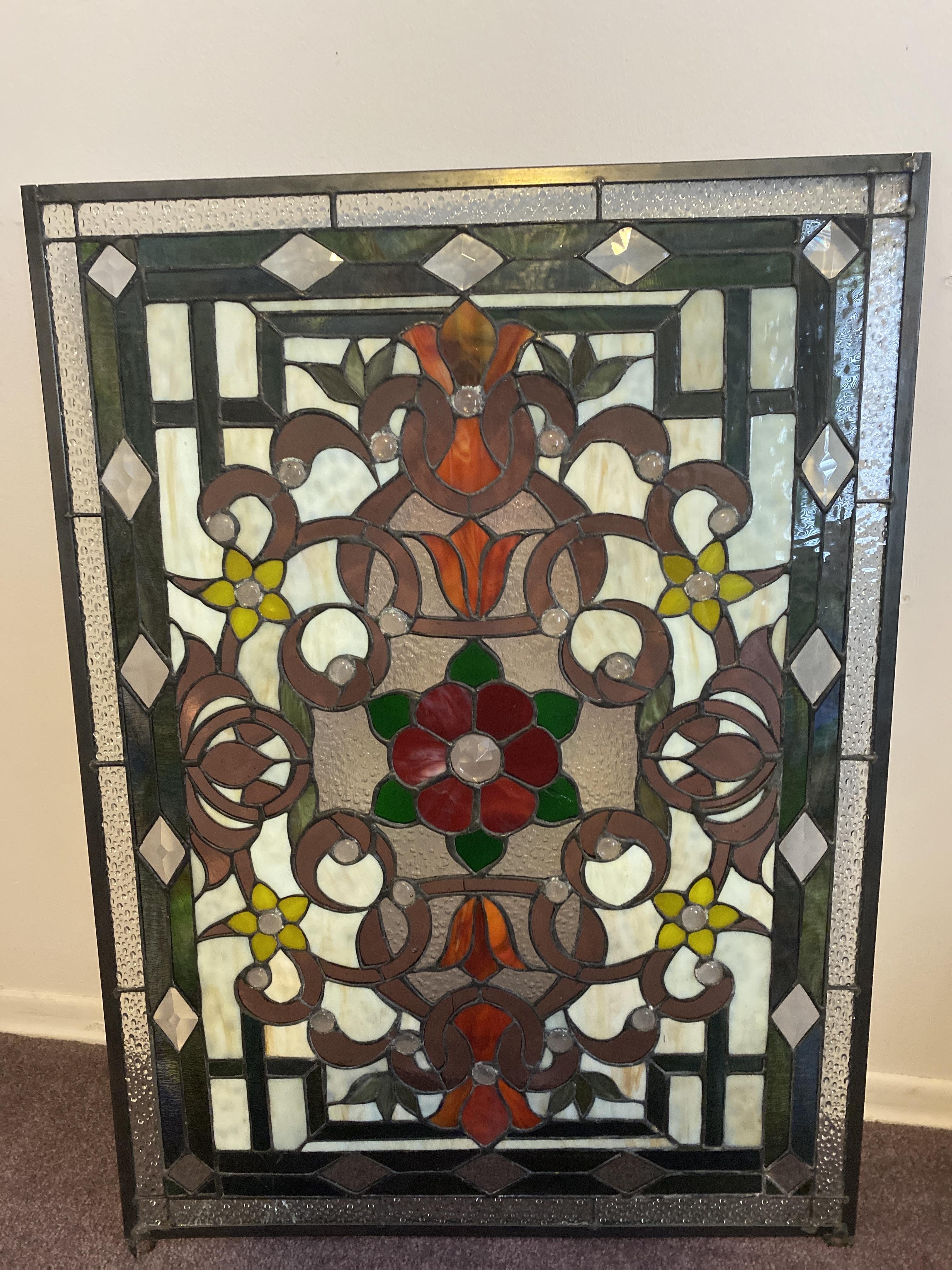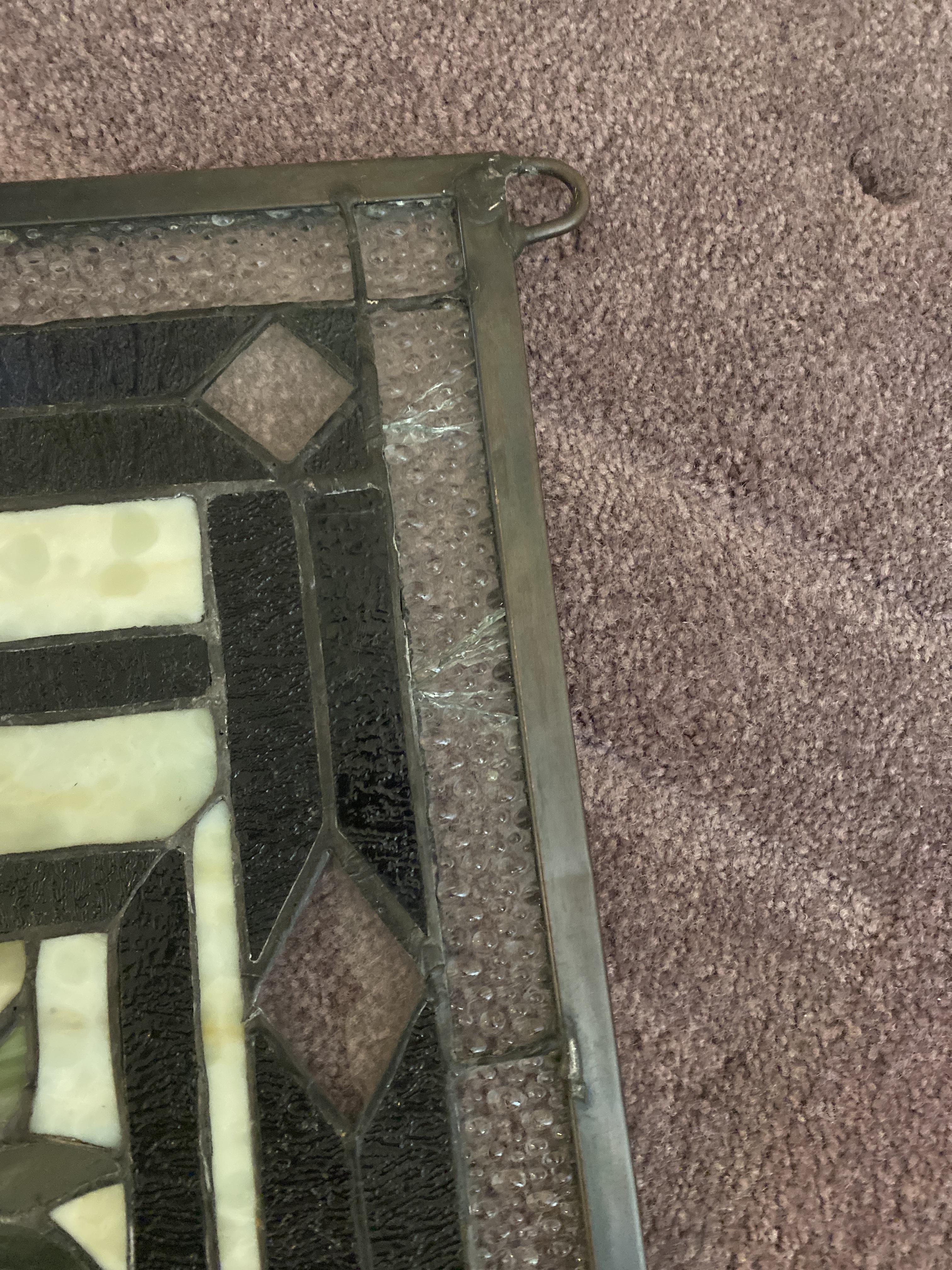 Received from deceased neighbor. Family says was purchased decades ago. Floral design with crack in bottom panel glass (panel is 1.5 inch wide by 4 inches long). Metallic frame. Believed to be handmade due to imperfections.