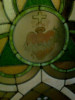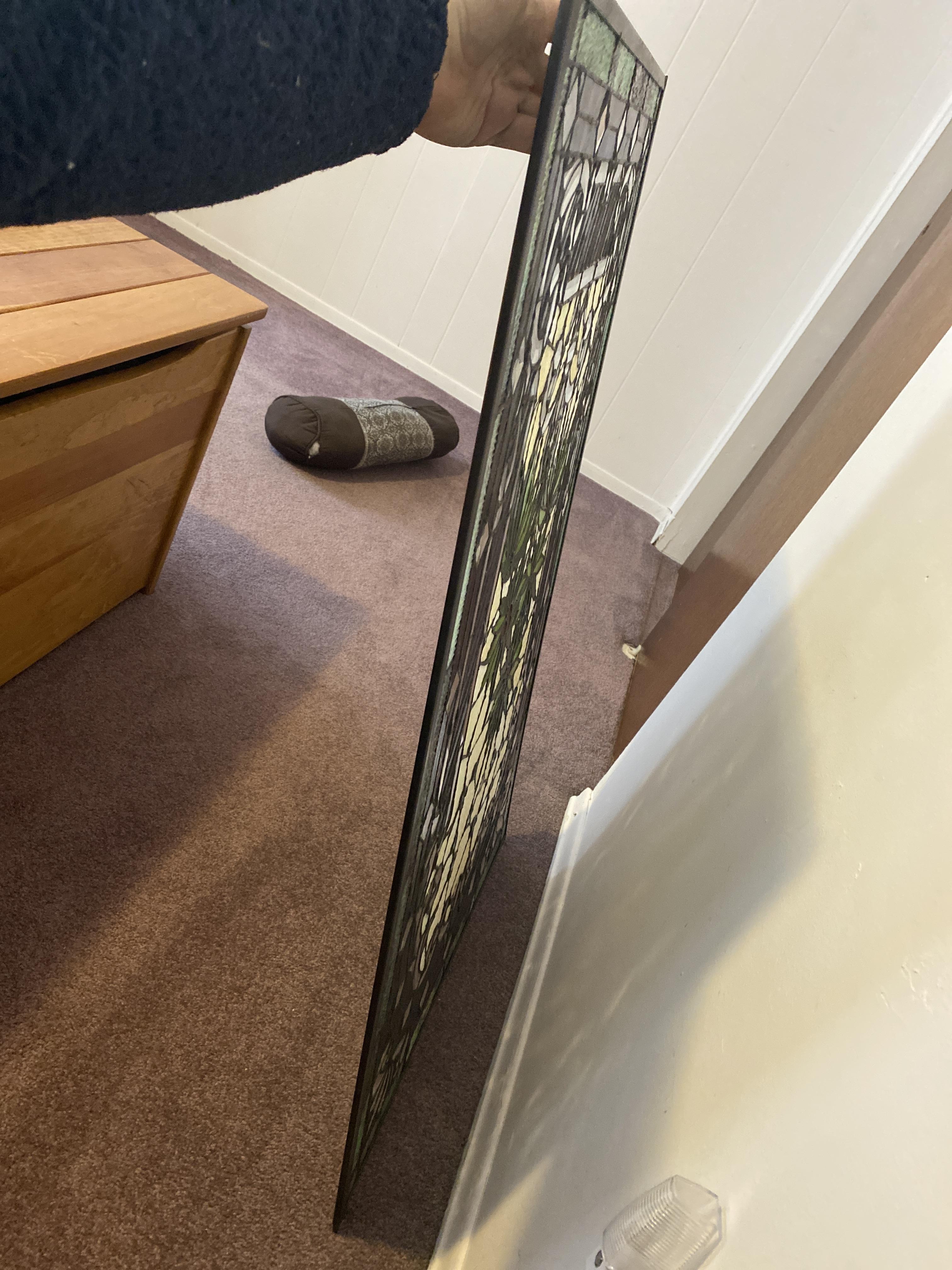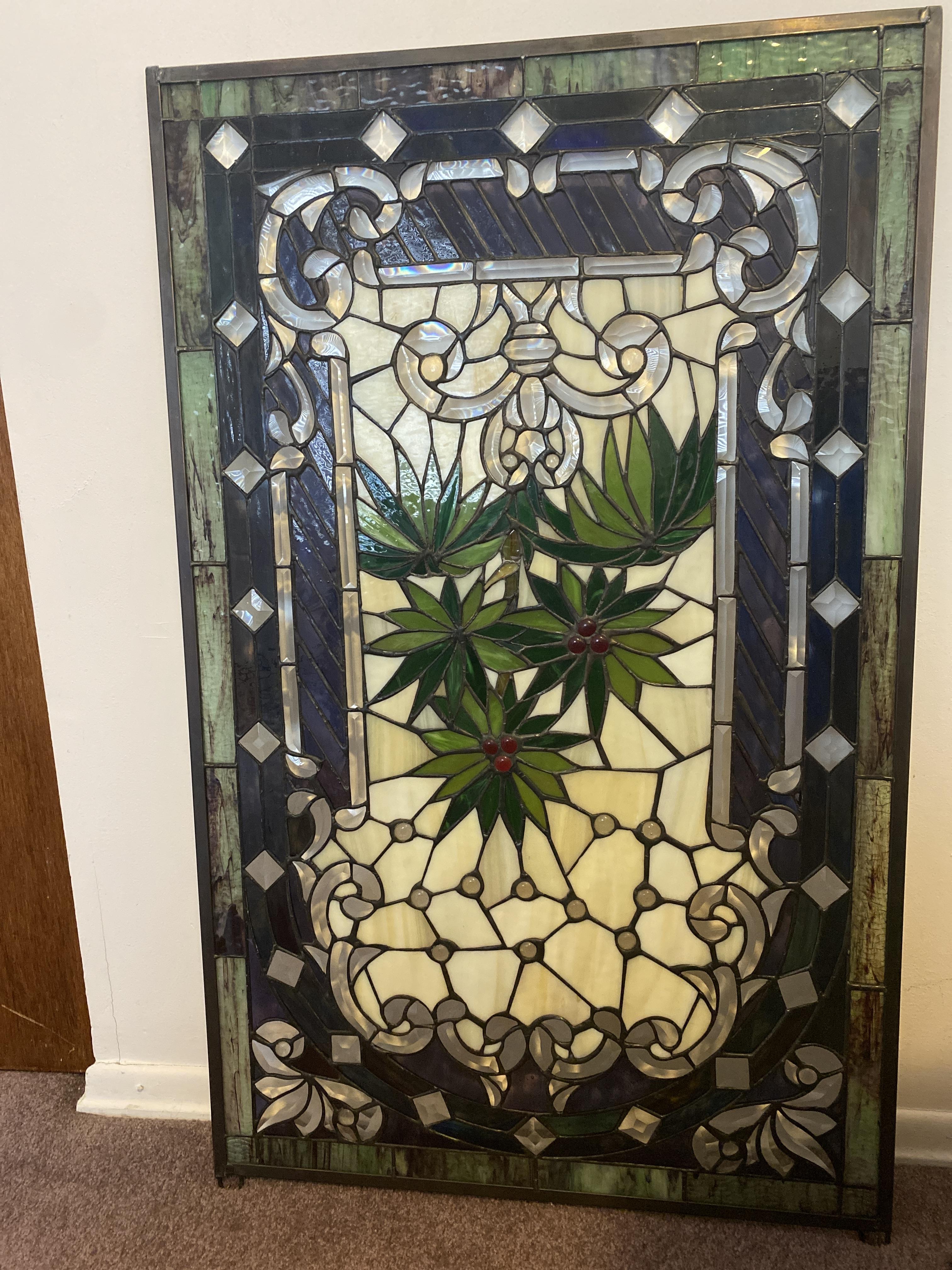 Large stained glass 45 inch tall 21 inch wide 1 inch depth. Believed to be decades old and inherited from deceased neighbor. Handmade