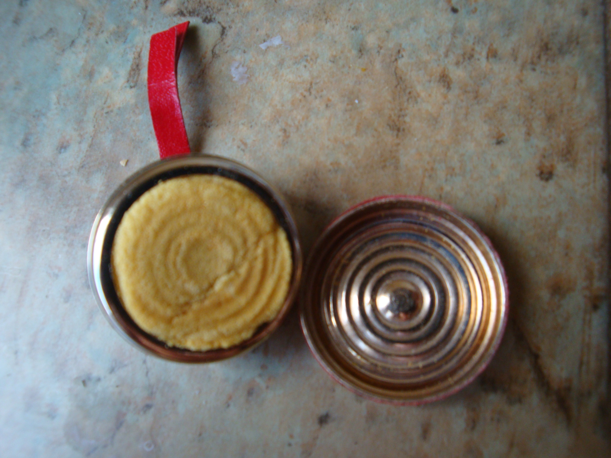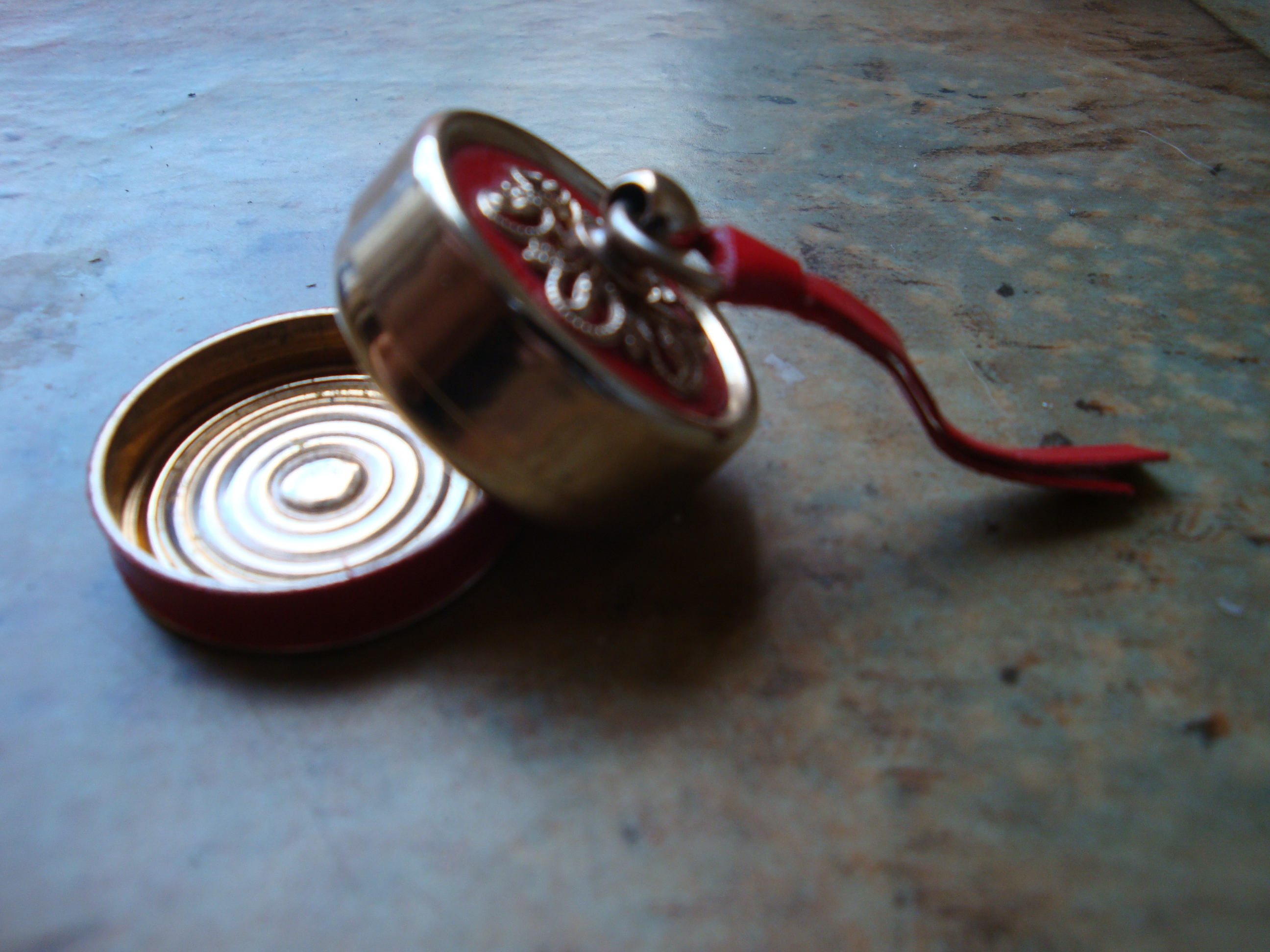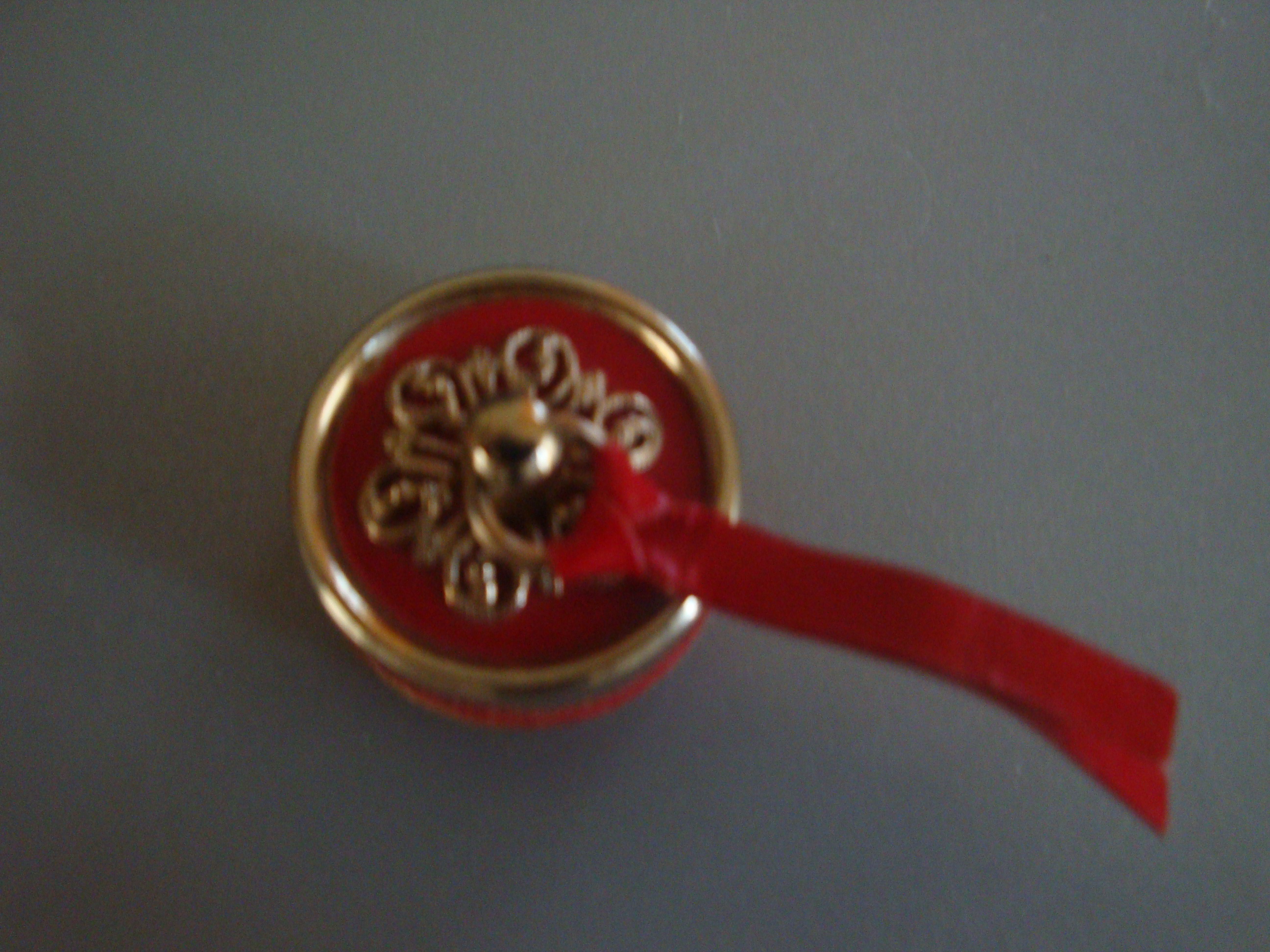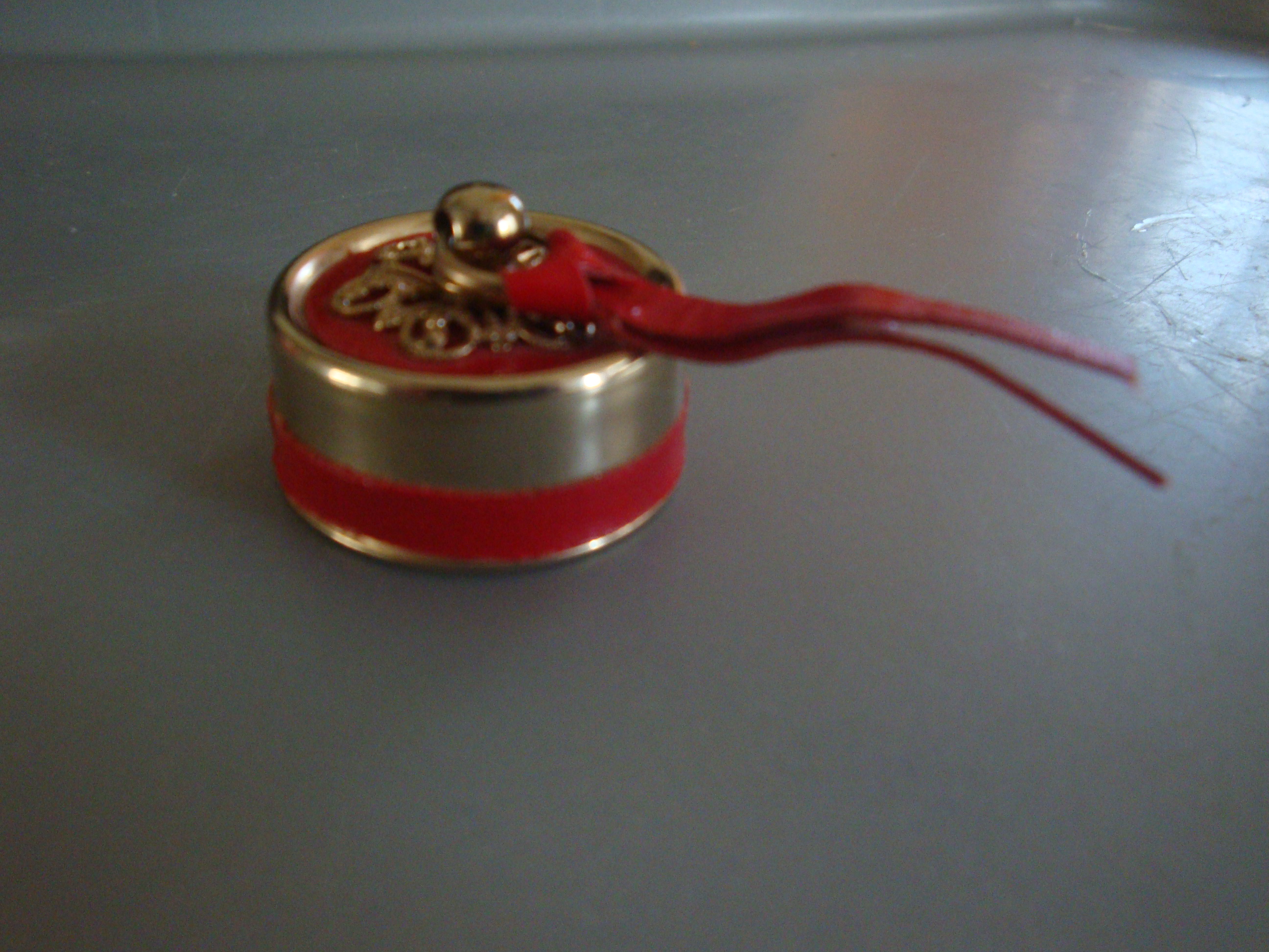 This item is .5 inches tall and 1 & 1/8 inces in diameter. I am not sure if it is silver or not, I don't think so. Th only writing on it is on the bottom on the inner most ring that says PAT PEND. It has a red vinyl ribbon around the bas and under the decoration on toip with a strip on the ring. it opens up and looks like a stamp maybe?