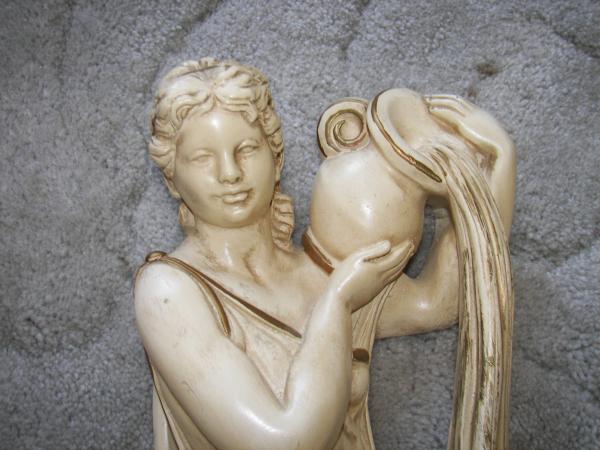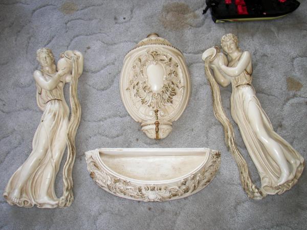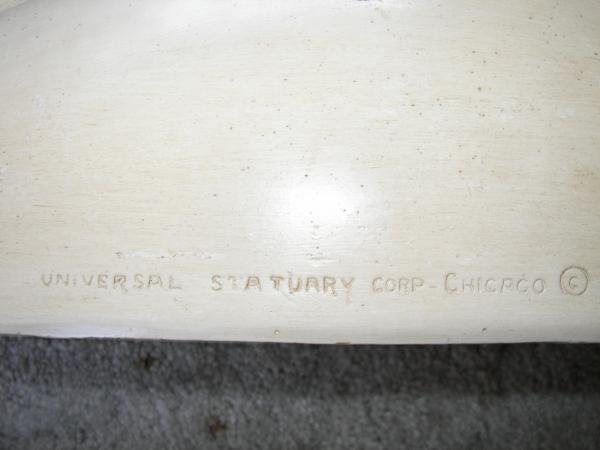 It was purchased at an auction along with some other items. Each piece is stamped on the back with the Universal Statuary Co. - Chicago and a year and #. The years very from the 40's to the 60's, which is actually a copy right date, not the date of making. Unknown what the other numbers are for. It is in great condition, no nicks or cracks. It has some surface dirt, but realively clean.