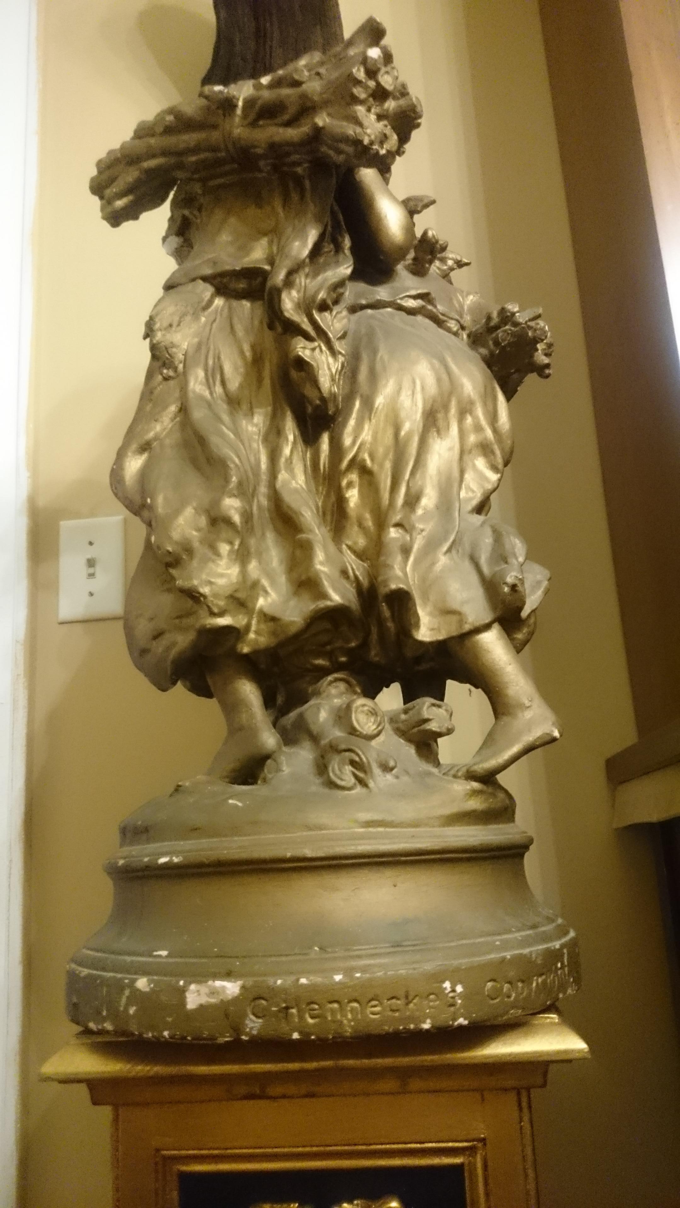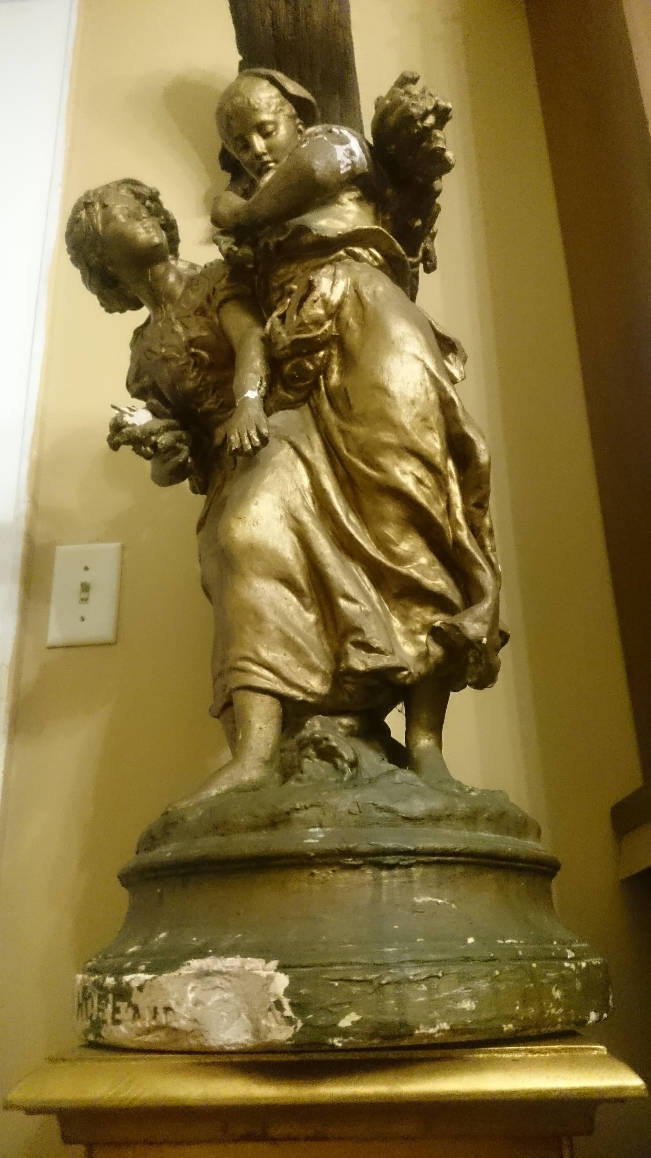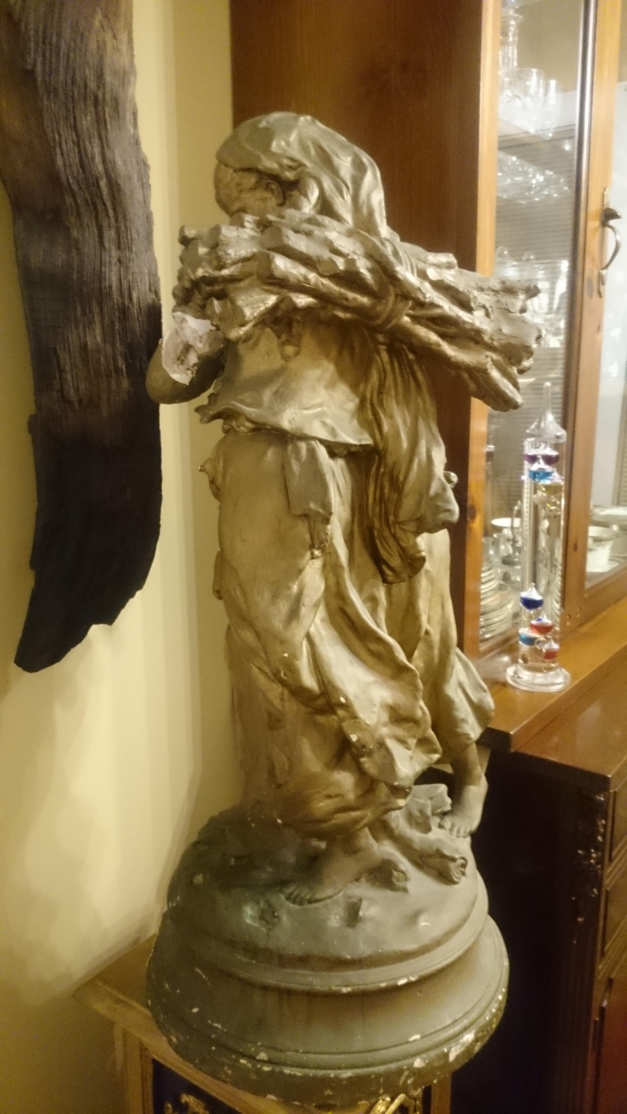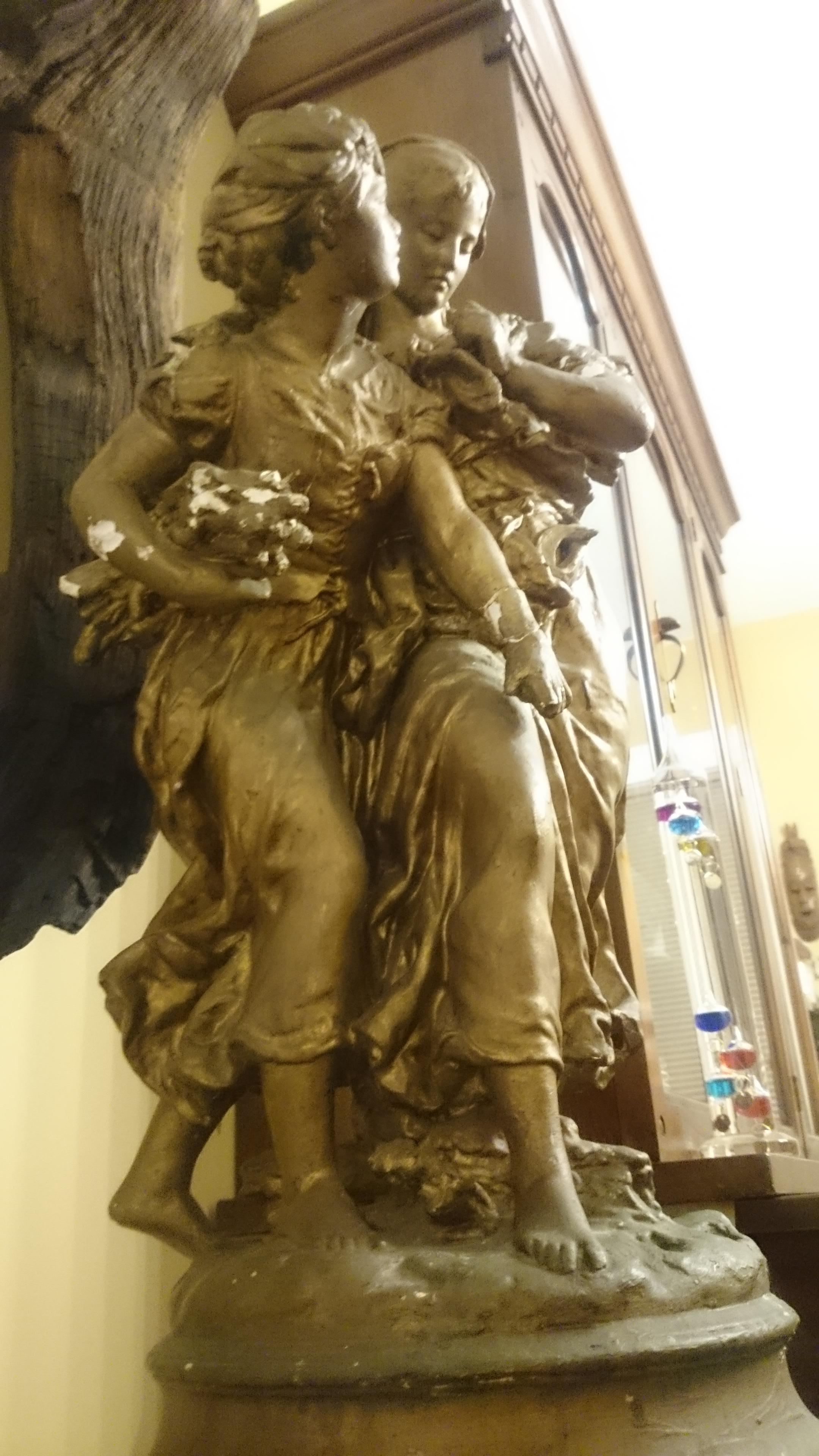 The statue is 30" high with a base 13" high. Two girls holding bundles of wood. made plaster and painted antique gold.