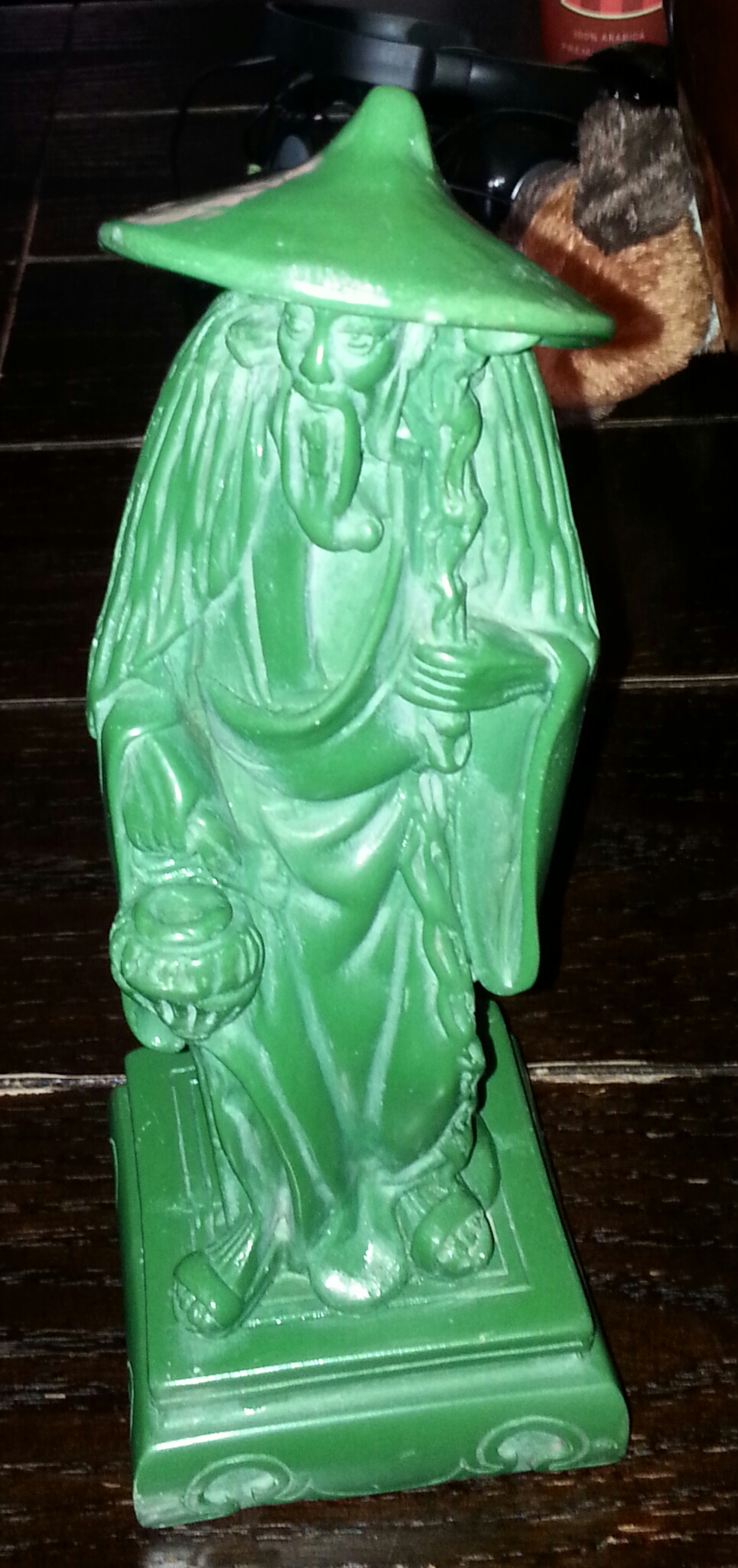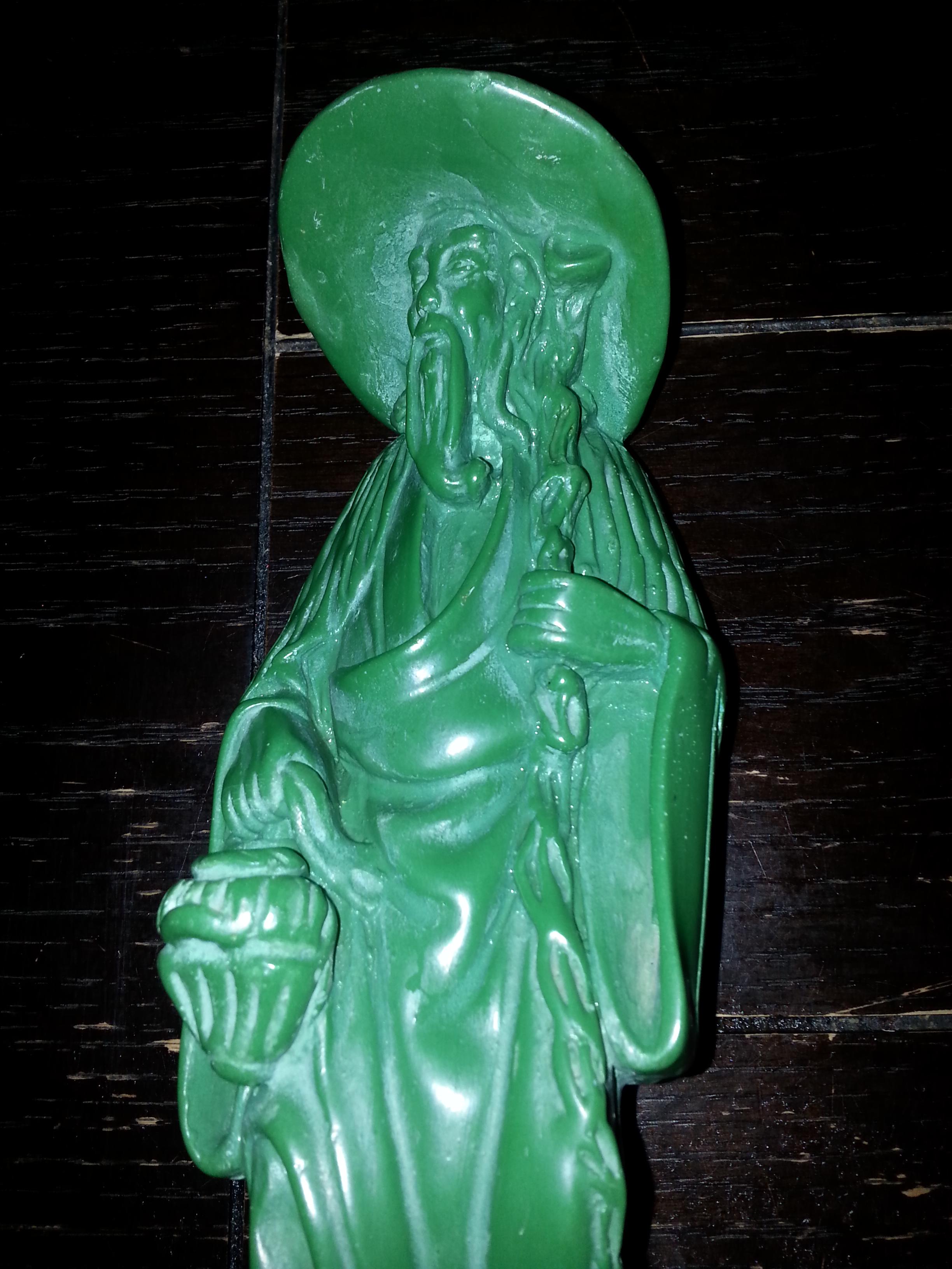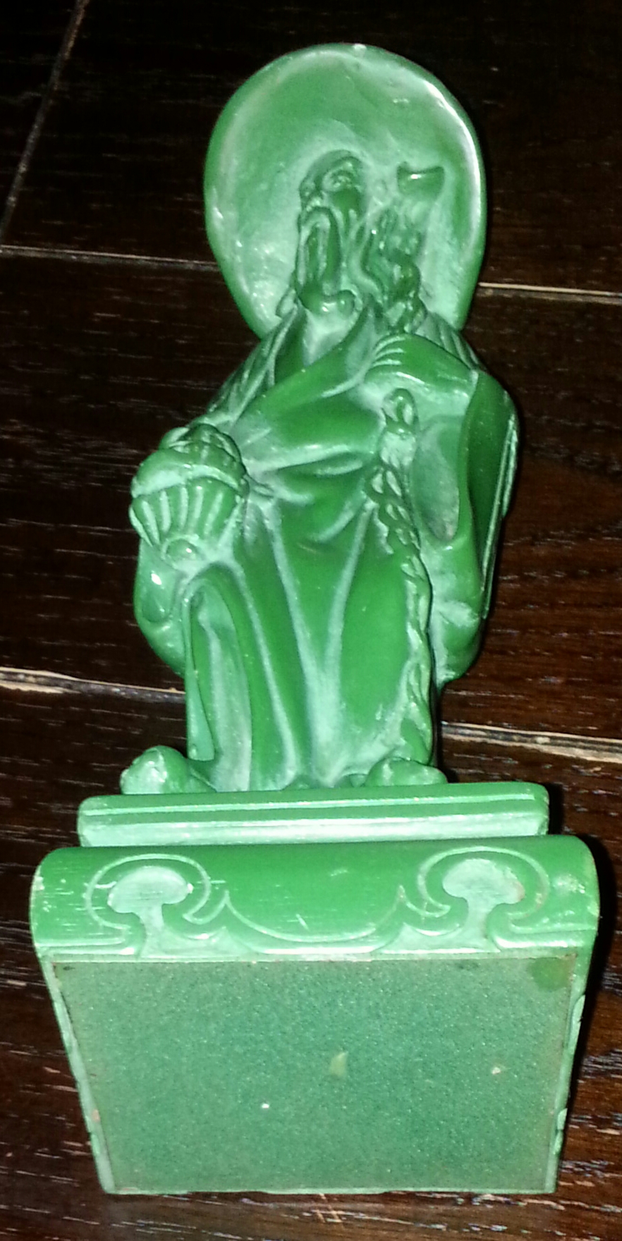 Statue of an old Asian man color is completely dark green with green felt on the bottom. The man has a long beard and is holding something that looks like a basket in his right hand. Statue looks like it is hand carved but I'm not sure. I have had this statue for about 15 years and I would really like to know what meaning the man holds and what is its worth.statue has dust because I don't want to submerge it in water or harsh chemicals until I know for certain what it is. Thank you kindly for any information I receive.