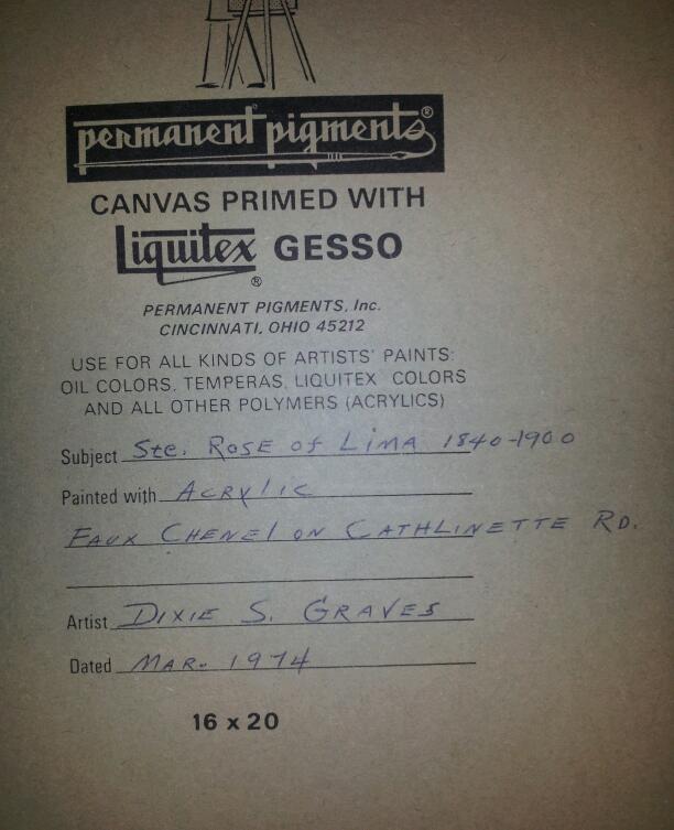 Painted with acrylic....its a church with red wooded walls and a white steeple on top...in a field with a dirt road leading up to it.....its Ste. Rose of Lima 1840-1900....also on back says Faux Chenel on Cathlinette RD.......artist name is Dixie S. Graves dated March 1974