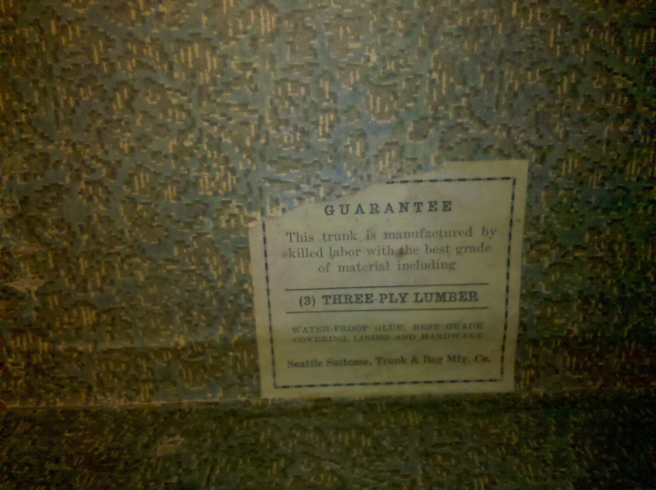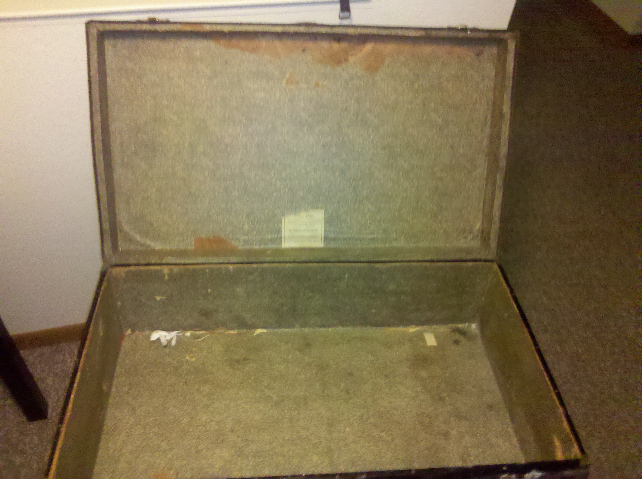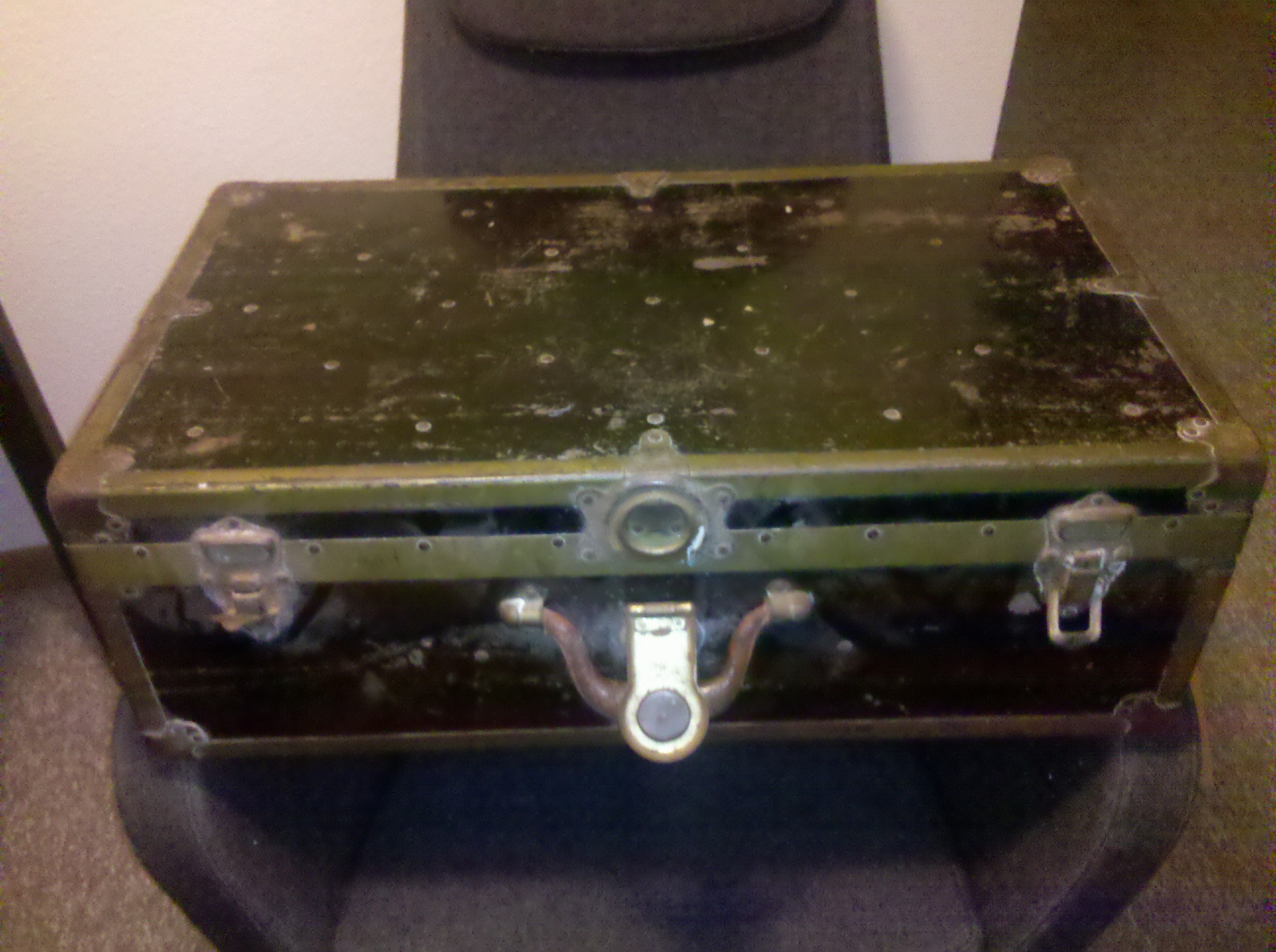 This is a steamer trunk that I believe was made between 1930-1945. It was probably manufactured as a footlocker for the US Army as part of a large contract. It is 3/4 inch plywood covered with thin metal. It has two metal closures and lock made by the A&L Mfg. Company. (Everlasting Model)