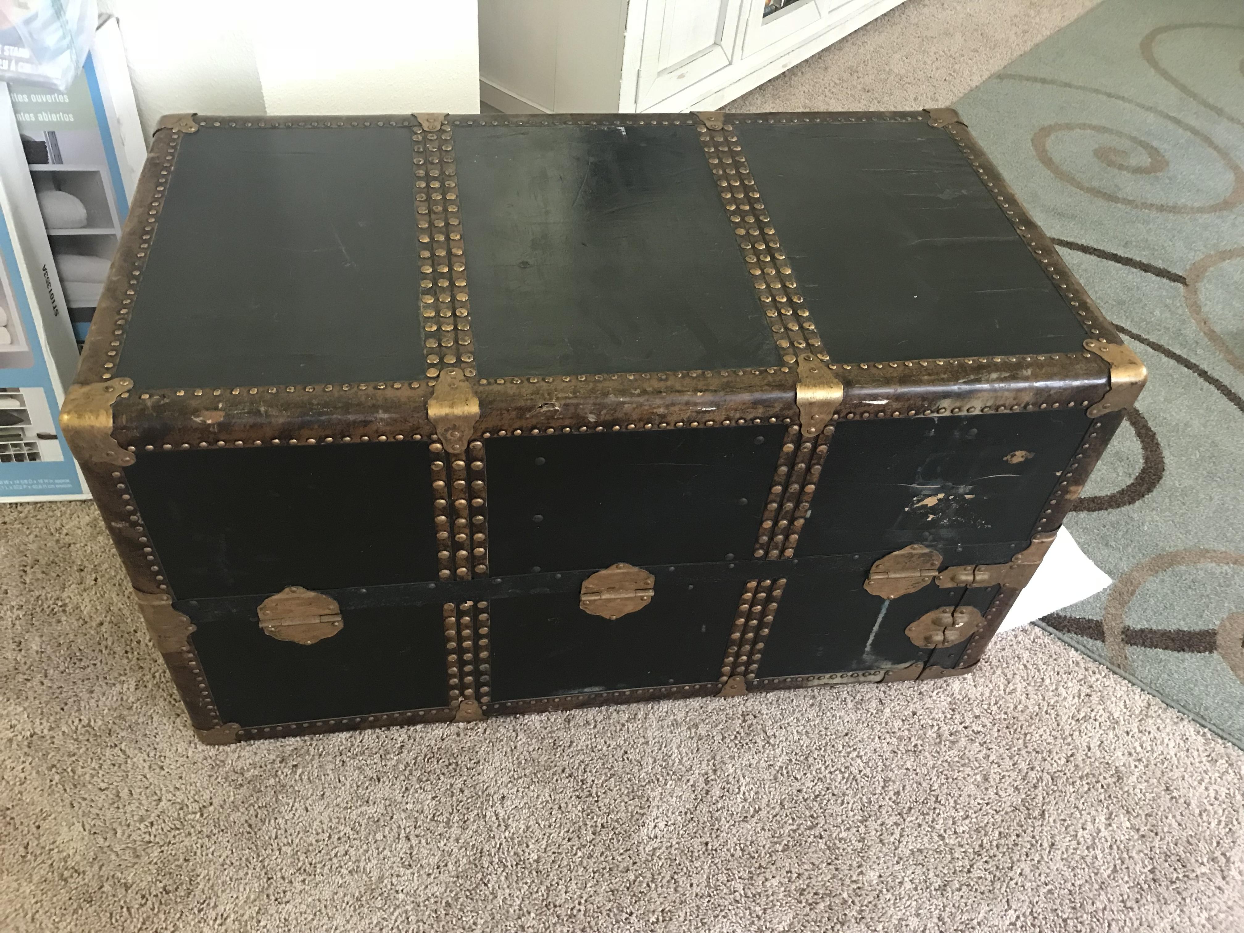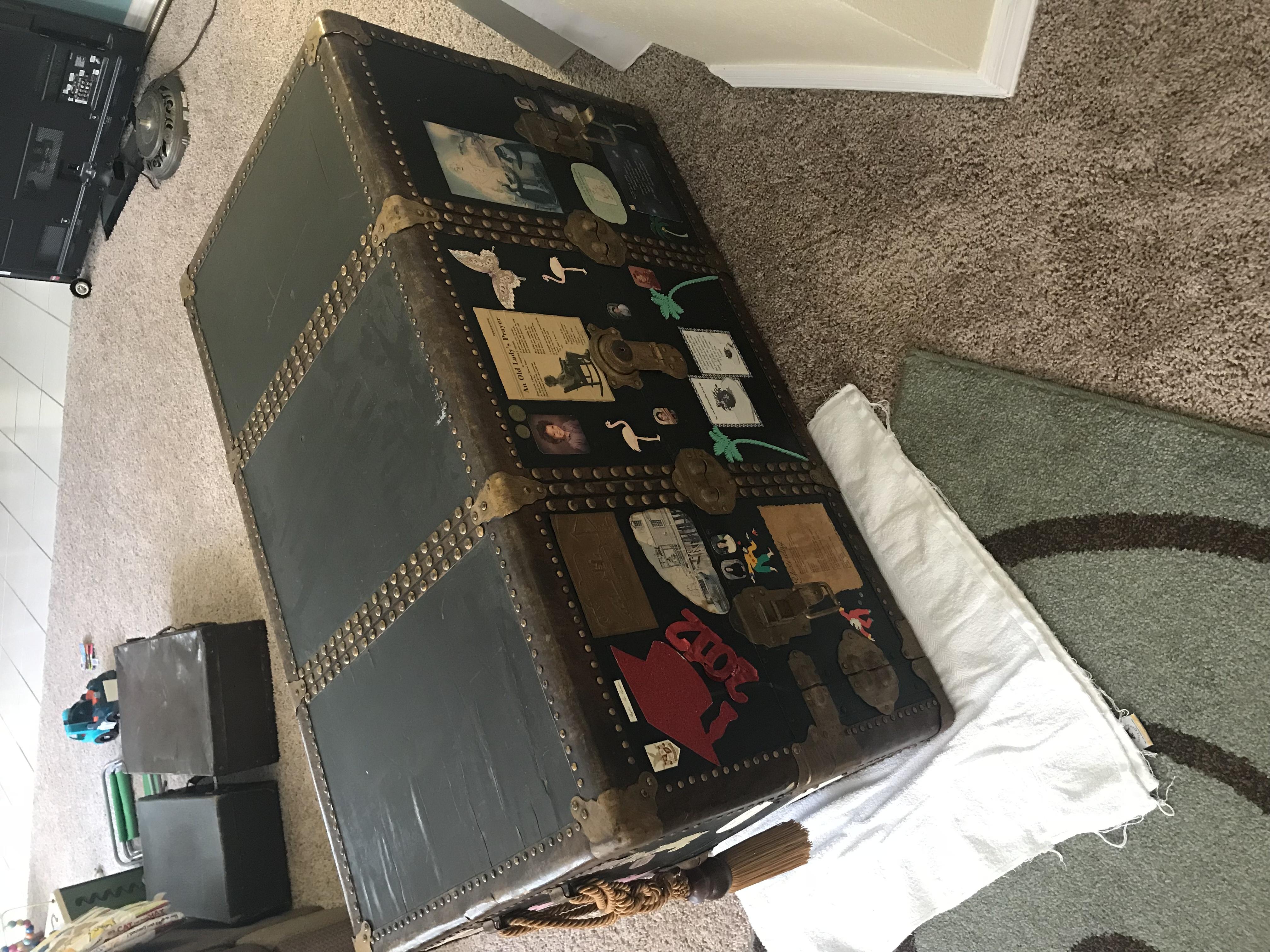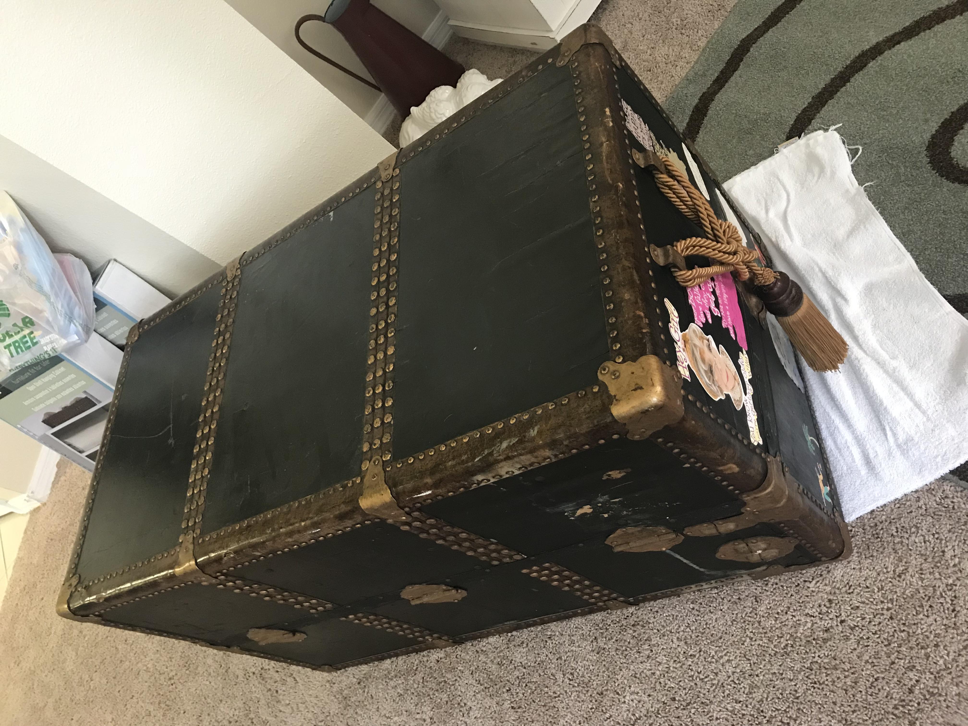 This has been in my family for over 100 years. It is a steamer trunk with black brass, flat top. It opens from the middle vs the normal opening from the top.