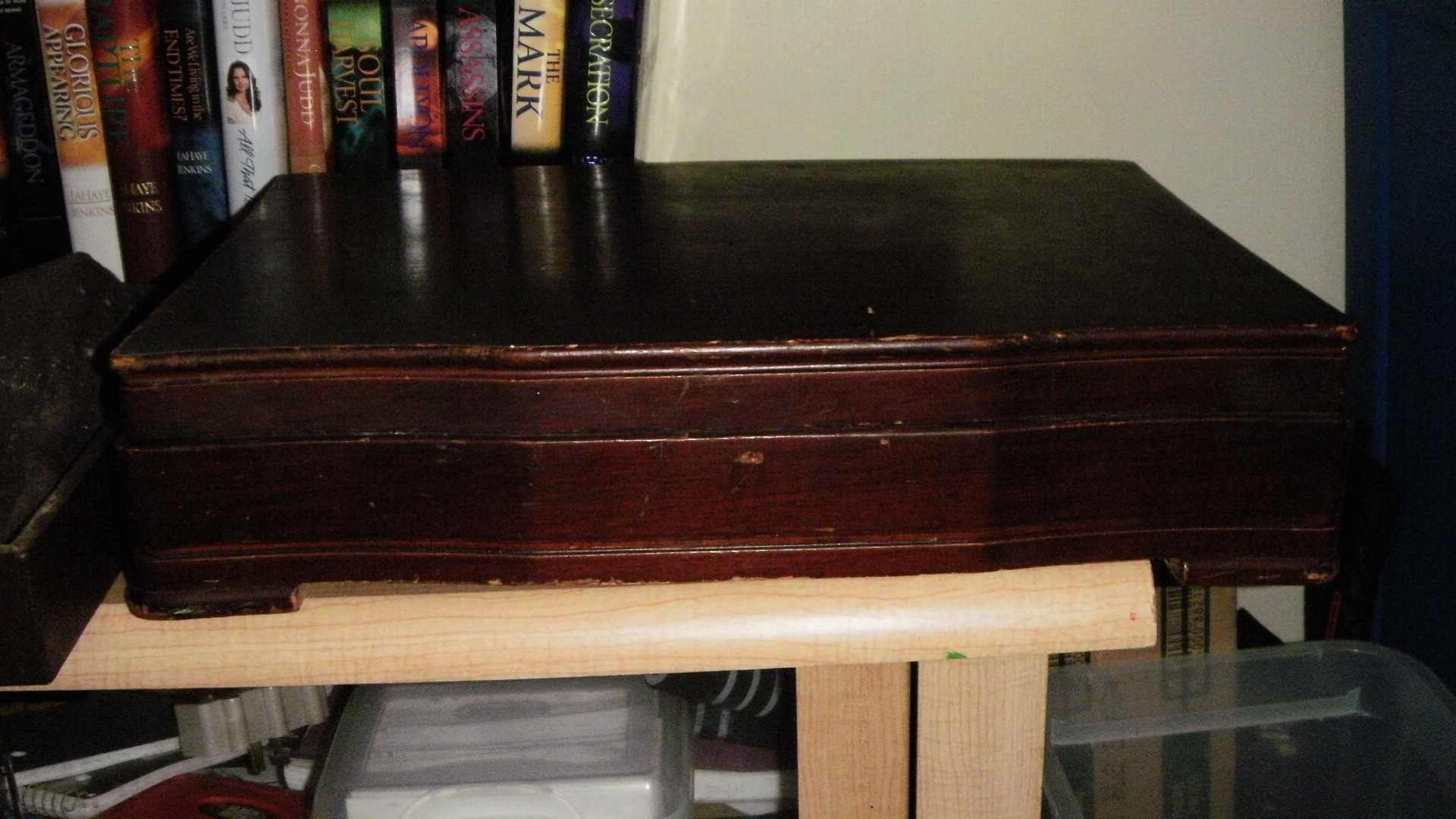 I got this steamer trunk at a yard sale for $5.  I've had it 5yrs.  I find myself in need of money for Christmas so thought I would sell it.  It has no shelf insert and appears to be made of wood with canvas of blue tint color, along with leather straps which are rotting off.  The main part of the trunk is of good integrity, however, and I use it to store things.