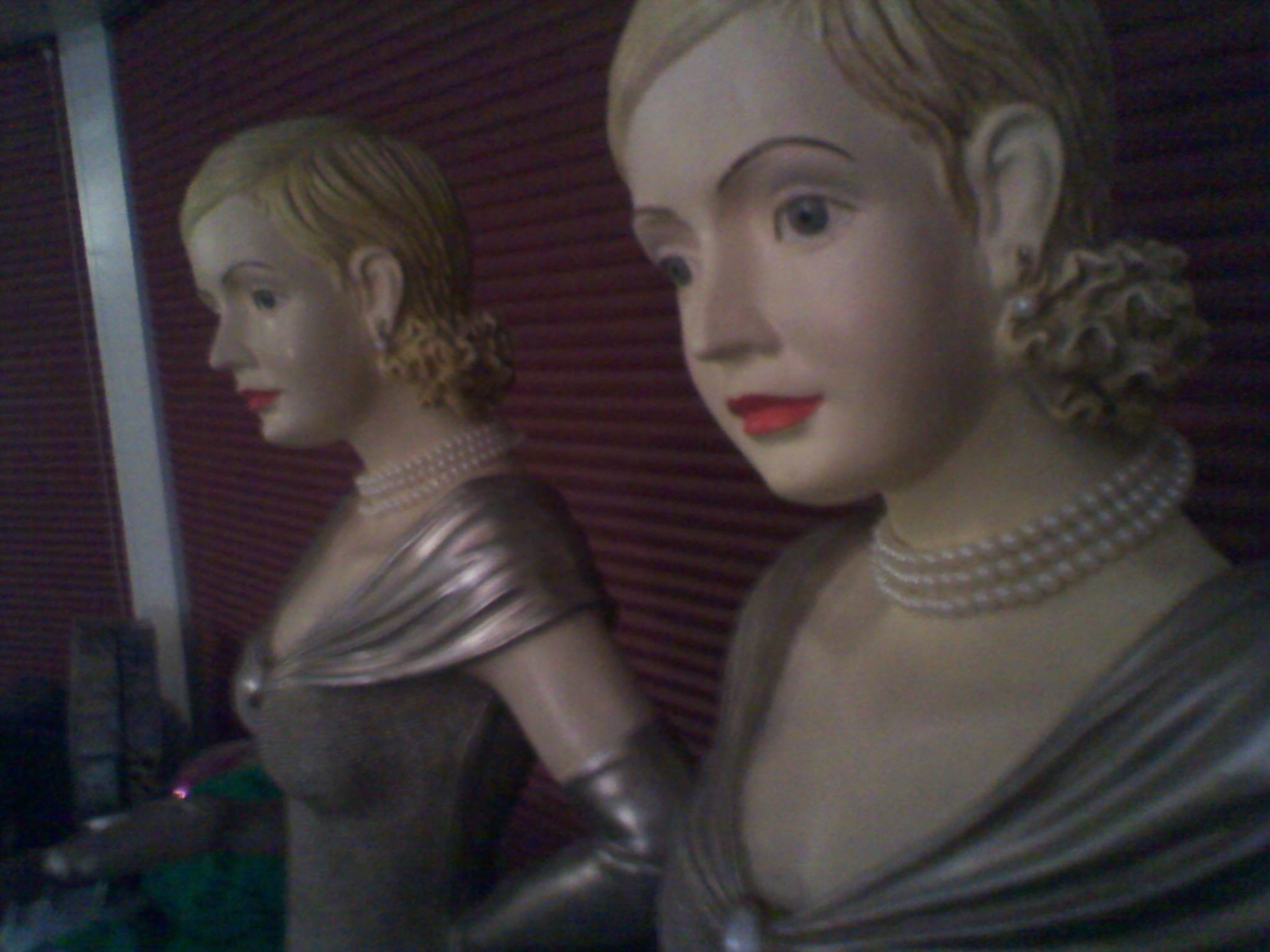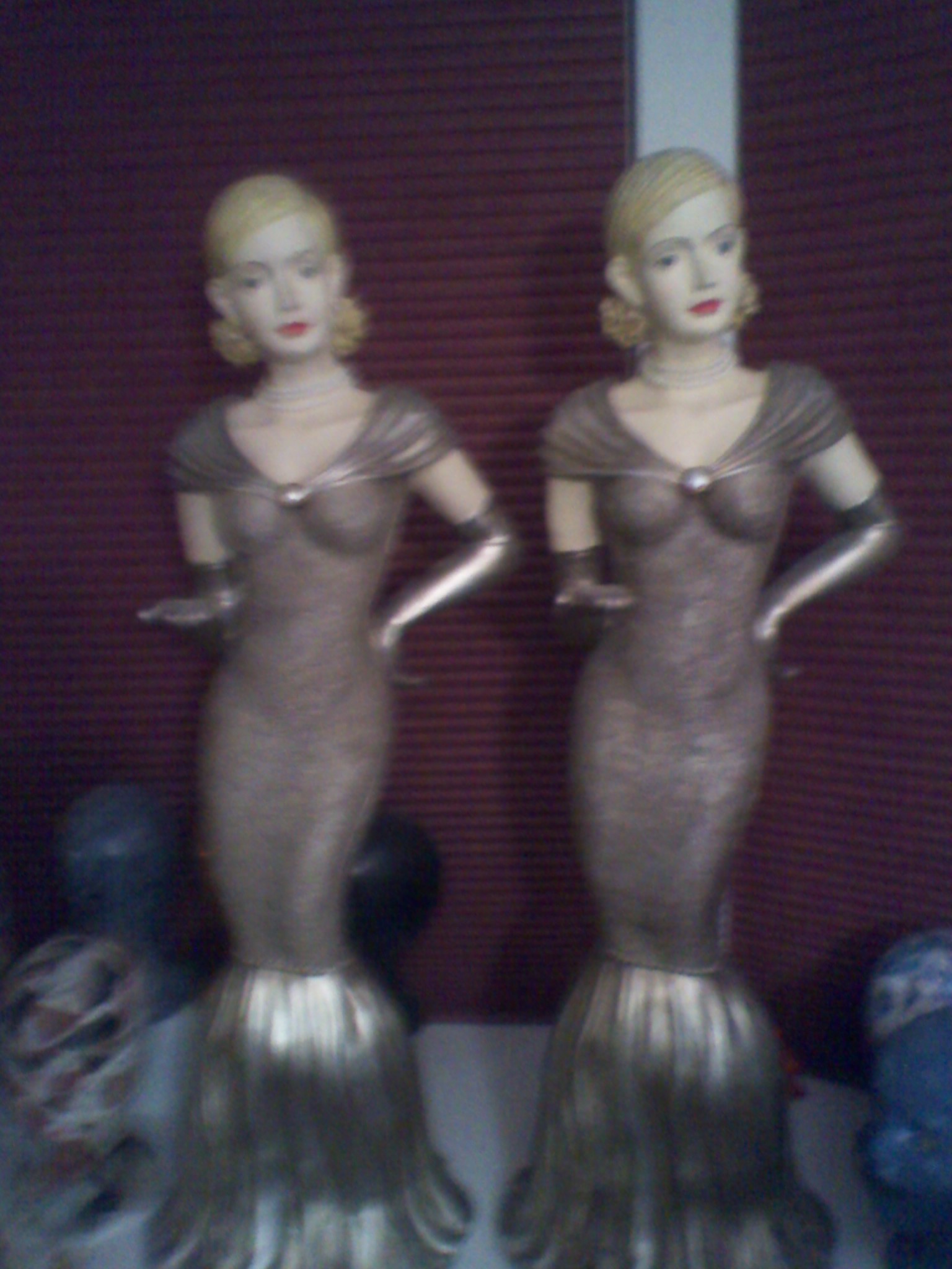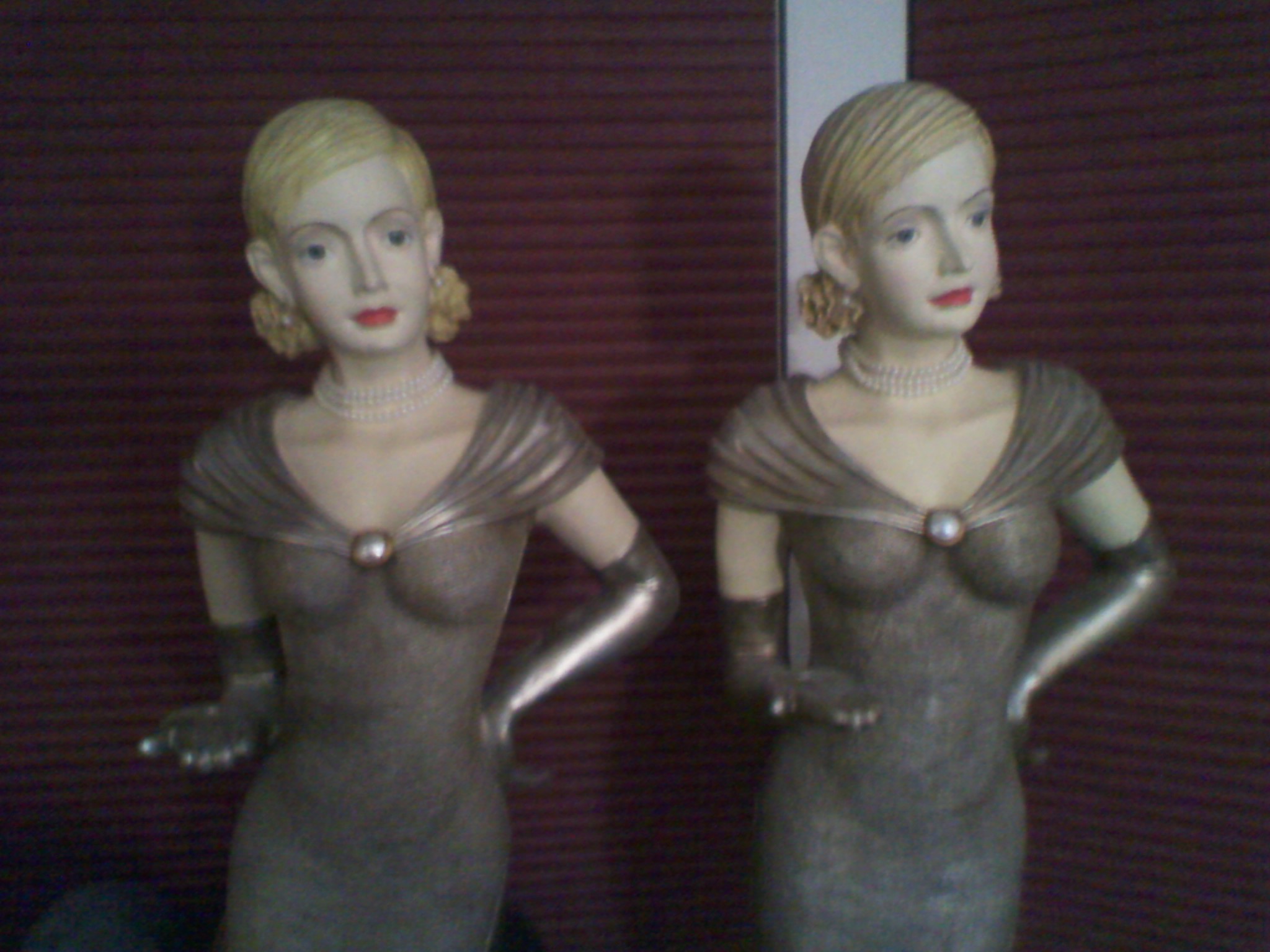 These two statues have no markings  anywhere except that on the bottom of one appears a small oval Made in China sticker. They have 2 holes in their right palms. The hole closest to the wrist is a bit larger (1/2 inch) than the other(1/3 inch). Also on the opposite sidethe larger hole is indented for possibly a washer. Although they look identical there are slight diferences: Blanche has a tint of green in her pupils, is a bit taller, her extended arm is further away from her body and she is looking more towardsthe center while her better half veers towards her left. Blanche