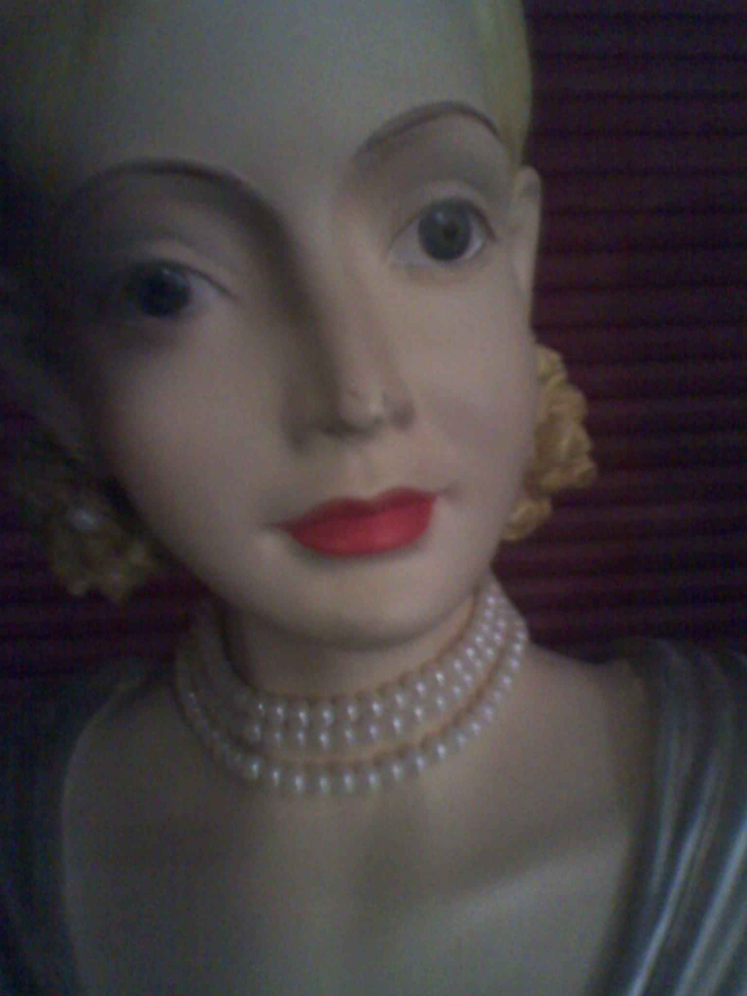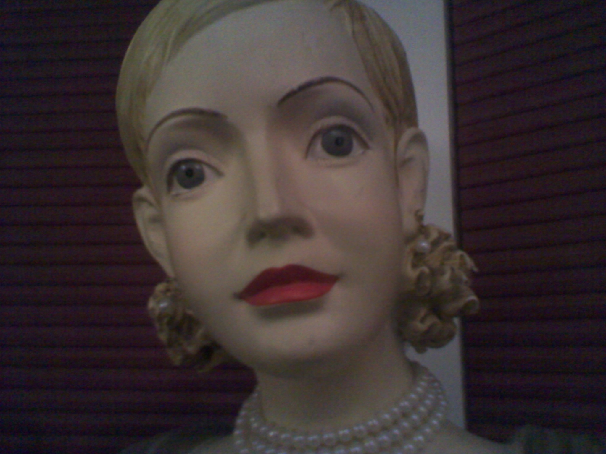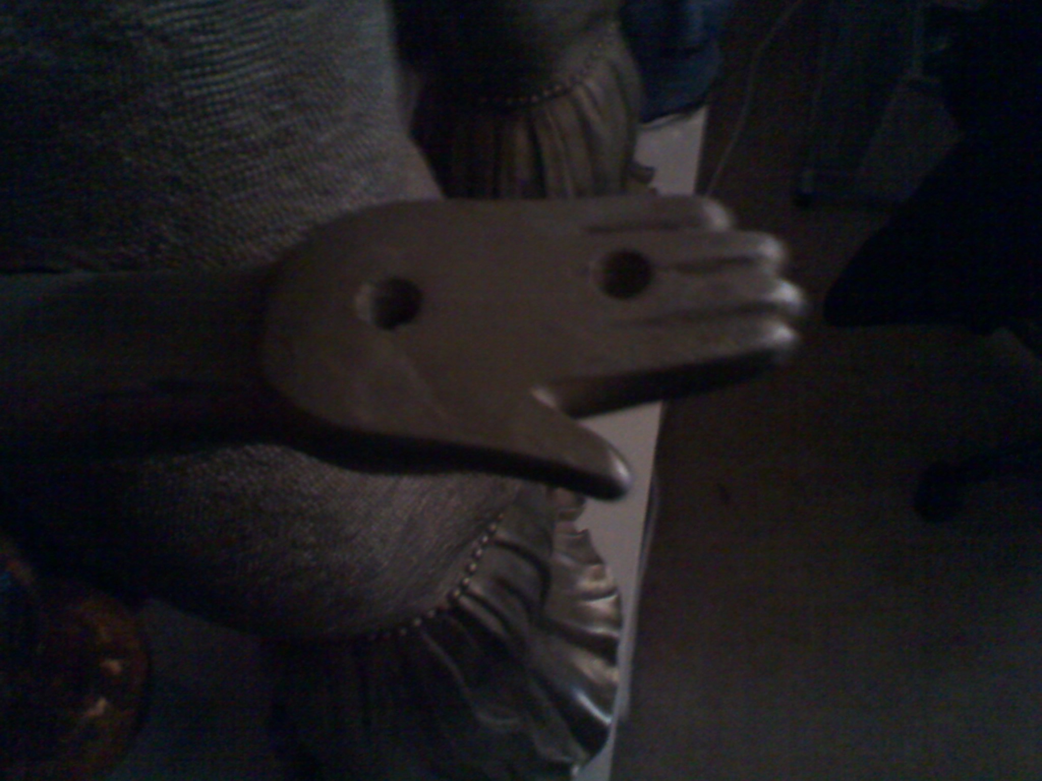These two statues have no markings  anywhere except that on the bottom of one appears a small oval Made in China sticker. They have 2 holes in their right palms. The hole closest to the wrist is a bit larger (1/2 inch) than the other(1/3 inch). Also on the opposite sidethe larger hole is indented for possibly a washer. Although they look identical there are slight diferences: Blanche has a tint of green in her pupils, is a bit taller, her extended arm is further away from her body and she is looking more towardsthe center while her better half veers towards her left. Blanche
