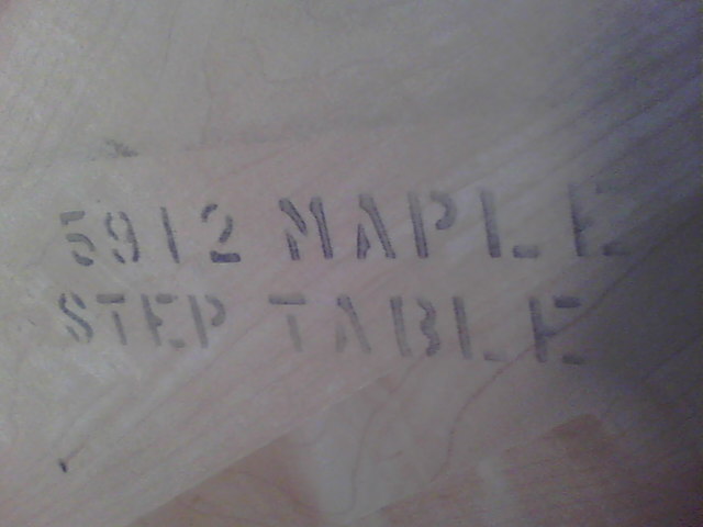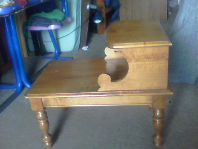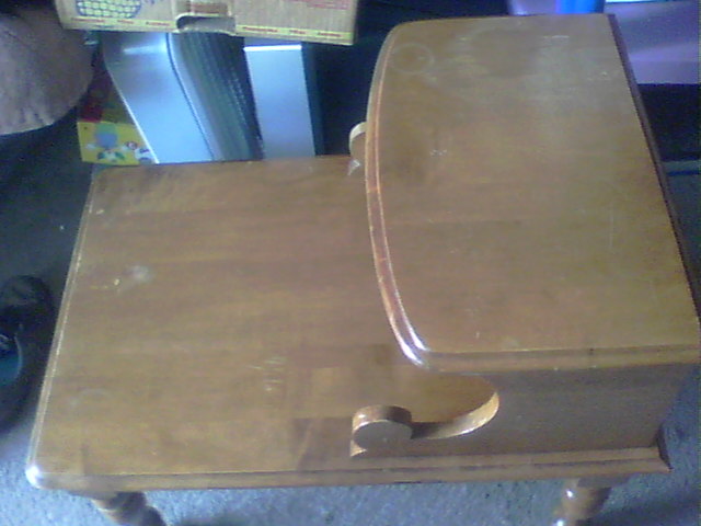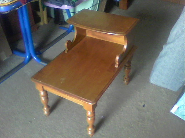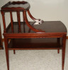 This piece is a two-tier step down end table. A very solid piece of funiture which could use a refinish job. I don't know the maker.
