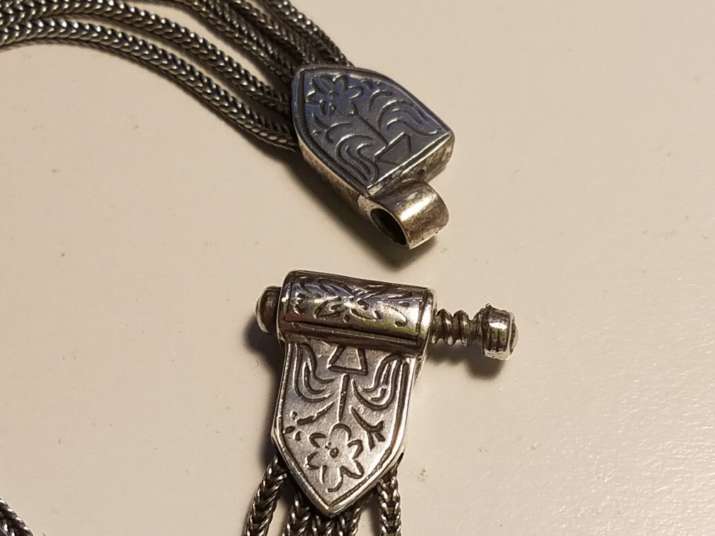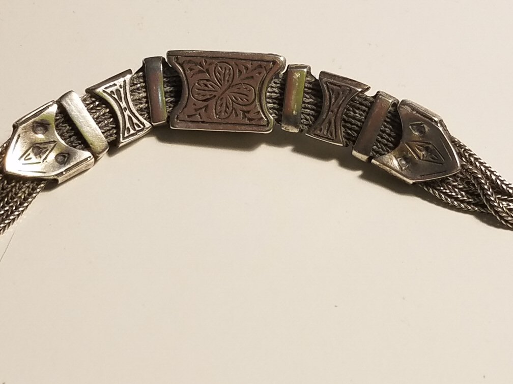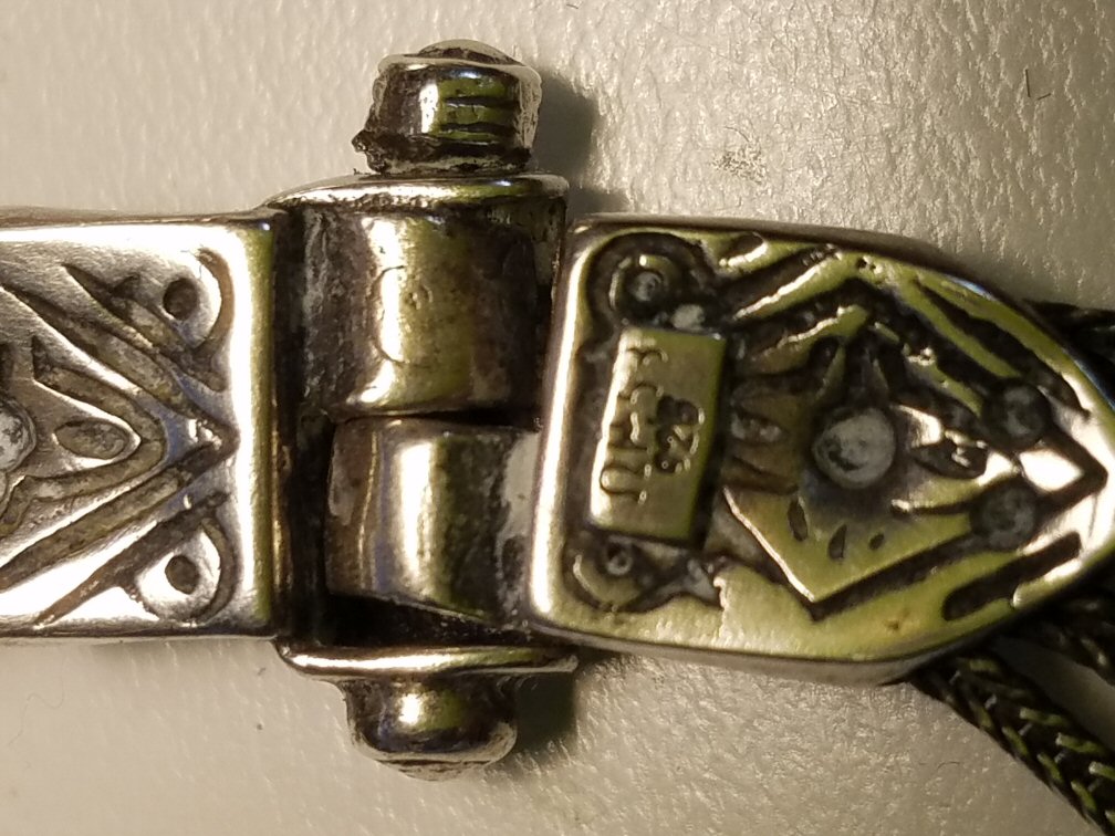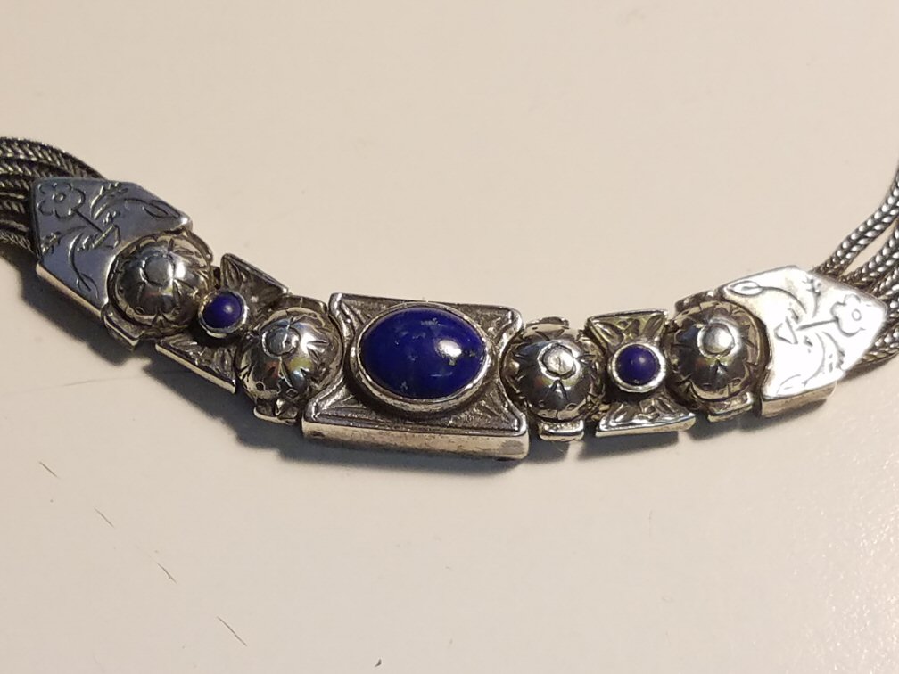 5 strand sterling silver square chain choker. Unusual screw pin clasp. The chain strands are continuous and thread through the stations like sliders, but they are stationary. The stations are stamped with design on both the outside and inside, and have small lapis cabochons. Two side stations have 3 sections each and the center has 9 sections. The hallmark is virtually undecipherable but starts with an Omega symbol. Possibly an H after that and then a couple numbers 5 & ? Overall length 17"