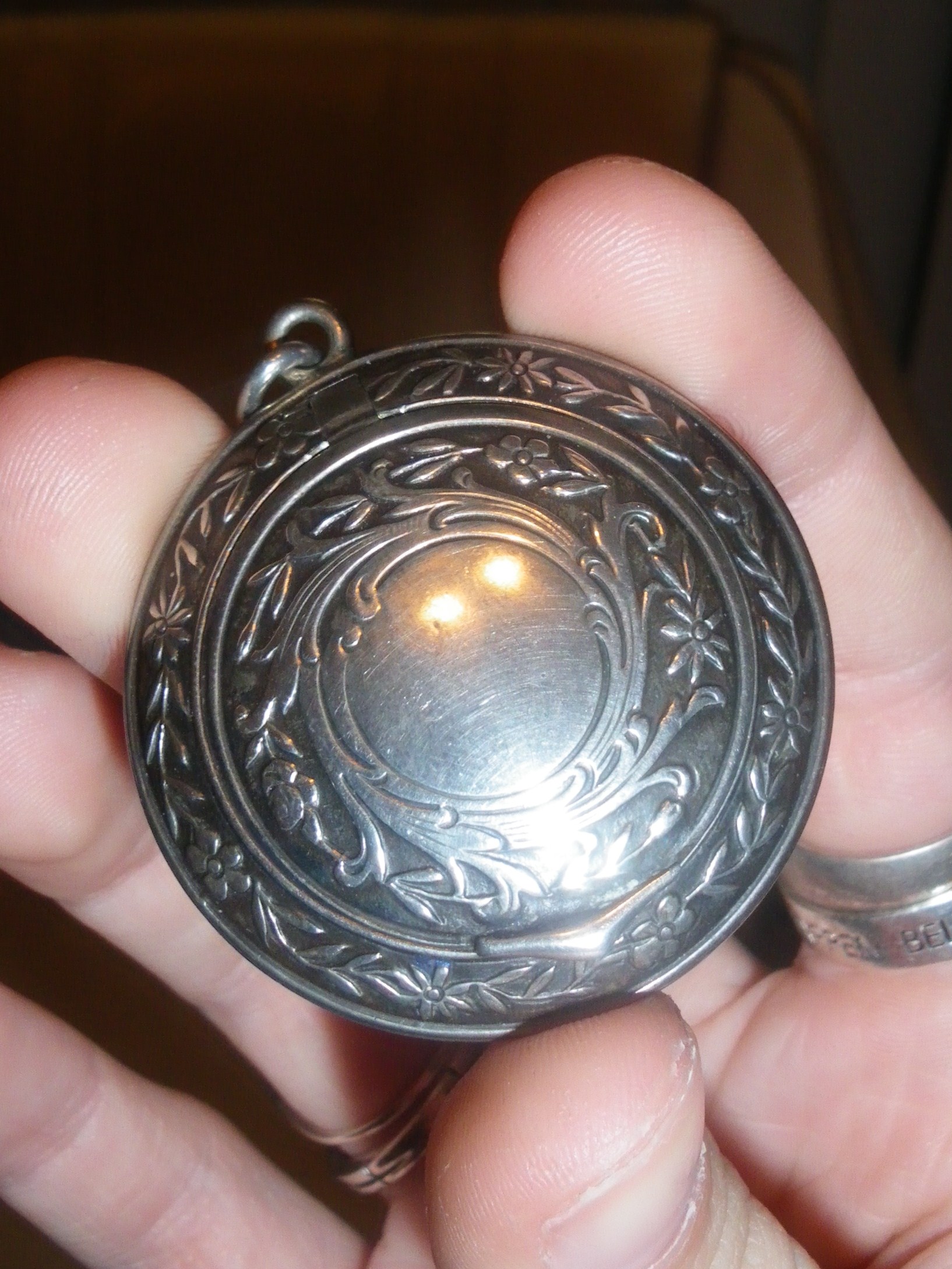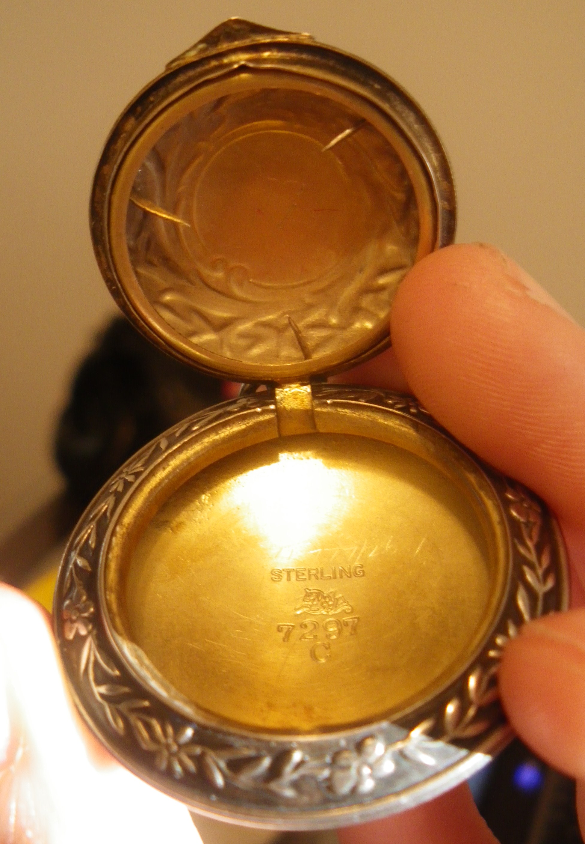 Sterling silver antique box, not sure if its a snuff box or something a lady used to wear on a necklace. looks like it used to hold a mirror or picture inside of it. a carousel horse marking, with numbers 7297 C inside. i have yet to find what this means. beautiful flower design carving in the top. flips open and shut. great piece! please let me know if you know anything about it or are interested.