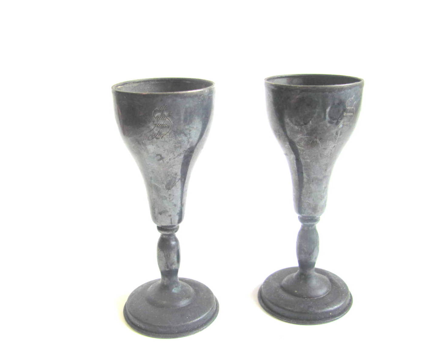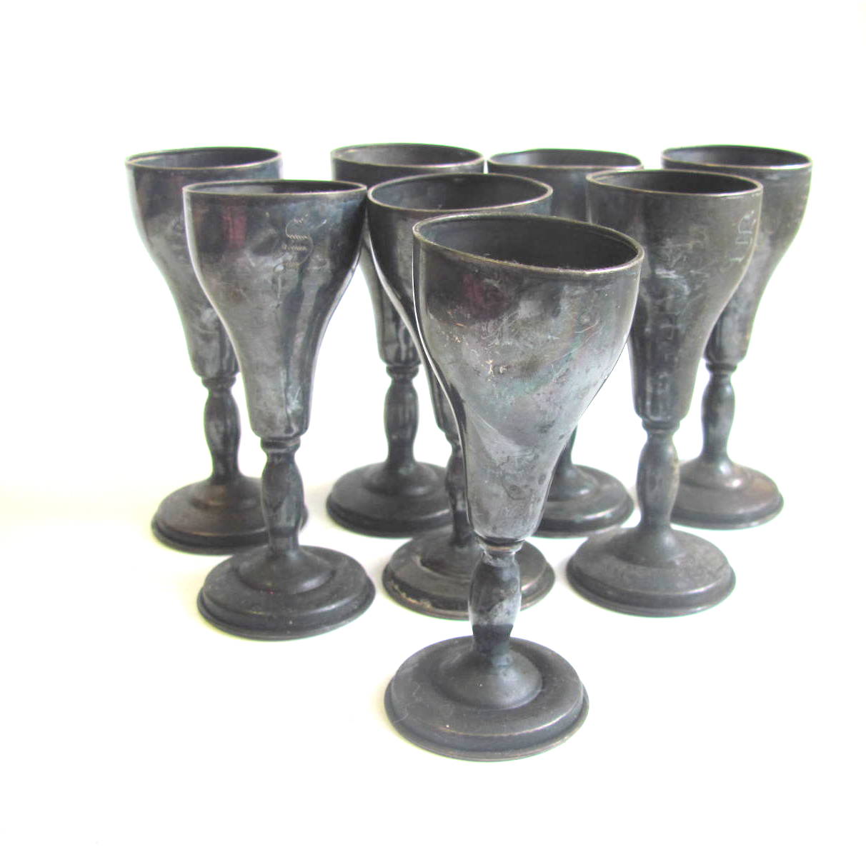 Both sizes have what looks like a unique monogram but I cannot make it out. We have 9 of the smaller, 3 inch cups and 8 of the larger, almost 5 inch cups.