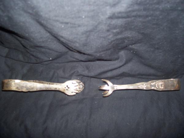 I BELEIVE THESE ARE SUGAR OR ICE TONGS. THEY ARE STERLING SILVER. THE CLAW TONGS ARE STAMPED "DIXON", THEY HAVE VERY NICE DETAILING THAT RUNS ALONG THE HANDLES LITTLE MORE THAN HALFWAY TORWARDS THE BOTTOM. THE OTHER IS MARKED "EPNS", AND HAVE CUTOUTS IN THE ACTUAL TONG THAT RESEMBLES A FLUER DE LIS. ARE THESE OF ANY VALUE? IF ANYONE HAS ANY INFORMATION PLEASE FEEL FREE TO FILL ME IN...THANKS!!!