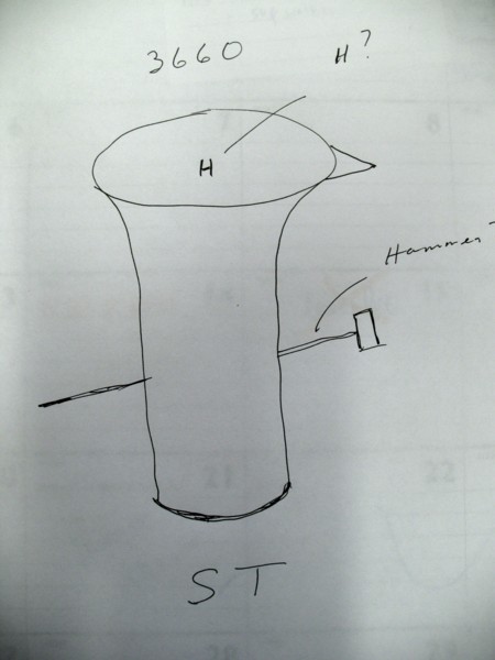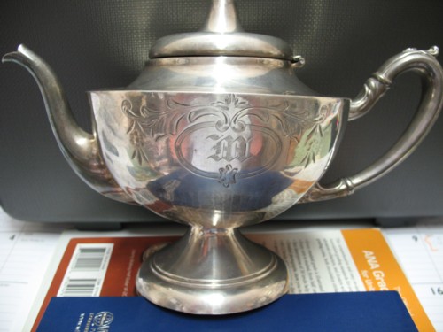 Silver Teapot. Monikered "M". Can barely see hallmark. Will draw a pic as best as possible. Hallmark appears to be a teapot with a hammer through it and an H on top of pot. Can read ST but appears to have been re-soldered hiding ERLING?