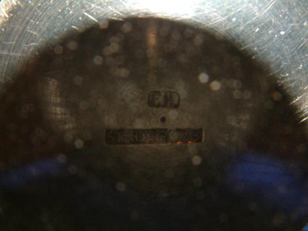 This piece seems to be a water tumbler. It is hand made with the top formed from a 1/16-inch thick sheet of silver and then joined. The seam is almost invisible. The bottom is made of a 1/8-inch thick by 2 1/2-inch diameter silver disc silver soldered to the top. Almost all of the outside surface has a heavily hammered look. The top has a smooth 1/4-inch band all the way around. A couple of the hammer marks cross over into this band. The applied bottom is smooth. The inside is generally smooth but you can faintly see some of the stretch and compression marks from forming and faintly see the backs of the hammer marks. The front has a monogram. It consists of an 1 7/8-inch diameter circle with the initials B MAC forming the circle in Art Deco form. The bottom is stamped FH in a square cartouche approximately 1/8-inch by 1/4-inch long and STERLING 935 in a cartouche approximately 1/8-inch by 1/2-inch long. It weighs 4.14 oz. (129 G.)