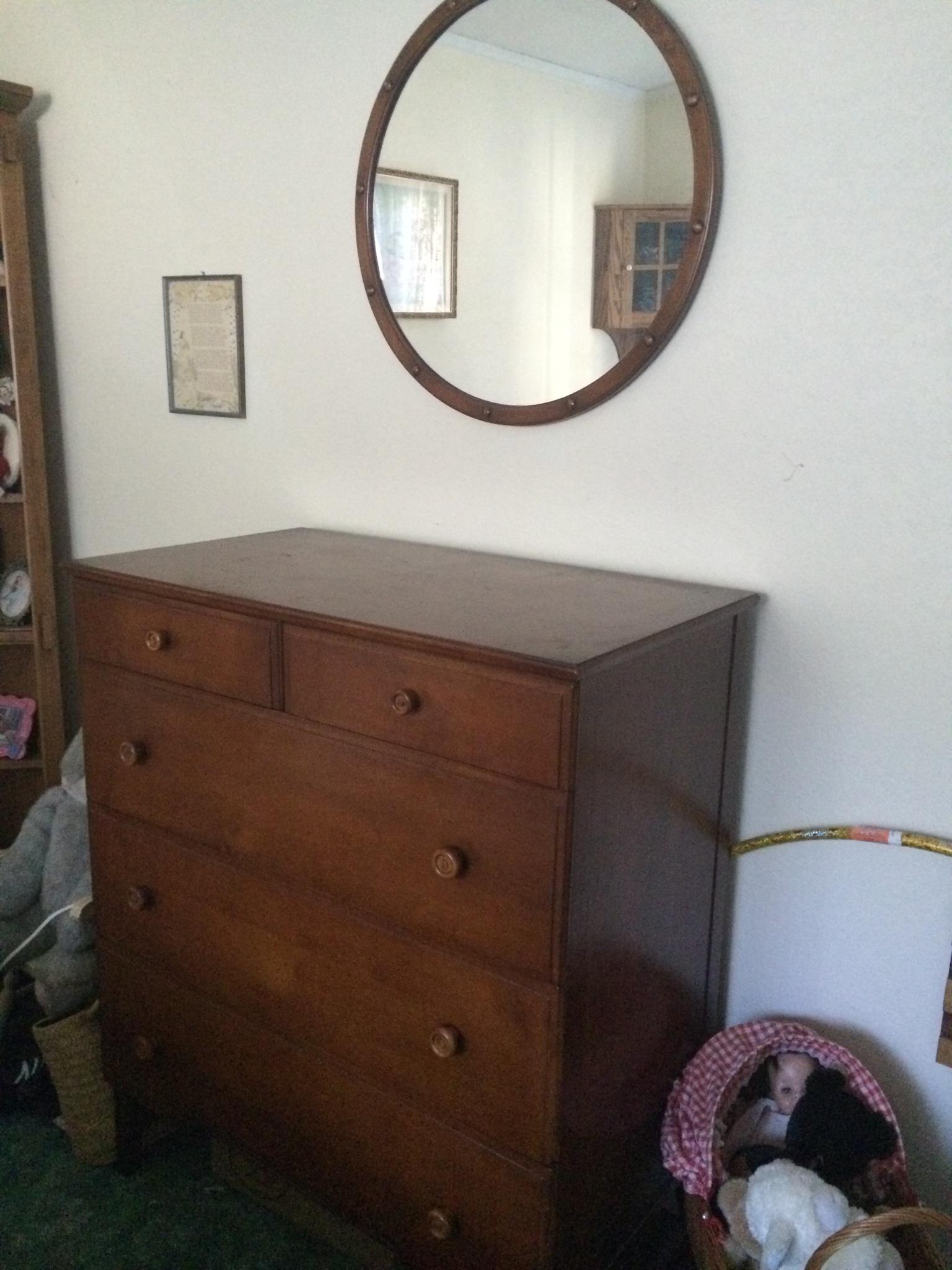 5 piece antique Stickley Bros. bedroom set in very excellent condition. Vanity with bench, Bed headboard and footboard, 5 drawer dresser and round mirror.