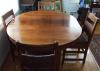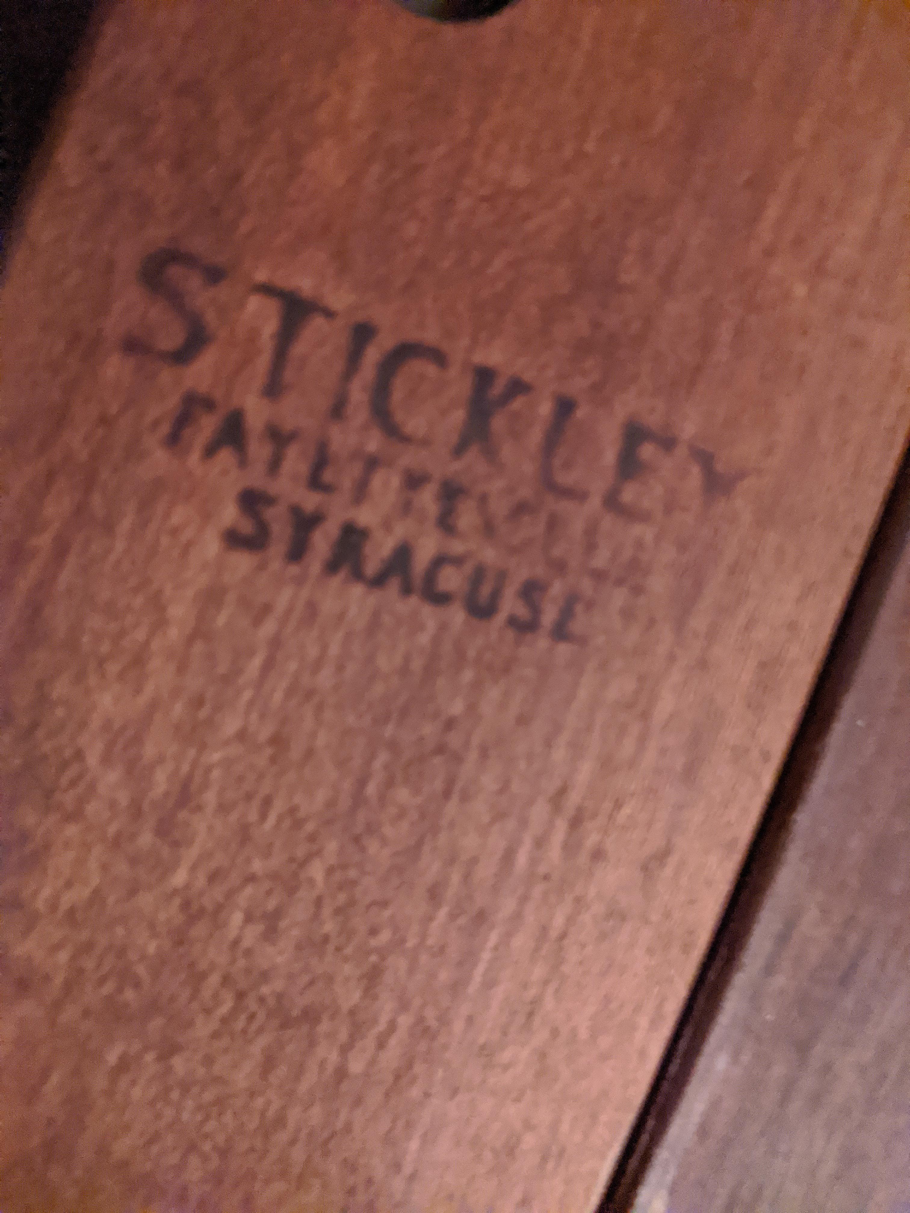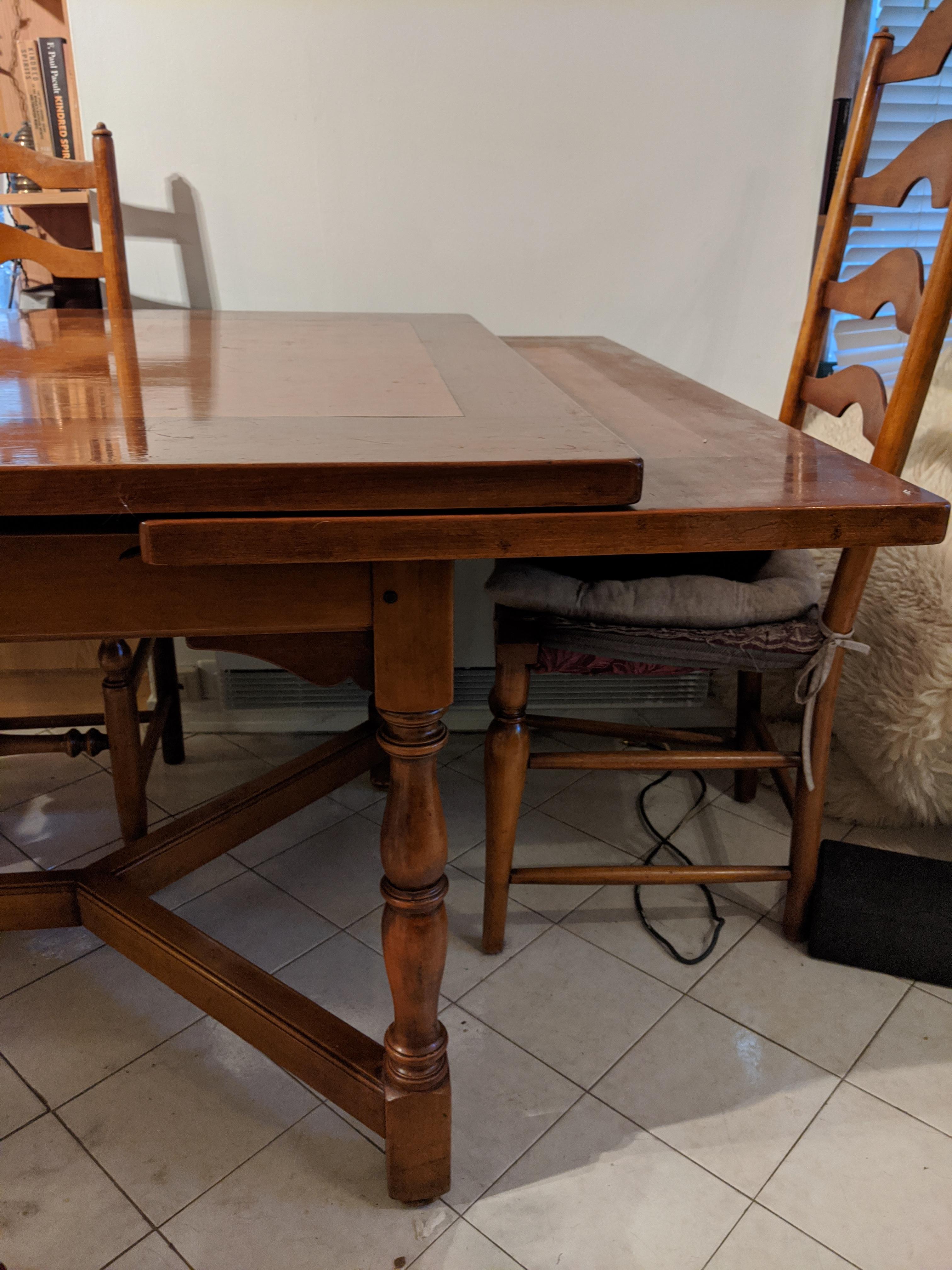 I have a Stickley dining table with 6 chairs. It has two attached leaves that swing out with a hinge mechanism. They are not removable. My family has had it as long as I've been alive, which puts it a minimum of pre-80s, though I believe it was bought used so it could be any age. It seems to be in the colonial style. The chairs have been covered, but they are cained. I can't find much about it. Any help?