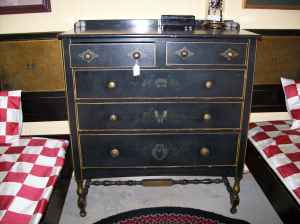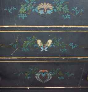 Black furniture paint with floral/butterfly design. Stickley logo sticker inside top drawer of bureau.