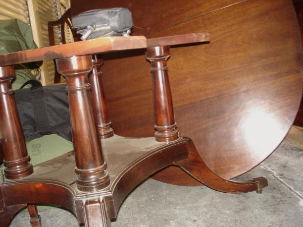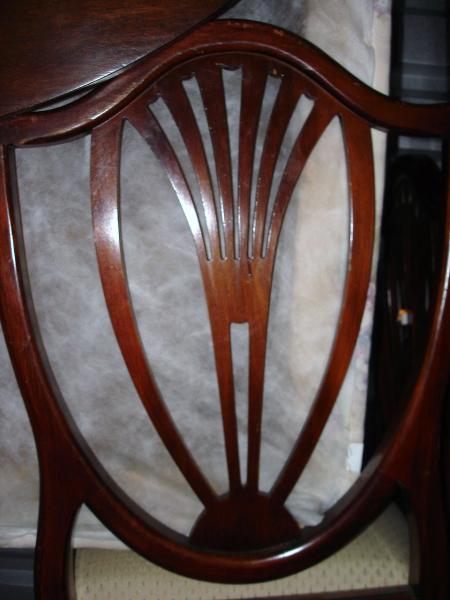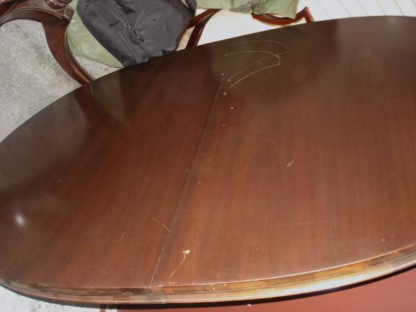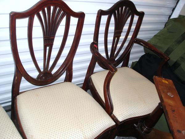 Six chairs total, two arm chairs. Table leaves, and pad included.