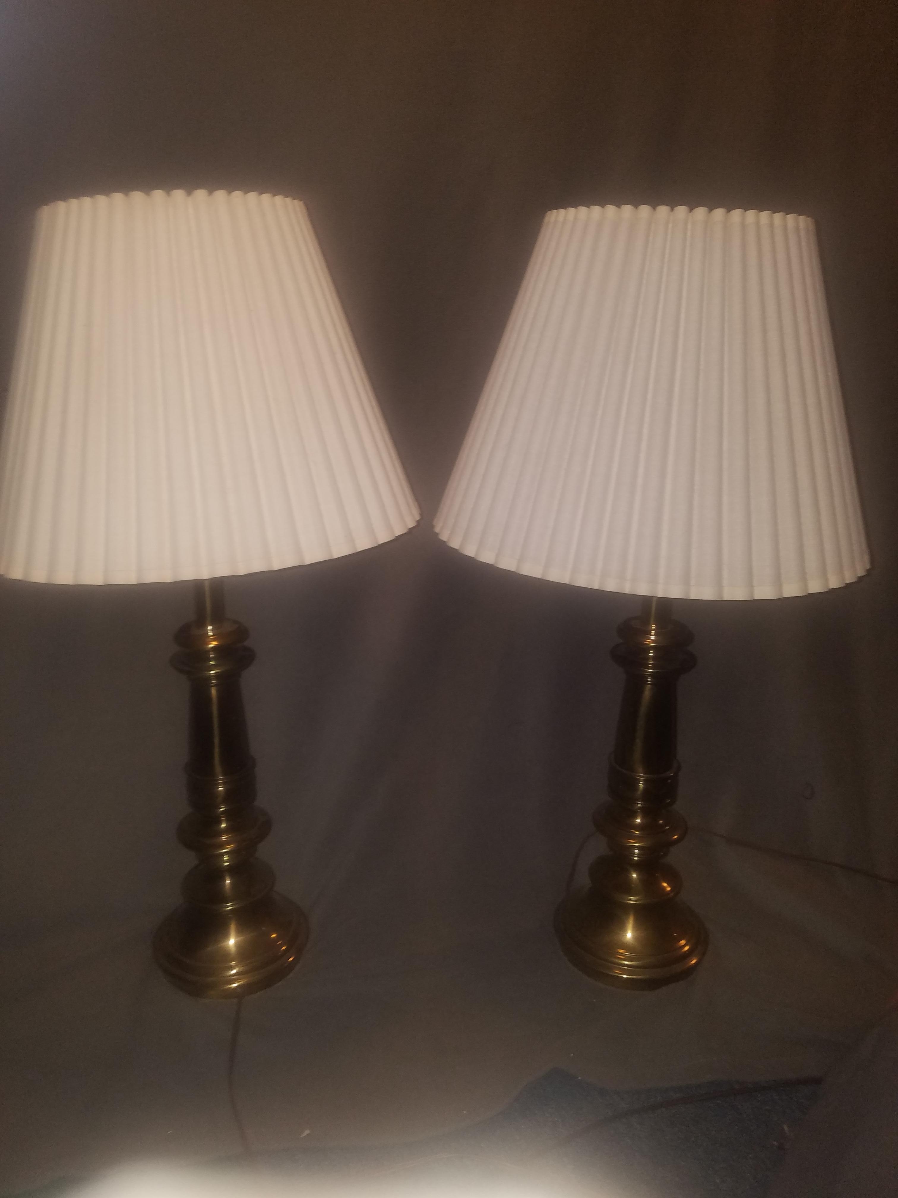 I have to stiffel Brass lamps they appear mid-century modern I believe with all original shades the original stickers have come off and I'm afraid to take apart or peel off the felting