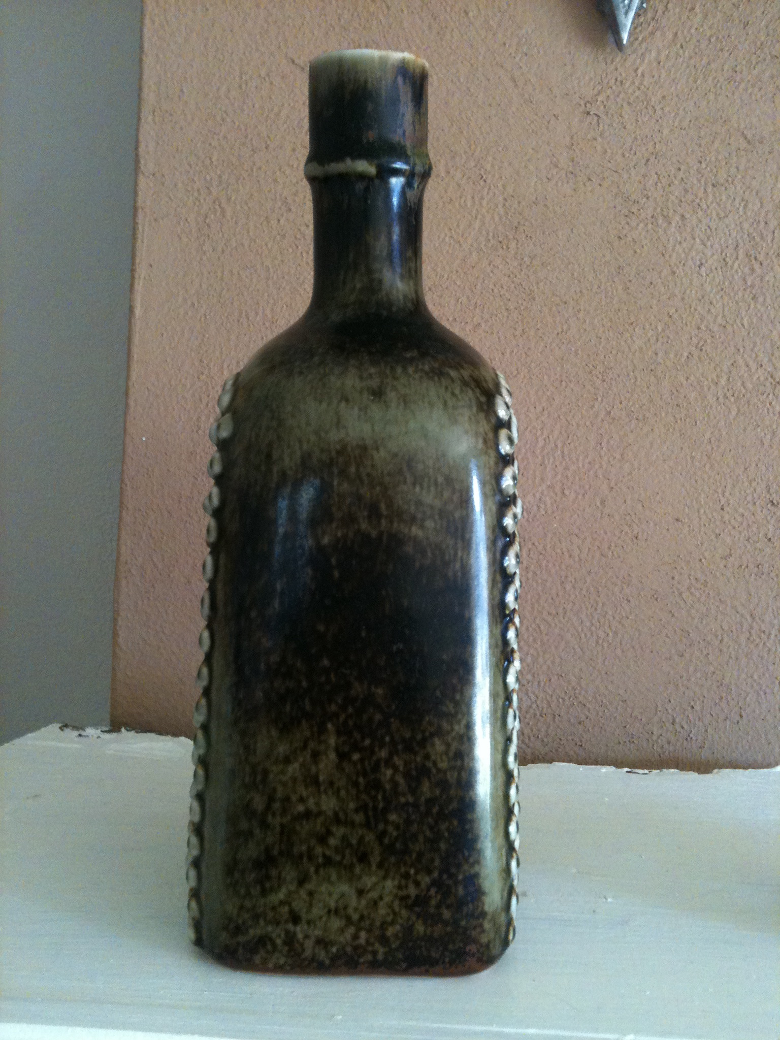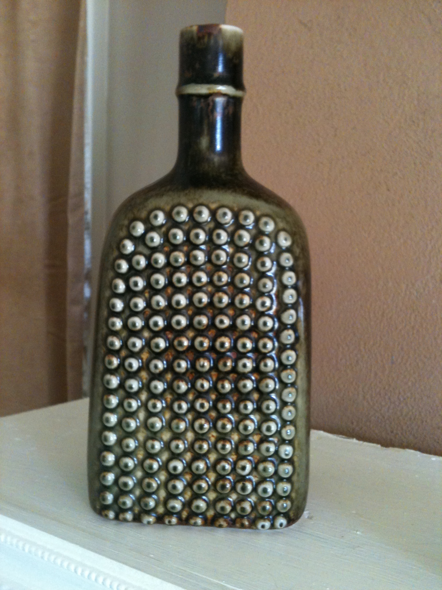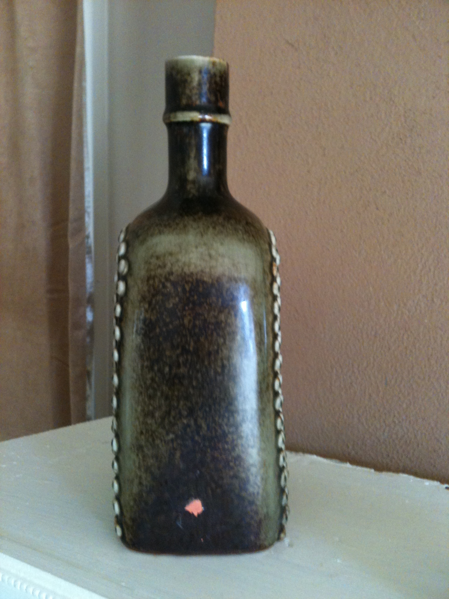 Nubby vase/bottle stands 10 inches tall, 4.5 inches deep and 3.5 inches deep. Has Stig Lindberg handprint on the bottom. There is a small pea-sized spot of peeling glaze near the bottom of one side. Otherwise, no damage.