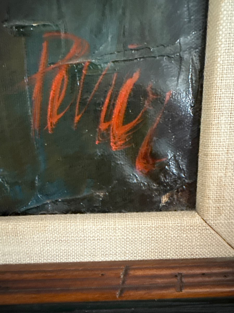 Condition Assessment: The painting is in fair condition, with some visible wear. The surface shows signs of cracking and minor paint loss, particularly around the edges. The frame has some scratches and scuffs, but it remains structurally sound. There are no signs of water damage or significant discoloration, which is a positive aspect for its age.