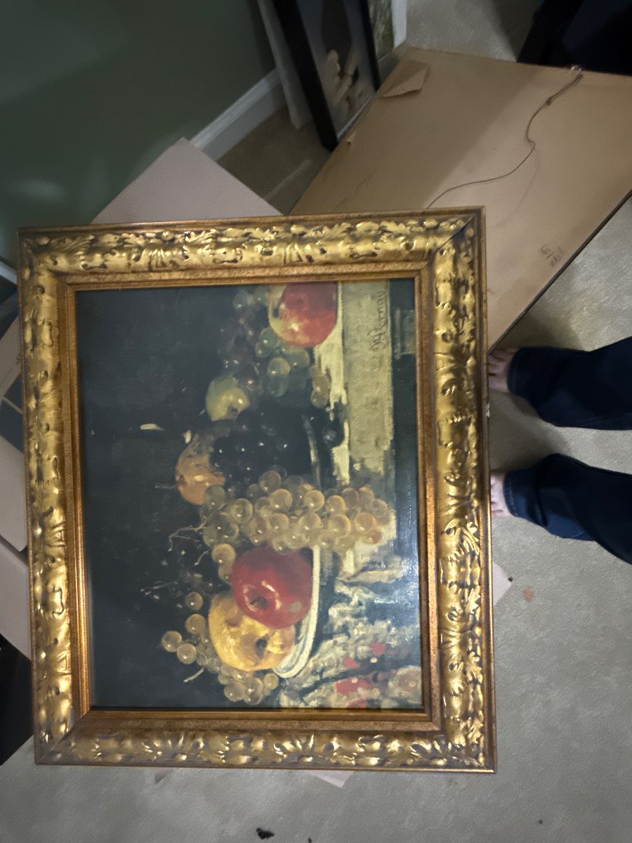 This appraisal covers a still life painting featuring fruit, signed by an artist with the name "J. Vernay." The painting is housed in an ornate, gilded frame.