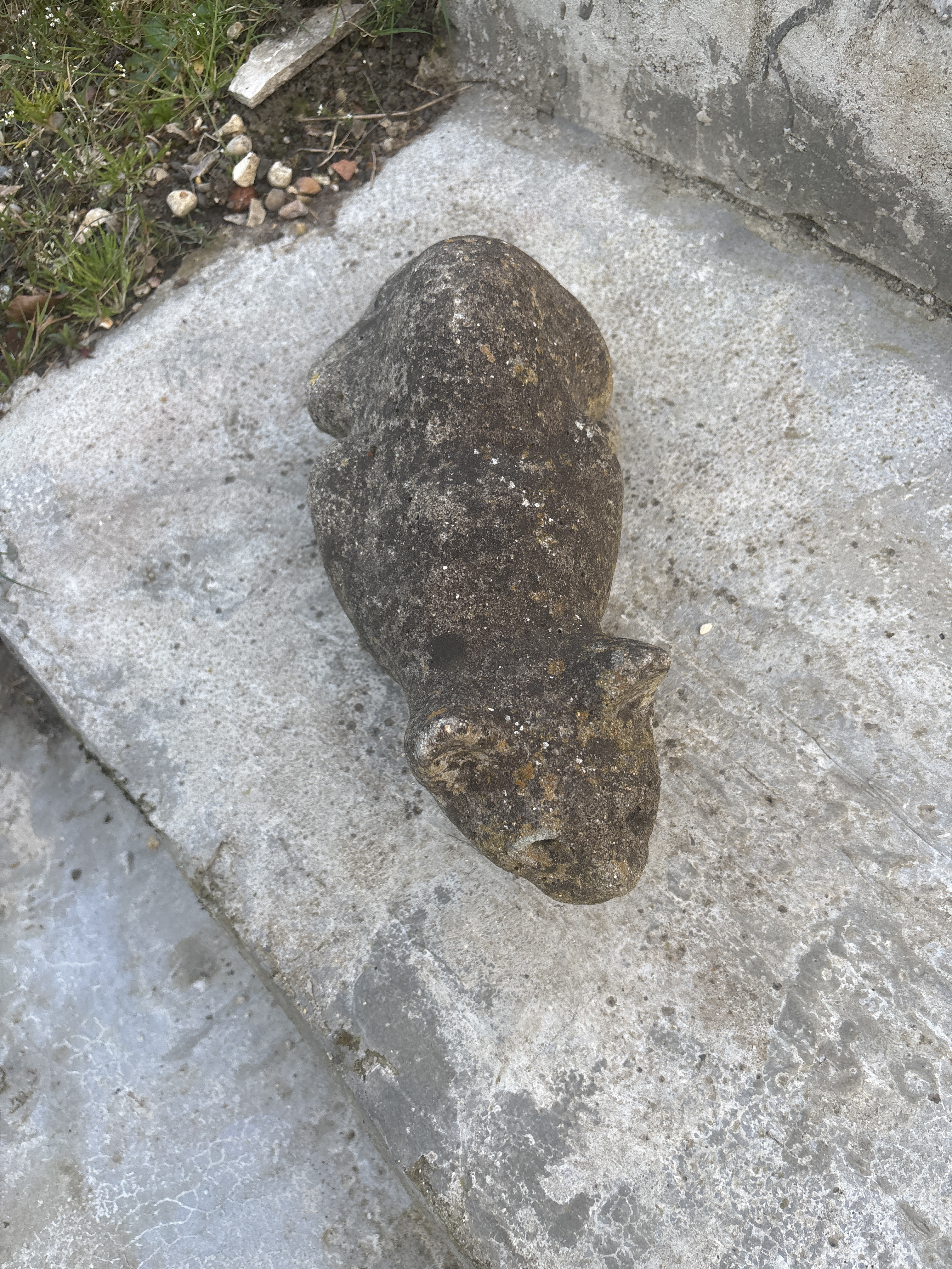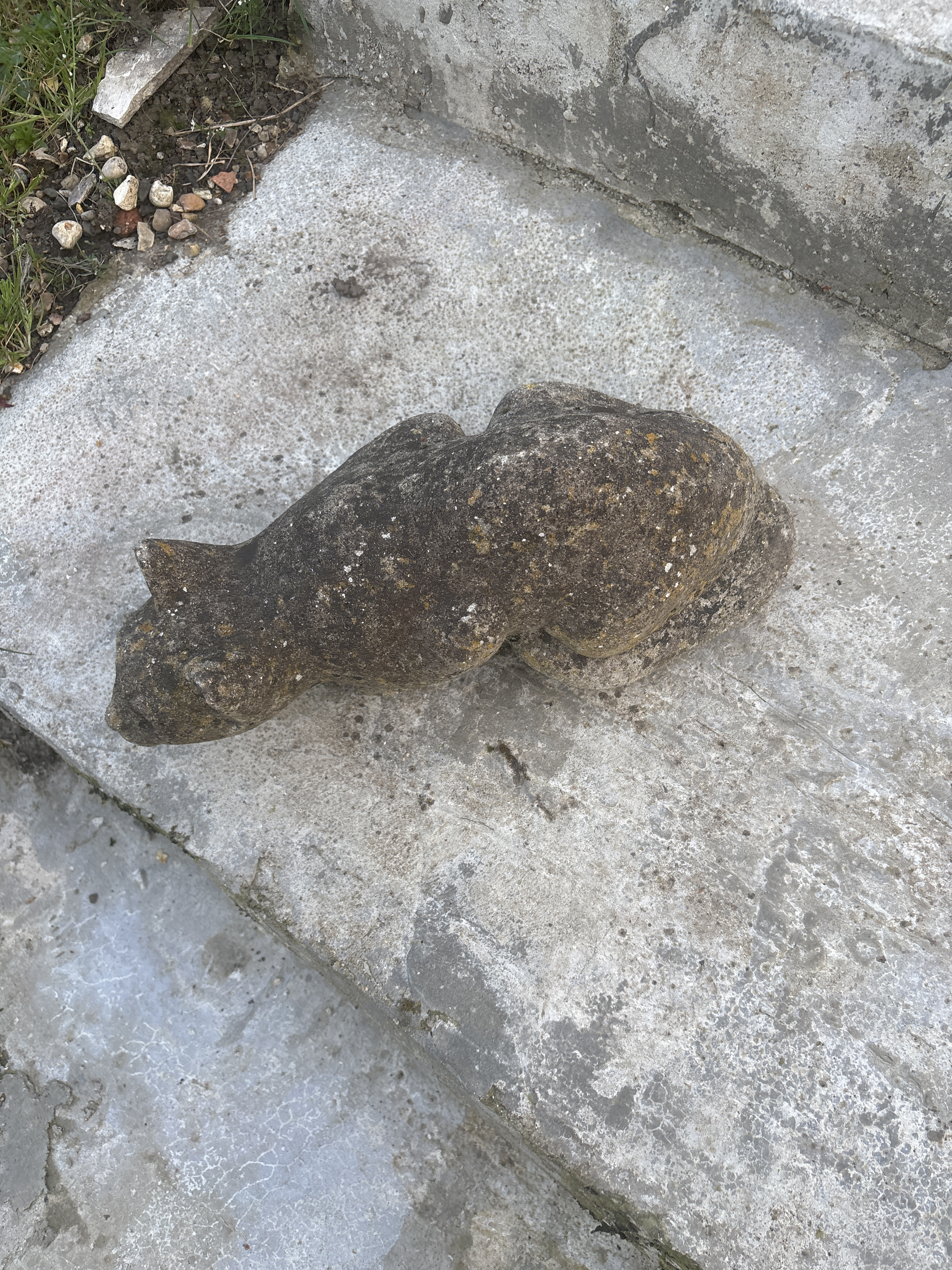 Stone Cat Figurine. Dating to 20th Century. Materials: Stone or concrete. Estimated value: $55 – $125. Condition: Good. The market for folk art and garden ornaments is stable with moderate demand.