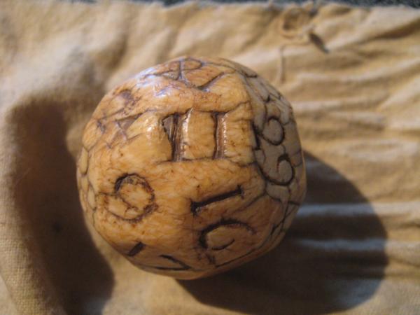 <p>Hi, Mbordoni: I have had a couple of these over the years. It is a single die, as you already guessed, for various "lotto" type games where they needed more than the six numbers of a normal die. The crown stamp stands for the number 1, so it really goes 1-32. I have another version of this with letters of the alphabet instead of numbers. Not sure what that's all about. Yours is definitely ivory, not stone. It is also most definitely English, made in England. (The word "six" carved IN ENGLISH next to the numeral 6 is one giveaway here. There's probably a word "nine" next to the 9, yes? To keep the numerals from being read upside-down. Probably at least 150 - 200 years old, maybe even older.</p><p> I collect all sorts of antique dice. I have bought and sold a few of these over the years for around $100 - 200 or so. Seems kinda cheap to me, but they tend to be inexpensive because so few people know what they are, so there are not a lot of collectors for them. However, if you ever do decide to sell it, I would be one buyer you could contact. I'm in the Denver area, (303) 650-6204.</p><p> Or, if you have an interest in antique dice or gaming pieces, you could call or e-mail me just to talk about them. I always enjoy meeting people with this obscure interest.</p><p> Best Regards, livinginthepast-tom</p>
