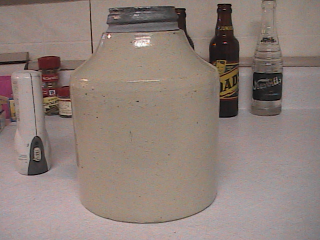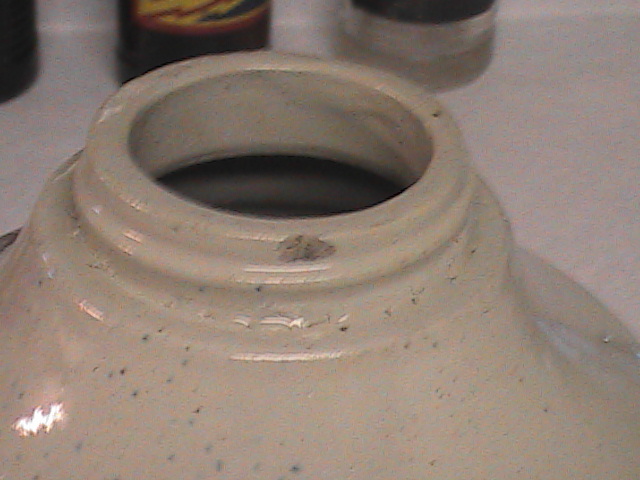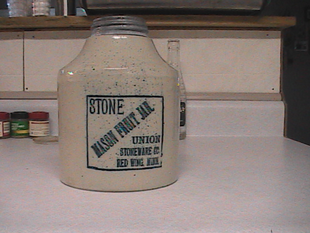 Item is a STONEWARE MASION FRUIT JAR UNION STONEWARE CO. RED WING, MINN. This is stamped on the side of the jar in blue lettering. The color of the jar is oatmeal with blue specks in it. It is a quart stoneware jar. The screw top has a slight chip. the bottom of the base has a small hairline crack toward the edge and on the flat bottom base has a dot, brown and hard like glass. Inside the jar in the bottom looks like a patch of the same material,towards the edge. Can you tell me if this came from the manufacture? had it filled with water ,never leaked.