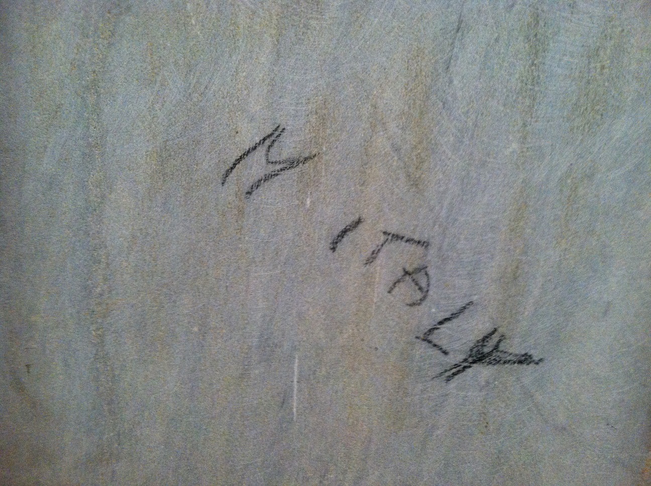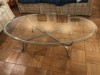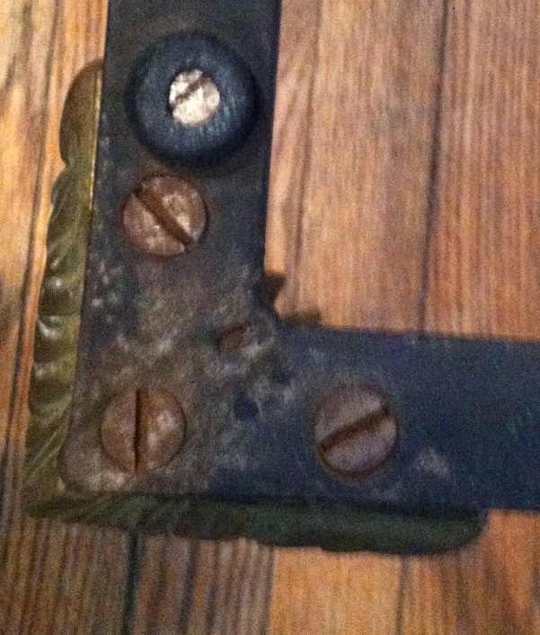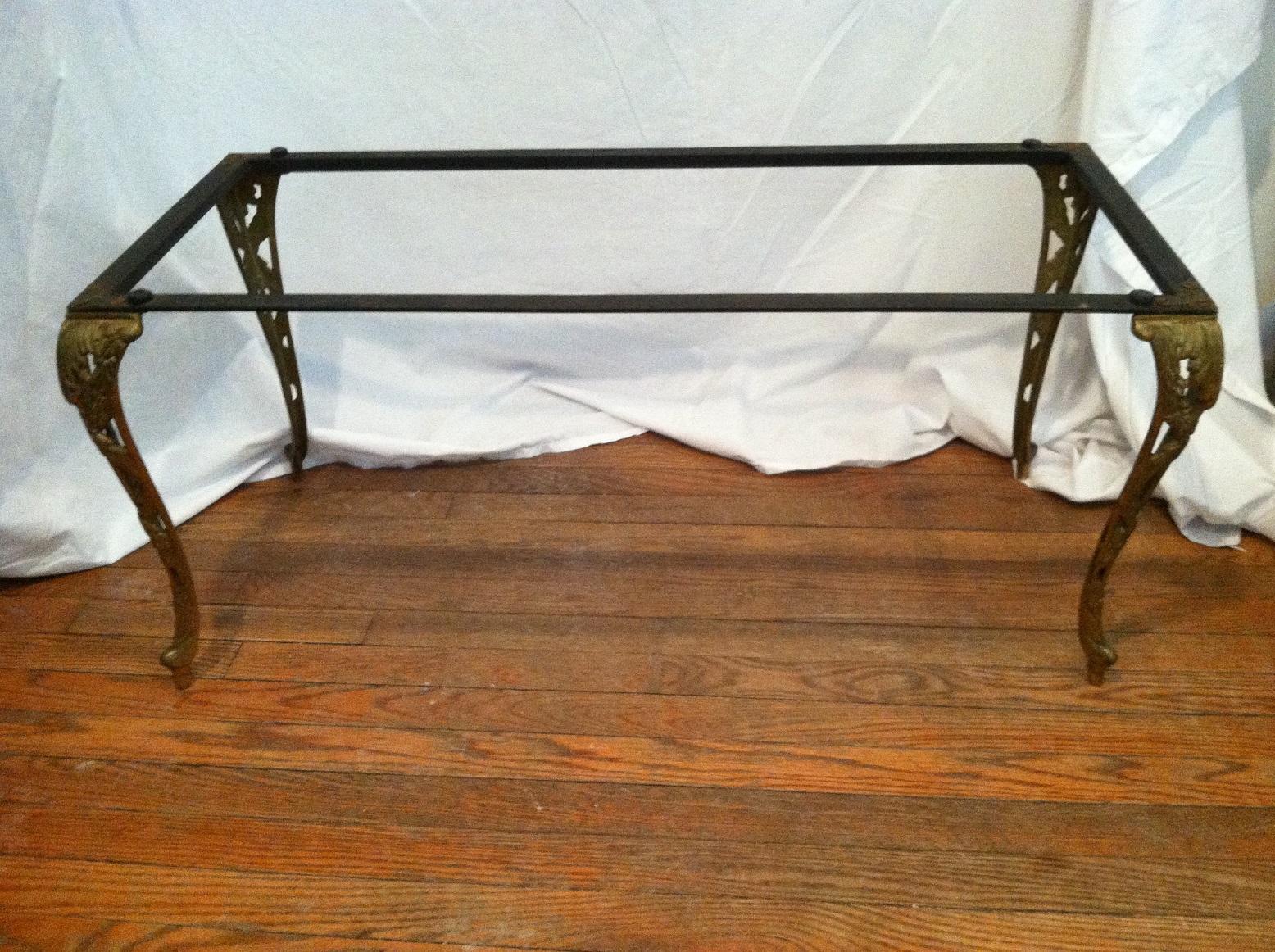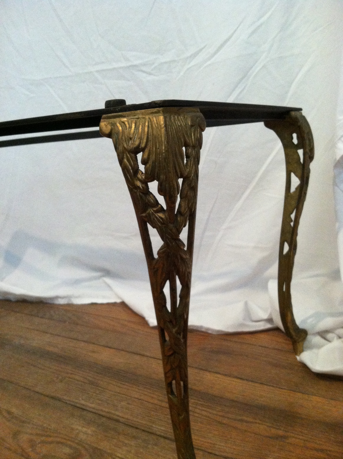 This table features a heavy, beveled slab of stone -- probably marble -- which is heavily veined in gold and black. It sits on top of a metal frame with curved brass legs molded with leaf shapes. The legs are fastened to the frame with three flat-head screws per corner. On the bottom, in black crayon, is hand-written: "M ITALY." The table is 39 inches long, 21 wide and 16 high. It has been in dry storage for at least 30 years. I would like to know when such a table would have been made, by whom, what this stone is, and of course, the fair market value, since I intend to resell it.