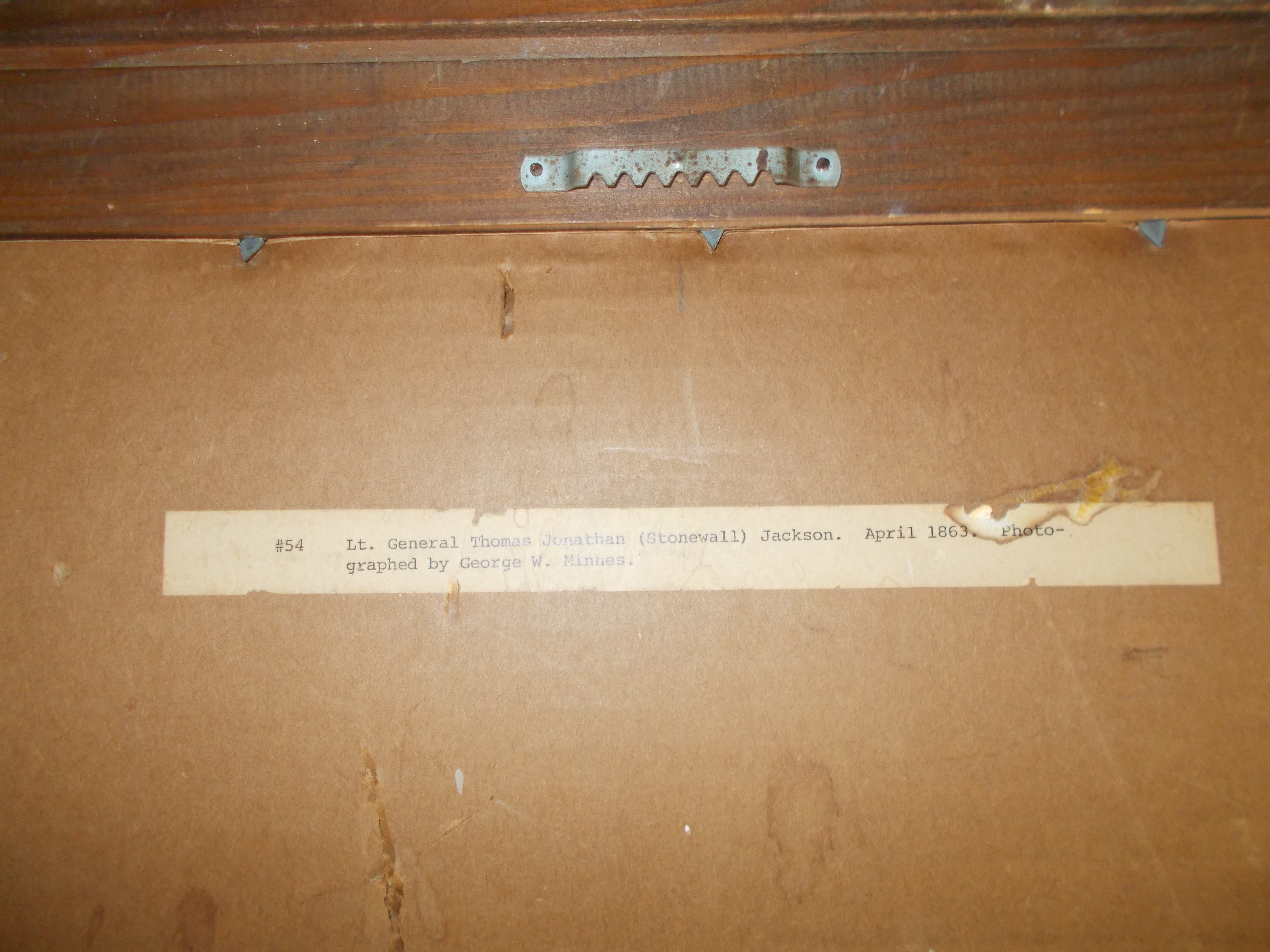 i have i believe to be an ambrotype of lt. general jonathan c.stone wall jackson taken april 1863 by george w.minnes of the minnes and crowell gallery number 54 it is called the chancerville photo it is 24x20 wood frame picture is 15x19 with burlap in frame been in family for years researched for years cant find any auctions that have handeled one or collector thats had one been led to believe they were made before the turn of the century.