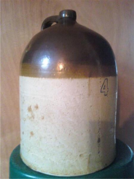 This item is a stoneware / pottery jug used for some liquid, in good condition. It has a blue "4" on the side which I believe represents 4 gallons, judging by it's size. It is dark brown on top with a lighter brown ring and then beige bottom. It has a small handle on top like an old moonshine jug.